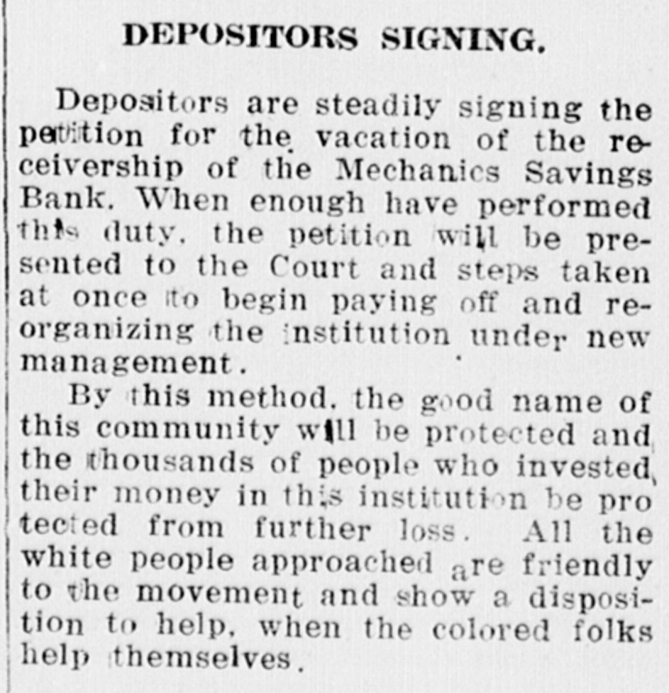 This then will necessarily end the delay as the Receivers have been unofficially reported to be in favor of re-opening the Bank and willing to do all in their power to help the colored people of this community. The issue is plain. Personal feeling and animosities should not figure in this matter. Let us re-open the Mechanics Savings Bank in order that those depositors who are urgently in need of some of their money may be able to get it and those who wish to deposit their savings may be permitted so to do. The depositors stand pledged not to make any run on the Bank