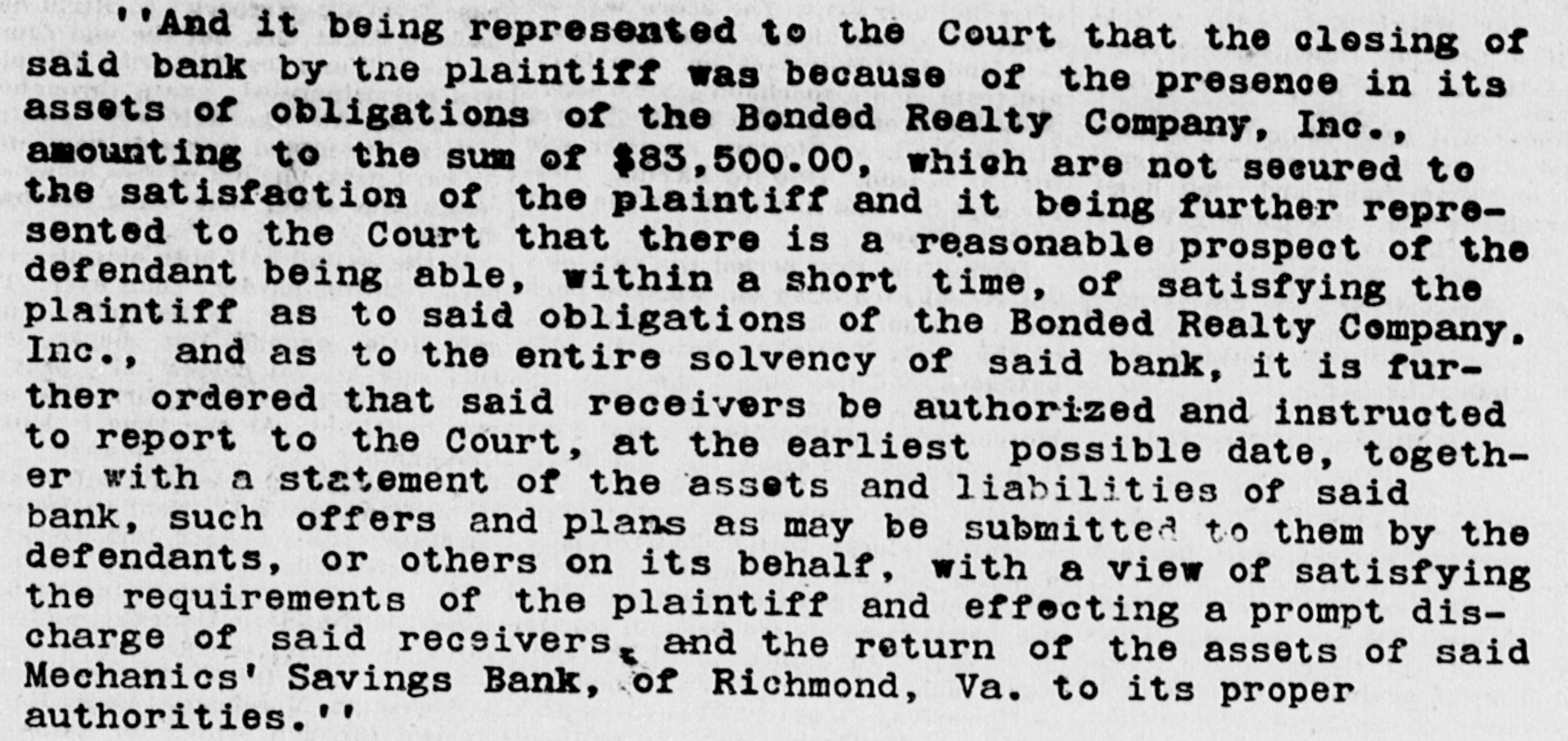 ' 'And it being represented to the Court that the clesing of said bank by the plaintiff was because of the presence in its assets of obligations of the Bonded Realty Company, Inc., amounting to the sum of $83,500.00, which are not secured to the satisfaction of the plaintiff and it being further represented to the Court that there is a reasonable prospect of the defendant being able, within a short time, of satisfying the plaintiff as to said obligations of the Bonded Realty Company. Inc., and as to the entire solvency of said bank, it is further ordered that said receivers be authorized and instructed to report to the Court, at the earliest possible date, together with a statement of the assets and liabilities of said bank, such offers and plans as may be submitted to them by the defendants, or others on its behalf, with a view of satisfying the requirements of the plaintiff and effecting a prompt discharge of said receivers. and the return of the assets of said Mechanics' Savings Bank, of Richmond, Va. to its proper authorities.''