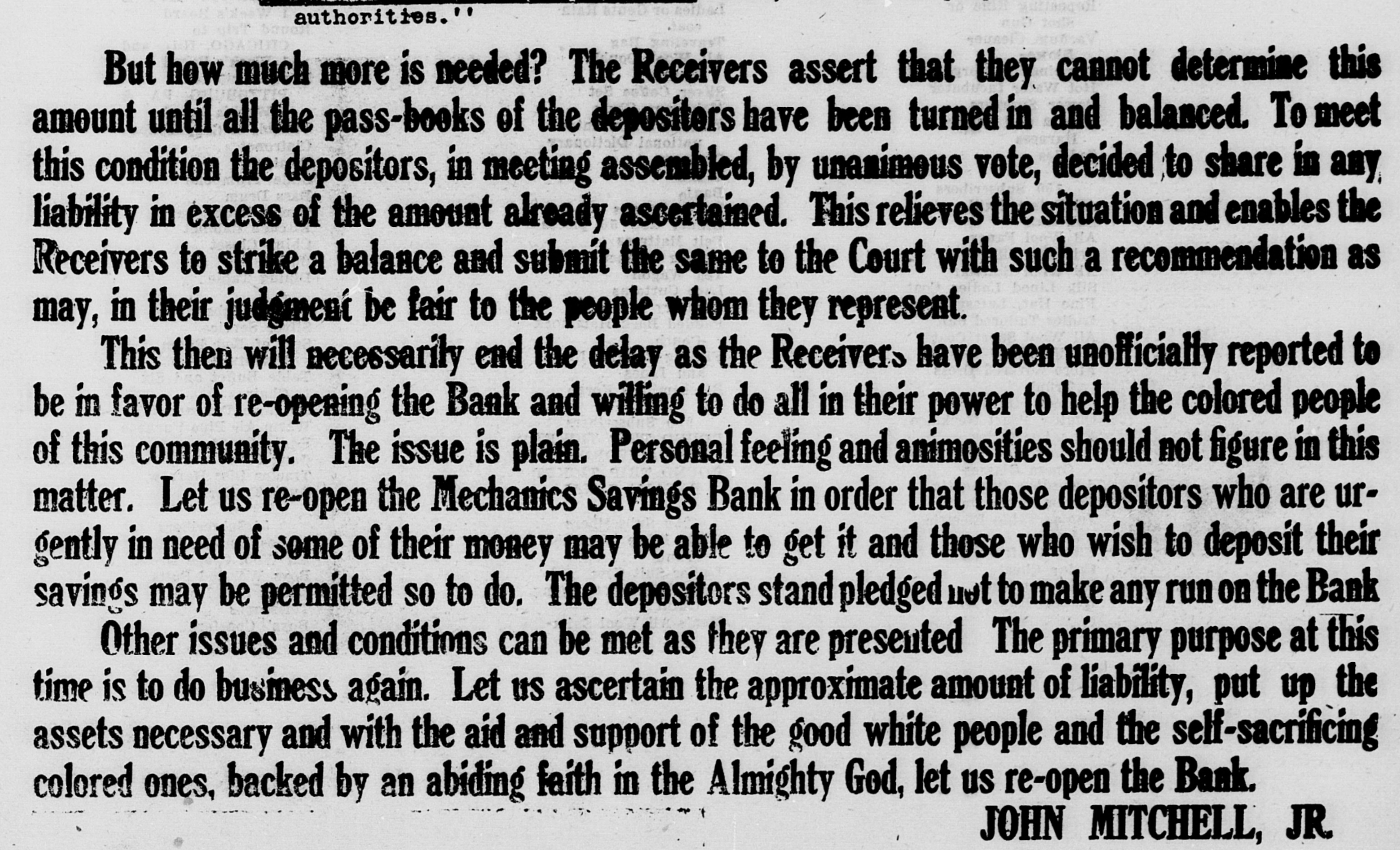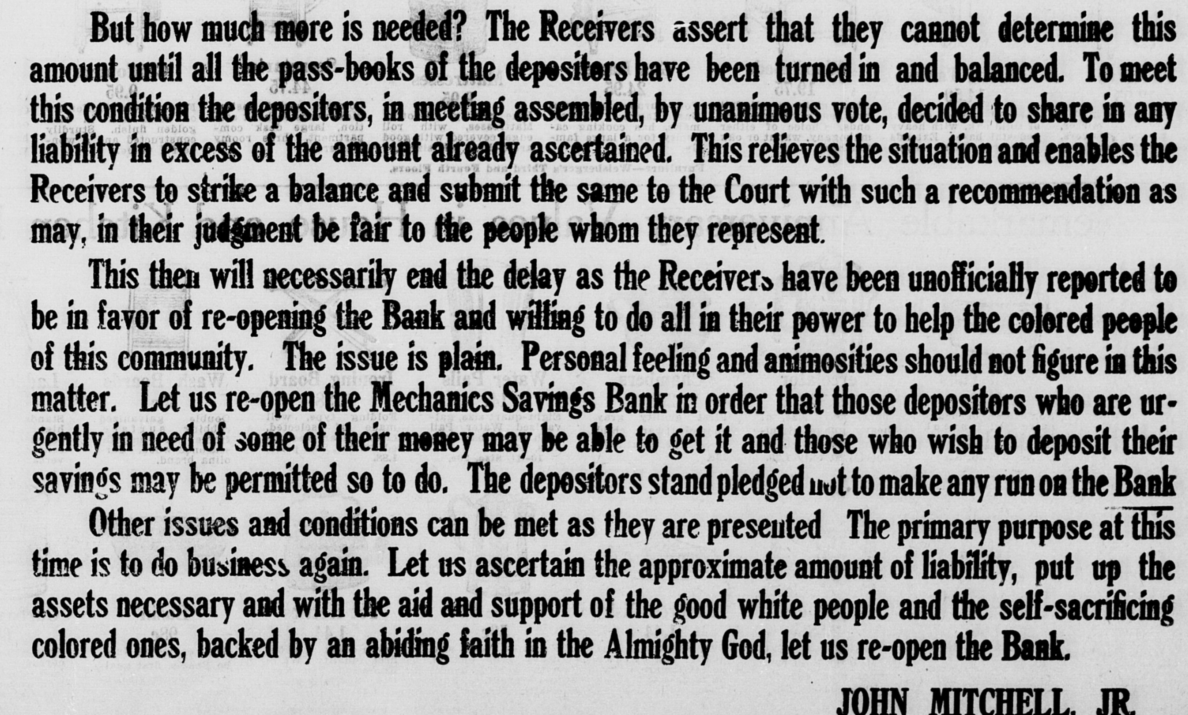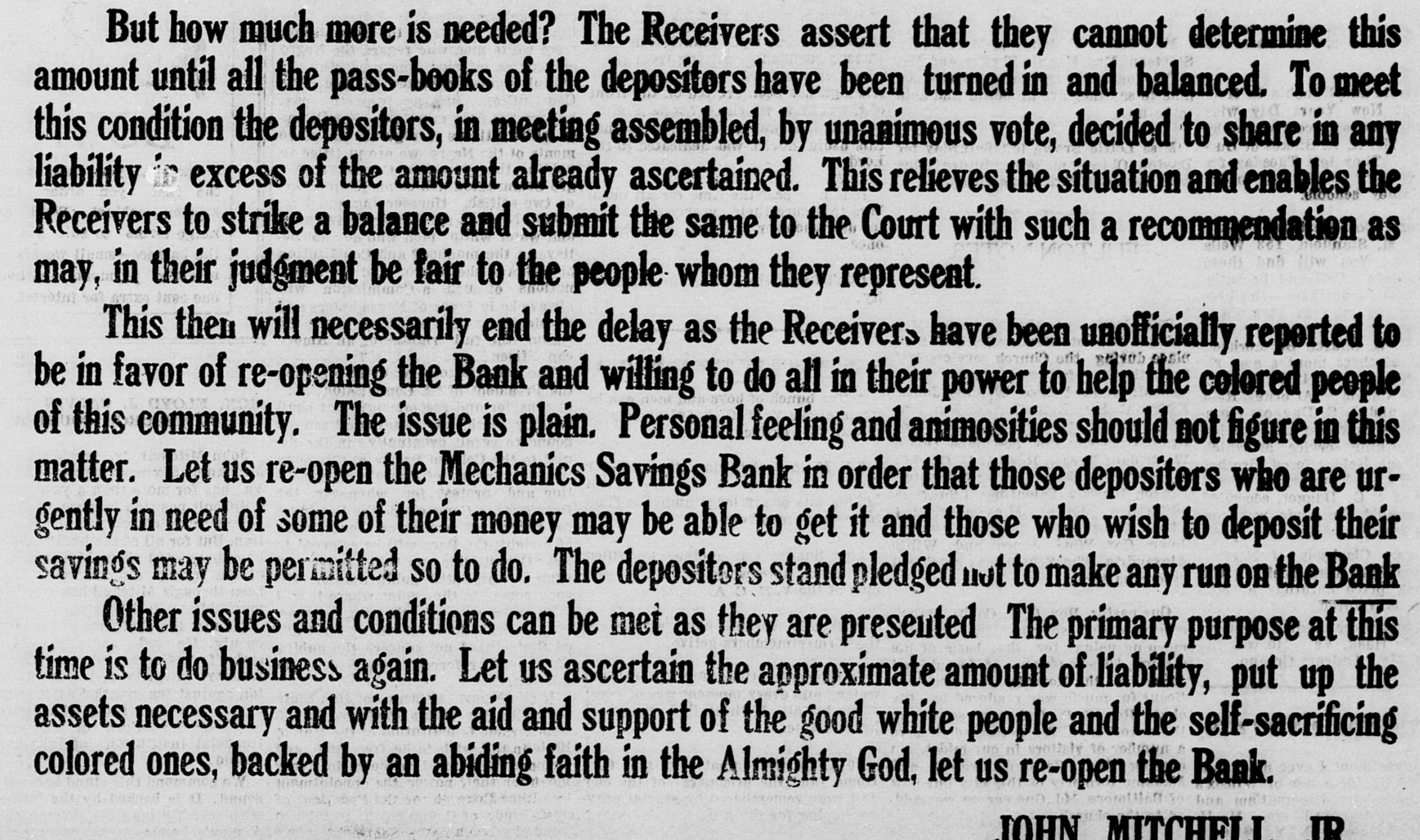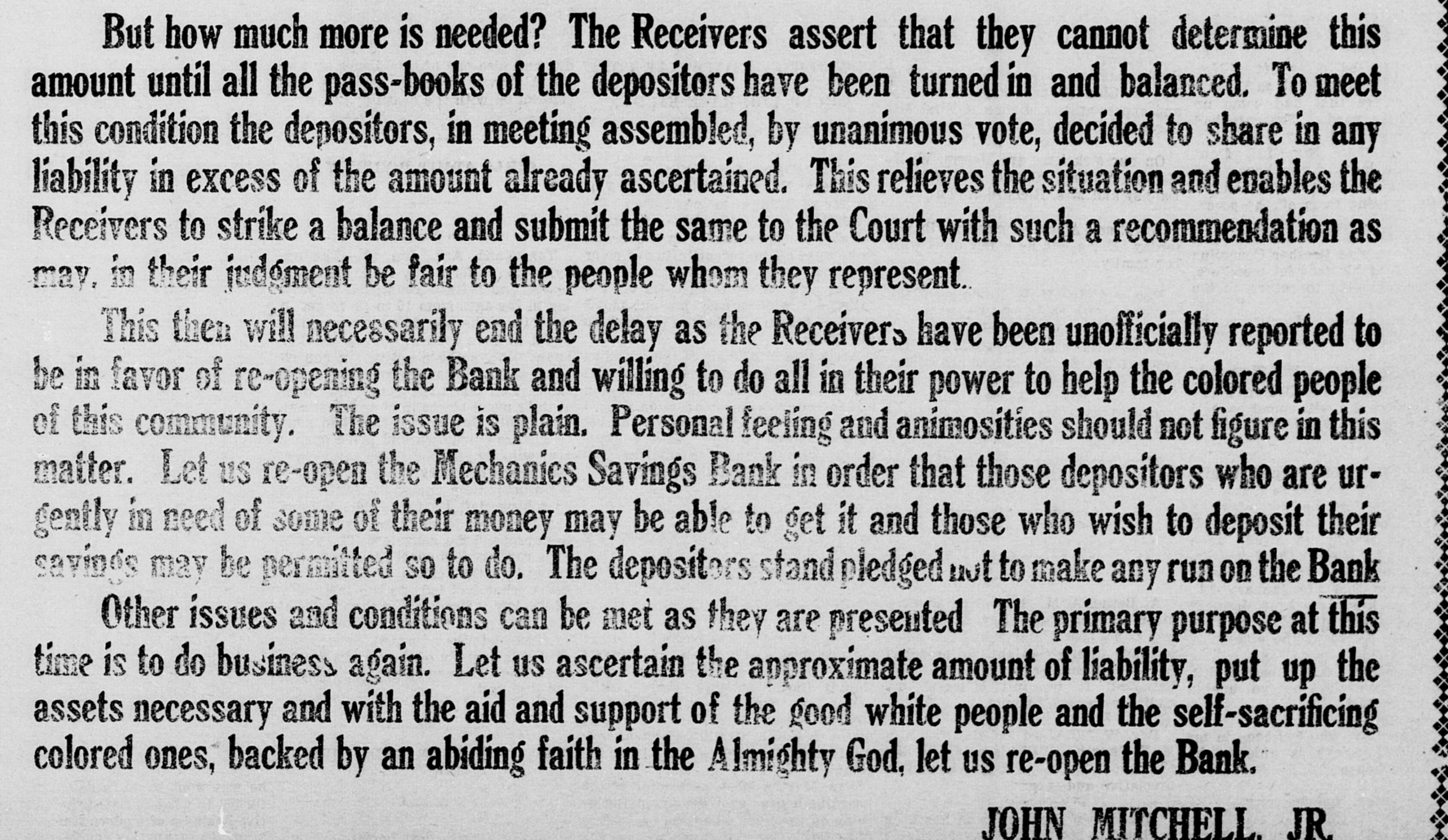 But how much more is needed? The Receivers assert that they cannot determine this amount until all the pass-books of the depositors have been turned in and balanced. To meet this condition the depositors, in meeting assembled, by unanimous vote, decided to share in any liability in excess of the amount already ascertained. This relieves the situation and enables the Receivers to strike a balance and submit the same to the Court with such a recommendation as may, in their judgment be fair to the people whom they represent. This then will necessarily end the delay as the Receivers have been unofficially reported to be in favor of re-opening the Bank and willing to do all in their power to help the colored people of this community. The issue is plain. Personal feeling and animosities should not figure in this matter. Let us re-open the Mechanics Savings Bank in order that those depositors who are urgently in need of some of their money may be able to get it and those who wish to deposit their savings may be permitted SO to do. The depositors stand pledged not to make any run on the Bank Other issues and conditions can be met as they are presented The primary purpose at this time is to do business again. Let us ascertain the approximate amount of liability, put up the assets necessary and with the aid and support of the good white people and the self-sacrificing colored ones, backed by an abiding faith in the Almighty God, let us re-open the Bank. JOHN MITCHELL, JR.