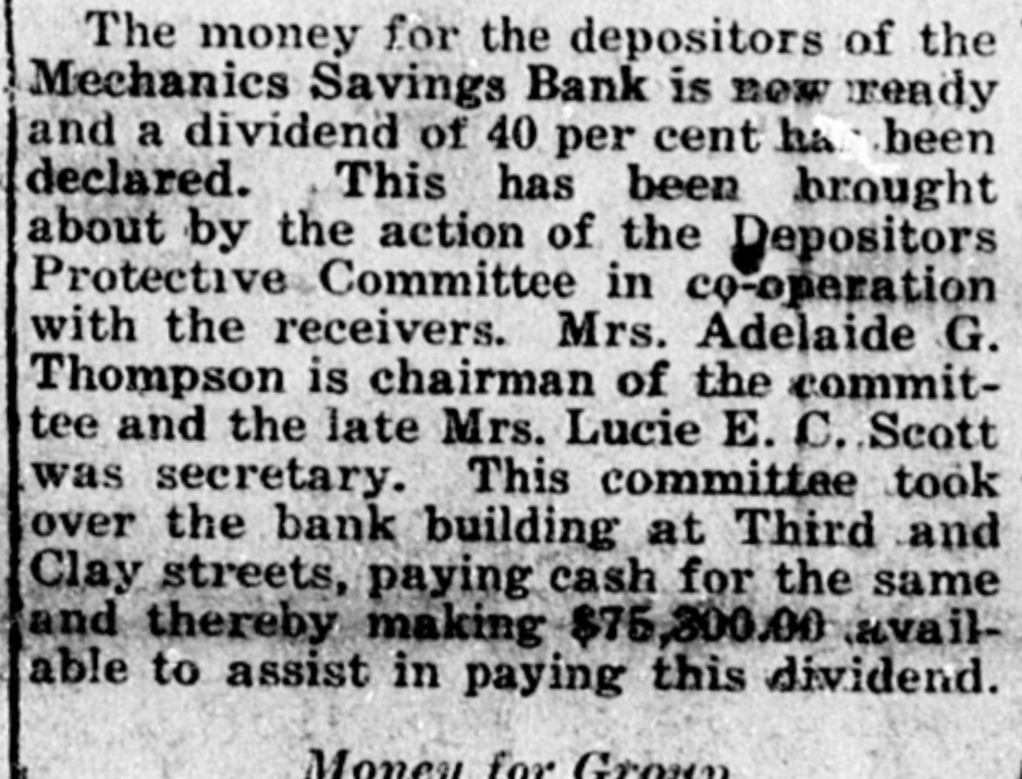 The money for the depositors of the Mechanics Savings Bank is new ready and a dividend of 40 per cent ha been declared. This has been brought about by the action of the Depositors Protective Committee in co-operation with the receivers. Mrs. Adelaide G. Thompson is chairman of the committee and the late Mrs. Lucie E. C. Scott was secretary. This committee took over the bank building at Third and Clay streets, paying cash for the same and thereby making $75,300.00 available to assist in paying this dividend. Money for Grown