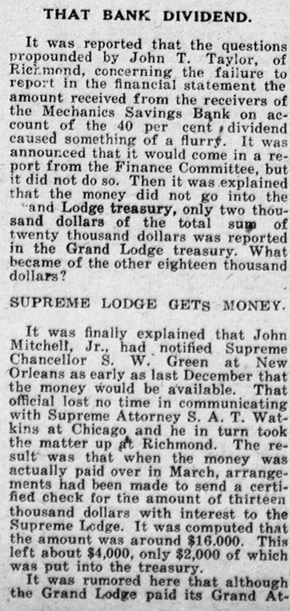 It was reported that the questions propounded by John T. Taylor, of Richmond, concerning the failure to report in the financial statement the amount received from the receivers of the Mechanics Savings Bank on account of the 40 per cent dividend caused something of a flurry. It was announced that it would come in a report from the Finance Committee, but it did not do so. Then it was explained that the money did not go into the "and Lodge treasury, only two thousand dollars of the total sum of twenty thousand dollars was reported in the Grand Lodge treasury. What became of the other eighteen thousand dollars?
