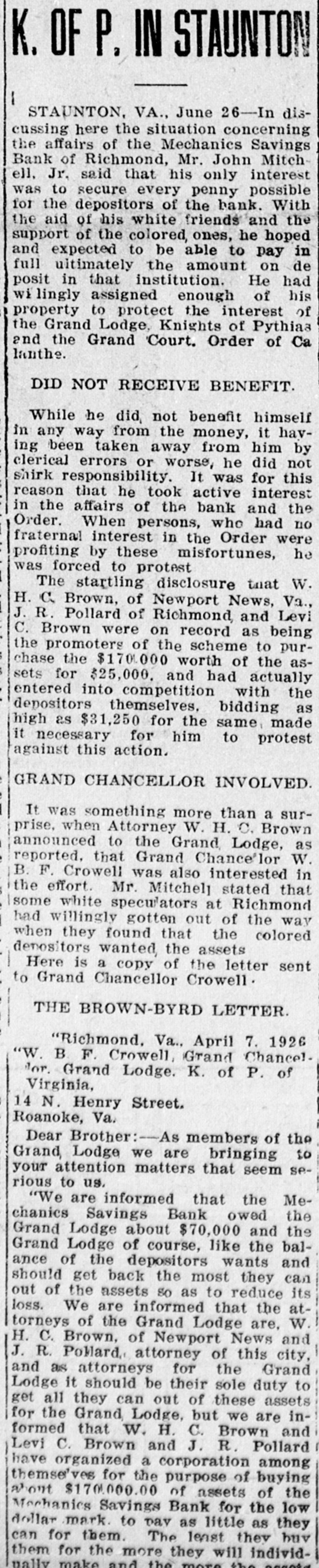 K. OF P. IN STAUNTON I STAUNTON, VA., June 26-In diacussing here the situation concerning the affairs of the Mechanics Savings Bank of Richmond, Mr. John Mitch ell, Jr. said that his only interest was to secure every penny possible for the depositors of the bank. With the aid of his white friends and the support of the colored, ones, he hoped and expected to be able to pay in full ultimately the amount on de posit in that institution. He had villingly assigned enough of his property to protect the interest of the Grand Lodge, Knights of Pythiaa and the Grand Court. Order of Ca lanthe. DID NOT RECEIVE BENEFIT. While he did, not benefit himself in any way from the money, it having been taken away from him by clerical errors or worse, he did not shirk responsibility. It was for this reason that he took active interest in the affairs of the bank and the Order. When persons, who had no fraternal interest in the Order were profiting by these misfortunes, he was forced to protest The startling disclosure that W. H. C. Brown, of Newport News, Va., J. R. Pollard of Richmond, and Levi C. Brown were on record as being the promoters of the scheme to purchase the $170.000 worth of the assets for $25,000. and had actually entered into competition with the depositors themselves. bidding as high as $31,250 for the same, made it necessary for him to protest against this action. GRAND CHANCELLOR INVOLVED. It was something more than a surprise. when Attorney W. H. C. Brown announced to the Grand Lodge, as reported, that Grand Chance'lor W. B. F. Crowell was also interested in the effort. Mr. Mitchel] stated that some white speculators at Richmond had willingly gotten out of the way when they found that the colored depositors wanted the assets Here is a copy of the letter sent to Grand Chancellor Crowell THE BROWN-BYRD LETTER. "Richmond. Va.. April 7. 1926 "W. B F. Crowell, Grand Chance! for Grand Lodge. K. of P. of Virginia, 14 N. Henry Street. Roanoke, Va. Dear Brother:- members of the Grand Lodge we are bringing to your attention matters that seem serious to us. "We are informed that the Mechanics Savings Bank owed the Grand Lodge about $70,000 and the Grand Lodge of course, like the balance of the depositors wants and should get back the most they can out of the assets so as to reduce its loss. We are informed that the attorneys of the Grand Lodge are, W. H. C. Brown, of Newport News and J. R. Pollard, attorney of this city, and as attorneys for the Grand Lodge it should be their sole duty to get all they can out of these assets for the Grand Lodge, but we are informed that W. H. C. Brown and Levi C. Brown and J. R. Pollard have organized a corporation among themse'ves for the purpose of buying about $170.000.00 of assets of the Mechanics Savings Bank for the low dollar mark. to Day as little as they can for them. The least they huv them for the more they will individnally make and the more the accord