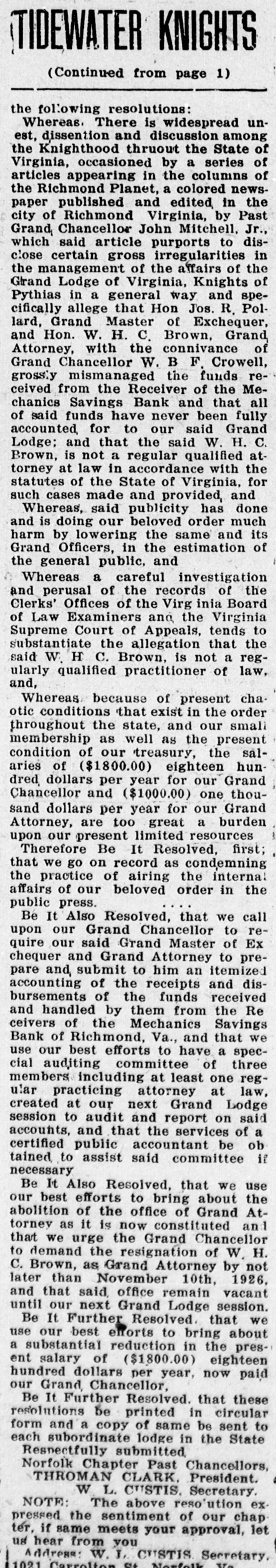 Whereas. There is widespread unrest, dissention and discussion among the Knighthood thruout the State of Virginia, occasioned by a series of articles appearing in the columns of the Richmond Planet, a colored newspaper published and edited in the city of Richmond Virginia, by Past Grand Chancellor John Mitchell, Jr., which said article purports to disclose certain gross irregularities in the management of the affairs of the Grand Lodge of Virginia, Knights of Pythias in a general way and specifically allege that Hon Jos. R. Pollard, Grand Master of Exchequer, and Hon. W. H. C. Brown, Grand Attorney, with the connivance of Grand Chancellor W. B F. Crowell, grossly mismanaged the funds received from the Receiver of the Mechanics Savings Bank and that all of said funds have never been fully accounted for to our said Grand Lodge; and that the said W. H. C. Brown, is not a regular qualified attorney at law in accordance with the statutes of the State of Virginia, for such cases made and provided, and