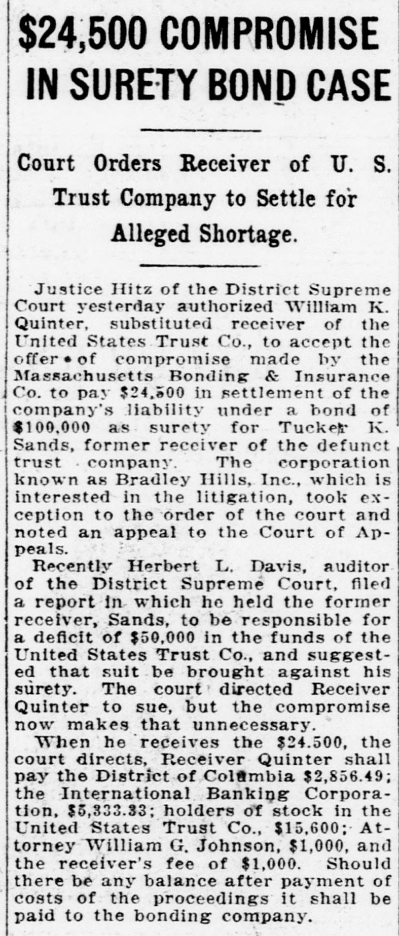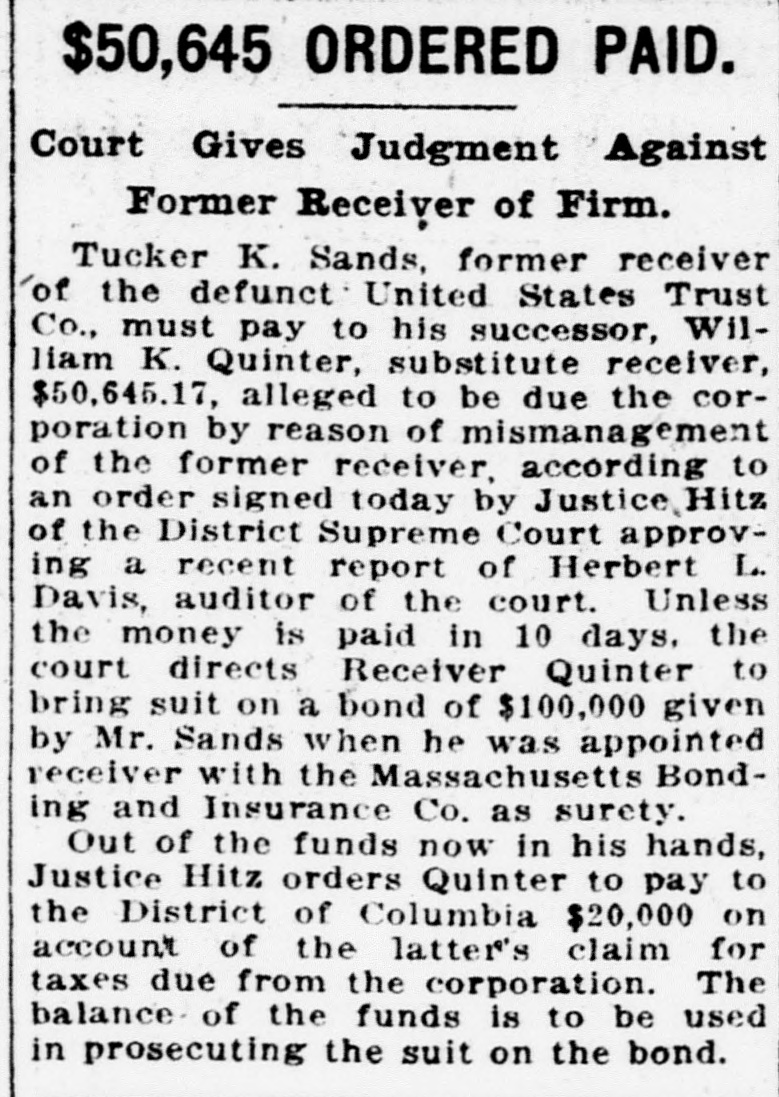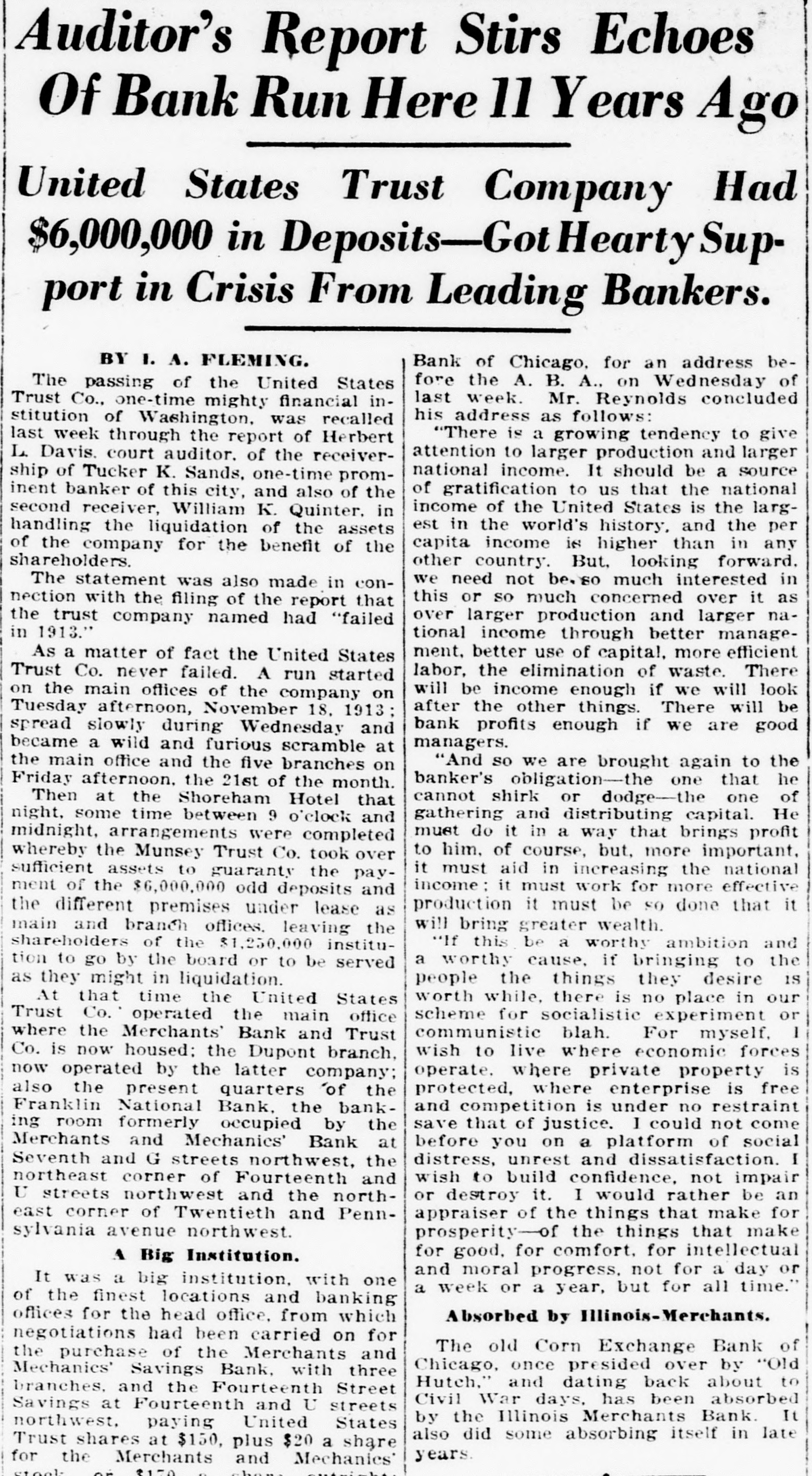 Auditor's Report Stirs Echoes Of Bank Run Here 11 Years Ago United States Trust Company Had $6,000,000 in Deposits-Gotl Hearty Support in Crisis From Leading Bankers. BY 1. A. FLEMING. Bank of Chicago, for an address before the A. B. A., on Wednesday of The passing of the United States last week. Mr. Reynolds concluded Trust Co., one-time mighty financial inhis address as follows: stitution of Washington, was recalled "There is a growing tendency to give last week through the report of Herbert attention to larger production and larger L. Davis. court auditor. of the receivernational income. It should be a source ship of Tucker K. Sands, one-time promof gratification to us that the national inent banker of this city, and also of the income of the United States is the largsecond receiver, William K. Quinter, in est in the world's history. and the per handling the liquidation of the assets capital income is higher than in any of the company for the benefit of the shareholders. other country. But, looking forward. we need not be. so much interested in The statement was also made in conthis or so much concerned over it as nection with the filing of the report that over larger production and larger nathe trust company named had "failed in 1913. tional income through better management. better use of capital, more efficient As a matter of fact the United States labor, the elimination of waste. There Trust Co. never failed. A run started will be income enough if we will look on the main offices of the company on after the other things. There will be Tuesday afternoon, November 18. 1913; bank profits enough if we are good spread slowly during Wednesday and managers. became a wild and furious scramble at "And so we are brought again to the the main office and the five branches on banker's obligation-the one that he Friday afternoon. the 21st of the month. cannot shirk or dodge-the one of Then at the Shoreham Hotel that gathering and distributing capital. He night, some time between 9 o'clock and muet do it in a way that brings profit midnight, arrangements were completed to him, of course, but, more important, whereby the Munsey Trust Co. took over it must aid in increasing the national sufficient assets to guaranty the payincome: it must work for more effective ment of the $6,000,000 odd deposits and production it must be so done that it the different premises under lease as will bring greater wealth. main and branch offices. leaving the "If this be a worthy ambition and shareholders of the $1,250,000 institua worthy cause, if bringing to the tion to go by the board or to be served people the things they desire IS as they might in liquidation. At that time the United States worth while. there is no place in our Trust Co. operated the main office scheme for socialistic experiment or where the Merchants' Bank and Trust communistic blah. For myself. wish to live where economic forces Co. is now housed; the Dupont branch, operate. where private property is now operated by the latter company; protected, where enterprise is free also the present quarters of the Franklin National Bank, the bankand competition is under no restraint save that of justice. I could not come ing room formerly occupied by the Merchants and Mechanics' Bank at before you on a platform of social distress, unrest and dissatisfaction. I Seventh and G streets northwest, the northeast corner of Fourteenth and wish to build confidence, not impair U streets northwest and the northor destroy it. I would rather be an east corner of Twentieth and Pennappraiser of the things that make for sylvania avenue northwest. prosperity-of the things that make for good. for comfort. for intellectual A Big Institution. and moral progress, not for a day or It was a big institution, with one a week or a year, but for all time." of the finest locations and banking offices for the head office. from which Absorbed by Illinois-Merchants. negotiations had been carried on for The old Corn Exchange Bank of the purchase of the Merchants and Chicago, once presided over by "Old Mechanics' Savings Bank, with three Hutch," and dating back about to branches, and the Fourteenth Street Civil War days, has been absorbed Savings at Fourteenth and U streets by the Illinois Merchants Bank. It northwest, paying United States also did some absorbing itself in late Trust shares at $150, plus $20 a share years. for the Merchants and Mechanics'