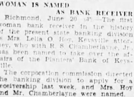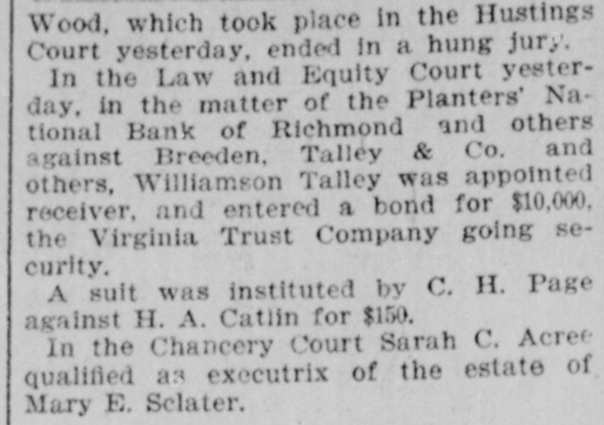 Wood, which took place in the Hustings Court yesterday, ended in a hung jury. In the Law and Equity Court yesterday, in the matter of the Planters' National Bank of Richmond and others against Breeden, Talley & Co. and others, Williamson Talley was appointed receiver, and entered a bond for $10,000, the Virginia Trust Company going security. A suit was instituted by C. H. Page against H. A. Catlin for $150. In the Chancery Court Sarah C. Acree qualified as executrix of the estate of Mary E. Sclater.