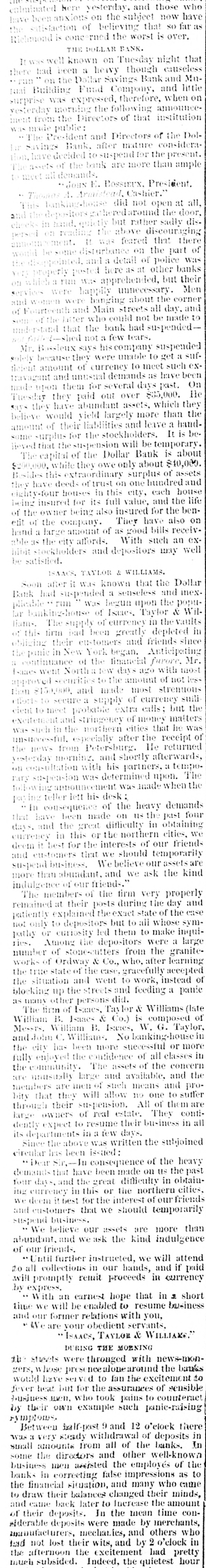 vesterday morning of that institution ment from the Directors DolThe after mature made President public: and Directors of considera- the Sivings recided Bank, to suspend for the present ample have of the bank are more than demands E. BOSSIEUX, President. Armistead Cashier. did not open at all. he red around rather sadly the door, dison reading that in hand. the but above discouraging there 11 was feared ment. of the on part disturbance and detail of police was impointed. here 3 as at other banks their yun posted was apprehended, but Men unnecessary were were happily hanging about the corner and and women Main Streets all of Fourteenth and could not be made to latter who suspended- day. derstand of the that the bank had ..shed not a few tears. suspended B ssieux says his company unable to get a sufMr. because they were meet such exsolely of currency to have been detent amount demands as On travagant and unusual several days past. He made upon them for out over $35,000. they Tuesday they paid abundant assets. which than the are this would have wield largely more leave a handbelieve amount of their liabilities the stockholders. and It is besome Surplus e suspension for will be temporary. is about lieved that the of the Dollar Bank $10,000. The capital while they owe only about of assets Besides $200,000, this extraordinary surplus one hundred and have deed of trust this on city, each house life they lighty-four houses its in full value, and the benof the They being insured owner being for also insured have for the also on a large hand With etit of the company. amount of as good such bills receiv an exhibit able IN stockholders the city affords. and depositors may well be satisfied. TAYLOR & WILLIAMS. Dollar after ISAACS it was known that the and mexBank had suspended upon the popuplicable soon ** run was of begun Isaues a senseless Taylor & Willar lunking-house of currency in the vaults in liam- The supply been greatly depleted since of this firm their bad customers and Anticipating friends in New York furore, Mr. the obliging continuance panic of the began. financial with most less went North a few day amount ago of not leases centities to the most strenutions them approved $150,000. and made of currency smili Mort 10 secure a supply extra calls: but the at and excitem that cities cient 10 meet probable stringency of money matters he was the h in the specially northern after the receipt returned of news and shortly unstrectful. from Petersburg He afterwards, westerday morning. with his partners, a tempo- The on consultation was determined upon. when the PATY suspension announcement was made pay following in teller lett his of desk the heavy demands four In consequence made on 118 the obtaining past that have the been great difficulty in cities, we days and in this or the northern of our friend= deem currency it best for the interests we should temporarily are and customers that We believe our assets suspend than business abundant. and we ask the kind more indulgence members of our of friend-. the firm very properly day and The their posts during the the case remained at exact state of to only to them patiently explained depositors but to all make whose inqui- sympathy not or curiosity the led depositors were granite- a large ries. Amount of stone-cutters from after the learning number work of Ordway & Co., gracefully who. accepted of the true state of the went case to work, instead the situation and and feeding a panic blocking up the streets did. as many of then of Isages, persons Tay for & Williams composed (late of The firm B. J-aacs & Co.) is W. G. Taylor, William W illiam B. Issues, lanking-house and Messas John C. Williams. successful or more the city has been candience more of all classes in fully enjoyed the assets of the concern the community large The and available, and the are musually men of such means and to suffer promembers are will allow no one them are bity that they suspension. All of contithrough their of real estate. They in all large owners to resume their bu-iness Since the dently its departments expect above in was a few written days. the subjoined circular has beet isstied: of the heavy demands Dear Sir.- that have In consequence been made difficulty on us in the obtain- past four days. and the great the northern cities, jue currency in this or interest of our friends and we deem customers it best that for the we should temporarily than suspend business. our assets are more abundant. We believe and we ask the kind indulgence of our friends. further instructed, we will if attend paid Until in our hands, and currency by 20 will all promptly collections remit proceeds in short express. earnest hope that in business , with will an be enabled to resume time we former relations with servants, you, and . our your obedient We are ISAACS, TAYLOR & WILLIAME. DURING THE MOENING with news-mon- batter its streets were prese thronged neealone around excitement the to whose served to fan the sensible gers, would heat have but for the took assurances pains to of counteract fever who panic-raising by pusiness their well, own example such symptoms, tralf-past 9 and 12 o'elock deposits there in small Between steady withdrawal of banks. In and was a amounts very from all of other the well-known some the directors assisted the employés of as the to bank and business in men correcting false impressions many who came the financial situation, balances changed their the amount minds, In and to draw came their back later to the increase mean time conof their deposits. were made by others merchants, who Adderable deposits mechanics, and o'clock in manufacturers, not lost their wits, and by had 2 pretty had excitement hour the afternoon afternoon the Indeed, the quietest