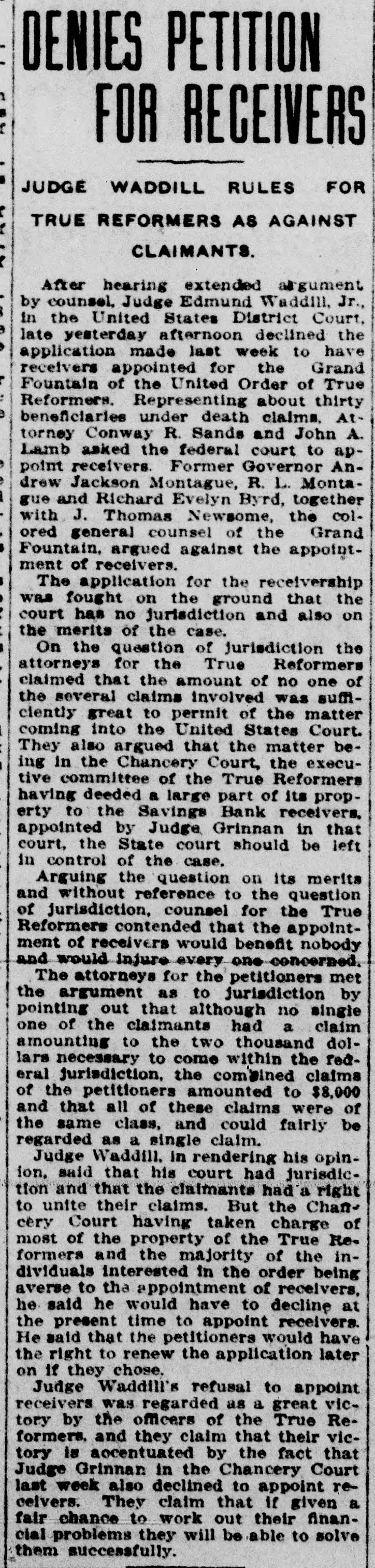 DENIES PETITION FOR RECEIVERS JUDGE WADDILL RULES FOR TRUE REFORMERS AS AGAINST CLAIMANTS. After hearing extended argument by counsel, Judge Edmund Waddill. Jr., in the United States District Court, late yesterday afternoon declined the application made last week to have receivers appointed for the Grand Fountain of the United Order of True Reformers. Representing about thirty beneficiaries under death claims, Attorney Conway R. Sands and John A. Lamb asked the federal court to appoint receivers. Former Governor Andrew Jackson Montague, R. L. Montague and Richard Evelyn Byrd, together with J. Thomas Newsome, the colored general counsel of the Grand Fountain, argued against the appointment of receivers. The application for the receivership was fought on the ground that the court has no jurisdiction and also on the merits of the case. On the question of jurisdiction the attorneys for the True Reformers claimed that the amount of no one of the several claims involved was sufficiently great to permit of the matter coming into the United States Court. They also argued that the matter being in the Chancery Court, the executive committee of the True Reformers having deeded a large part of its property to the Savings Bank receivers, appointed by Judge Grinnan in that court, the State court should be left in control of the case. Arguing the question on its merits and without reference to the question of jurisdiction, counsel for the True Reformers contended that the appointment of receivers would benefit nobody and would injure every one concerned. The attorneys for the petitioners met the argument as to jurisdiction by pointing out that although no single one of the claimants had a claim amounting to the two thousand dollars necessary to come within the rederal jurisdiction, the comeined claims of the petitioners amounted to $8,000 and that all of these claims were of the same class, and could fairly be regarded as a single claim. Judge Waddill. in rendering his opinion, said that his court had jurisdiction and that the claimants had a right to unite their claims. But the Chaffcery Court having taken charge of most of the property of the True Reformers and the majority of the individuals interested in the order being averse to the appointment of receivers, he said he would have to decline at the present time to appoint receivers. He said that the petitioners would have the right to renew the application later on if they chose. Judge Waddill's refusal to appoint receivers was regarded as a great victory by the officers of the True Reformers. and they claim that their victory is accentuated by the fact that Judge Grinnan in the Chancery Court last week also declined to appoint receivers. They claim that If given a fair chance to work out their financial problems they will be able to solve them successfully.