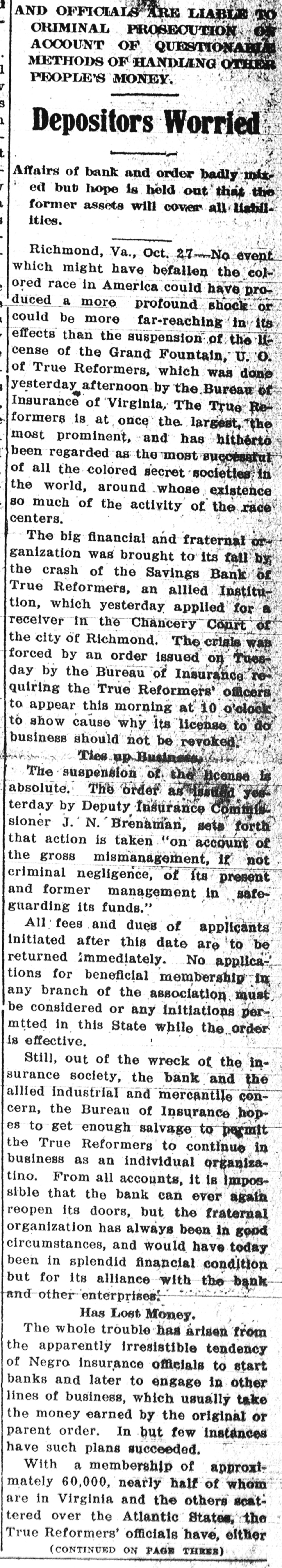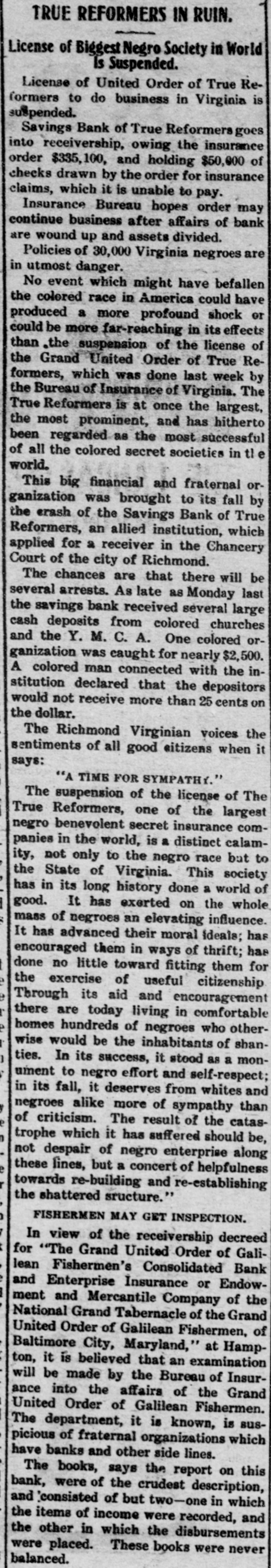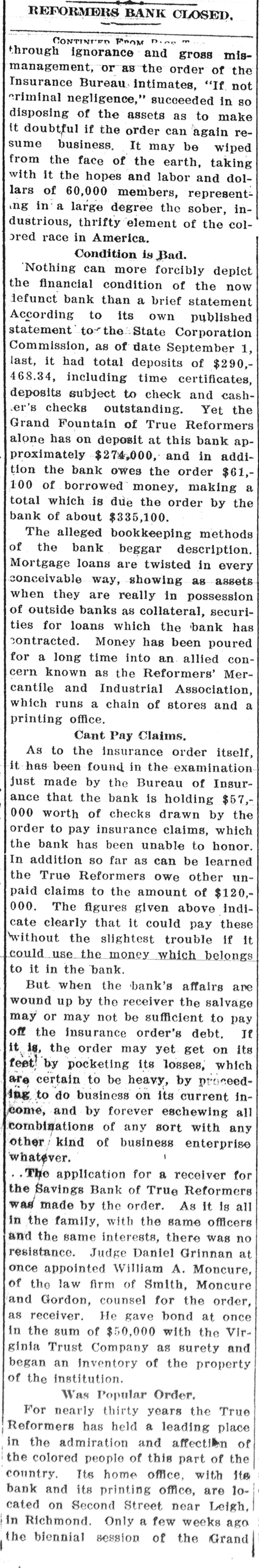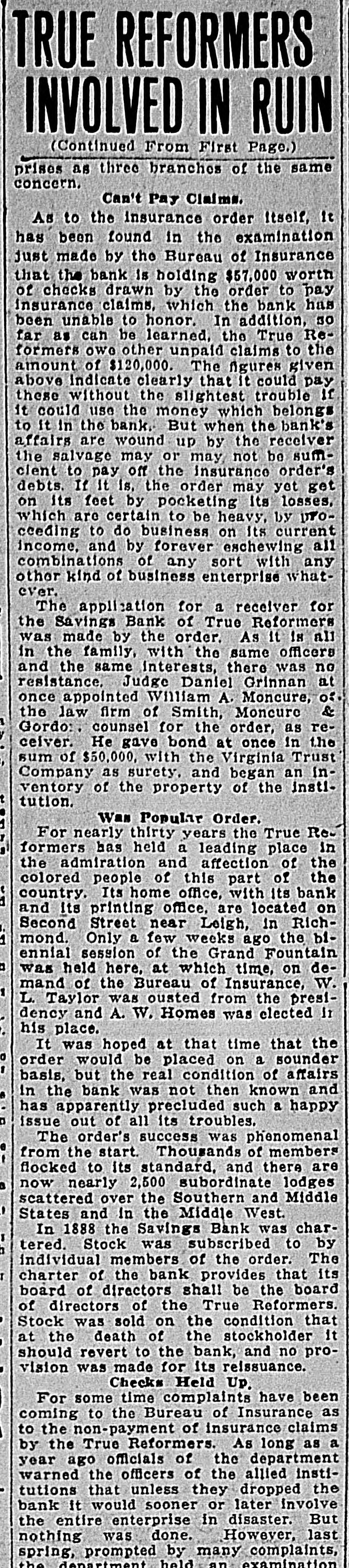 TRUE REFORMERS INVOLVED IN RUIN (Continued From First Page.) prises as three branches of the same concern. Can't Pay Claims. As to the insurance order itself, It has been found in the examination just made by the Bureau of Insurance that the bank is holding $57,000 worth of checks drawn by the order to pay insurance claims, which the bank has been unable to honor. In addition, 30 far as can be learned, the True Reformers owe other unpaid claims to the amount of $120,000. The figures given above indicate clearly that it could pay these without the slightest trouble If it could use the money which belongs to it in the bank. But when the bank's affairs are wound up by the receiver the salvage may or may, not be sumcient to pay off the insurance order's debts. If it is. the order may yet get on its feet by pocketing its losses, which are certain to be heavy, by DFOceeding to do business on its current income, and by forever eschewing all combinations of any sort with any other kind of business enterprise whatever. The application for a receiver for the Savings Bank of True Reformers was made by the order. As it 18 all in the family, with the same officers and the same interests, there was no resistance. Judge Daniel Grinnan at once appointed William A. Moncure, 05. the law firm of Smith, Moncure & Gordo:. counsel for the order, as receiver. He gave bond at once in the sum of $50,000, with the Virginia Trust Company as surety. and began an inventory of the property of the institution. Was Popular Order. For nearly thirty years the True Reformers has held a leading place in the admiration and affection of the colored people of this part of the country. Its home office, with its bank and its printing office, are located on Second Street near Leigh, in Richmond. Only a few weeks ago the biennial session of the Grand Fountain was held here, at which time, on demand of the Bureau of Insurance, W. L. Taylor was ousted from the presidency and A. W. Homes was elected It his place. It was hoped at that time that the order would be placed on a sounder basis, but the real condition of affairs in the bank was not then known and has apparently precluded such a happy issue out of all its troubles. The order's success was phenomenal from the start. Thousands of members flocked to its standard, and there are now nearly 2,500 subordinate lodges scattered over the Southern and Middle States and in the Middle West. In 1888 the Savings Bank was chartered. Stock was subscribed to by individual members of the order. The charter of the bank provides that its board of directors shall be the board of directors of the True Reformers. Stock was sold on the condition that at the death of the stockholder it should revert to the bank, and no provision was made for its reissuance. Checks Held Up. For some time complaints have been coming to the Bureau of Insurance as to the non-payment of insurance claims by the True Reformers. As long as a year ago officials of the department warned the officers of the allied institutions that unless they dropped the bank it would sooner or later involve the entire enterprise in disaster. But nothing was done. However, last hys