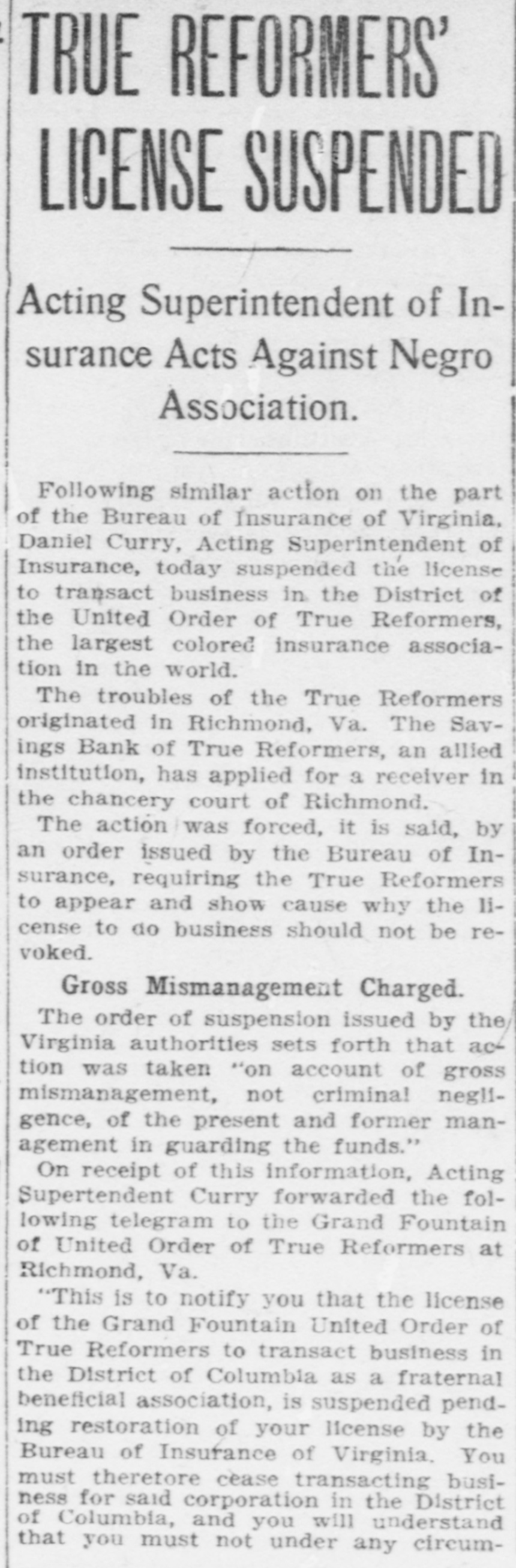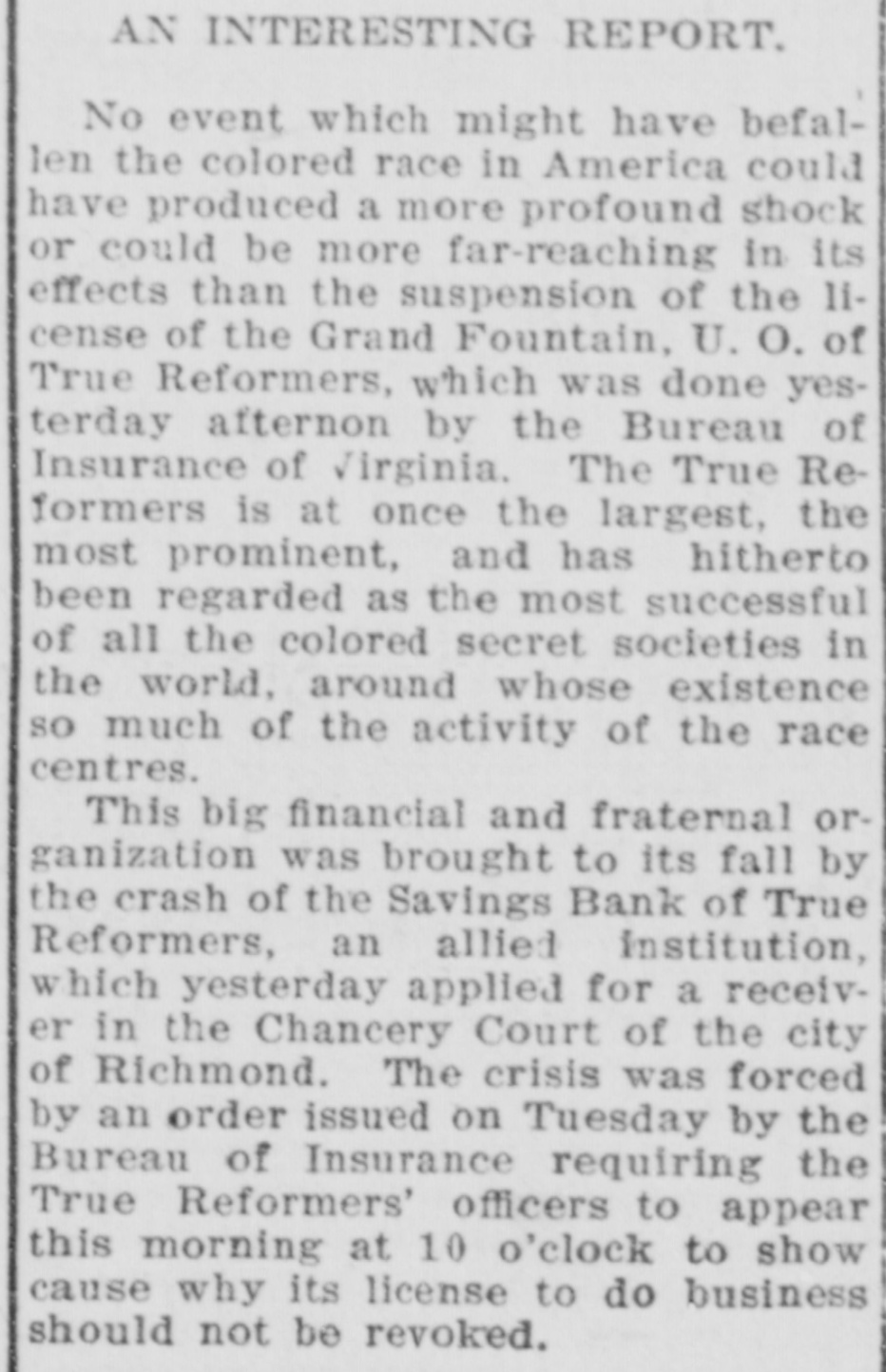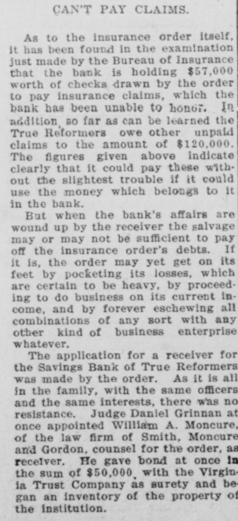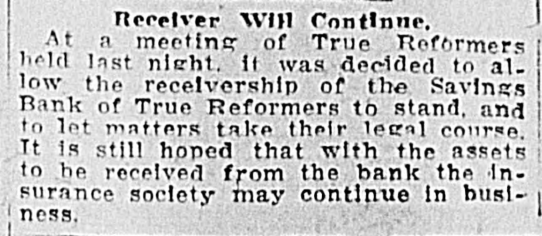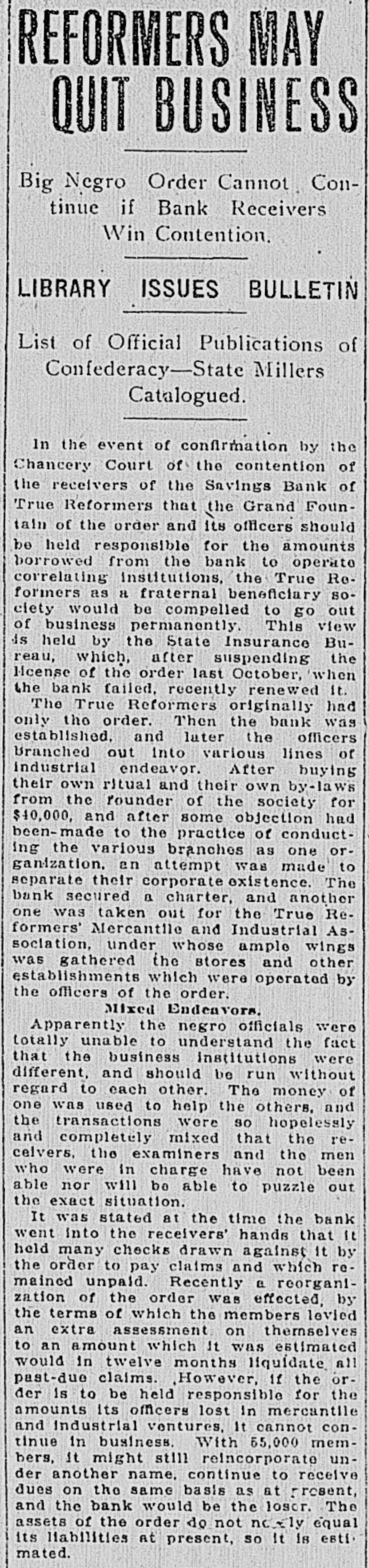 TRUE REFORMERS INVOLVED IN RUIN (Continued From First Page.) prises as three branches of the same concern. Can't Pay Claims. As to the insurance order itself, It has been found in the examination just made by the Bureau of Insurance that the bank is holding $57,000 worth of checks drawn by the order to pay insurance claims, which the bank has been unable to honor. In addition, 30 far as can be learned, the True Reformers owe other unpaid claims to the amount of $120,000. The figures given above indicate clearly that it could pay these without the slightest trouble If it could use the money which belongs to it in the bank. But when the bank's affairs are wound up by the receiver the salvage may or may, not be sumcient to pay off the insurance order's debts. If it is. the order may yet get on its feet by pocketing its losses, which are certain to be heavy, by DFOceeding to do business on its current income, and by forever eschewing all combinations of any sort with any other kind of business enterprise whatever. The application for a receiver for the Savings Bank of True Reformers was made by the order. As it 18 all in the family, with the same officers and the same interests, there was no resistance. Judge Daniel Grinnan at once appointed William A. Moncure, 05. the law firm of Smith, Moncure & Gordo:. counsel for the order, as receiver. He gave bond at once in the sum of $50,000, with the Virginia Trust Company as surety. and began an inventory of the property of the institution. Was Popular Order. For nearly thirty years the True Reformers has held a leading place in the admiration and affection of the colored people of this part of the country. Its home office, with its bank and its printing office, are located on Second Street near Leigh, in Richmond. Only a few weeks ago the biennial session of the Grand Fountain was held here, at which time, on demand of the Bureau of Insurance, W. L. Taylor was ousted from the presidency and A. W. Homes was elected It his place. It was hoped at that time that the order would be placed on a sounder basis, but the real condition of affairs in the bank was not then known and has apparently precluded such a happy issue out of all its troubles. The order's success was phenomenal from the start. Thousands of members flocked to its standard, and there are now nearly 2,500 subordinate lodges scattered over the Southern and Middle States and in the Middle West. In 1888 the Savings Bank was chartered. Stock was subscribed to by individual members of the order. The charter of the bank provides that its board of directors shall be the board of directors of the True Reformers. Stock was sold on the condition that at the death of the stockholder it should revert to the bank, and no provision was made for its reissuance. Checks Held Up. For some time complaints have been coming to the Bureau of Insurance as to the non-payment of insurance claims by the True Reformers. As long as a year ago officials of the department warned the officers of the allied institutions that unless they dropped the bank it would sooner or later involve the entire enterprise in disaster. But nothing was done. However, last hys