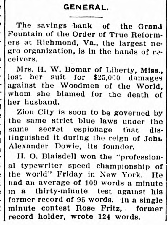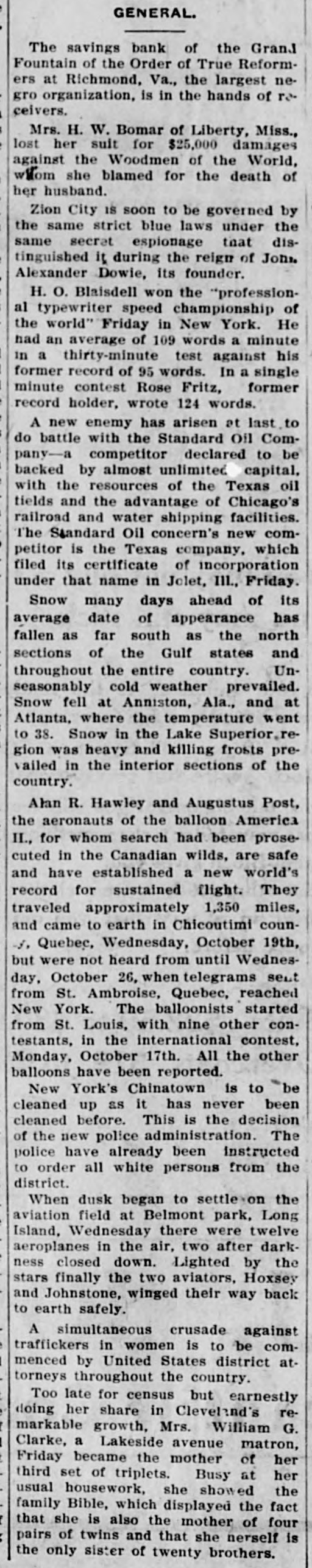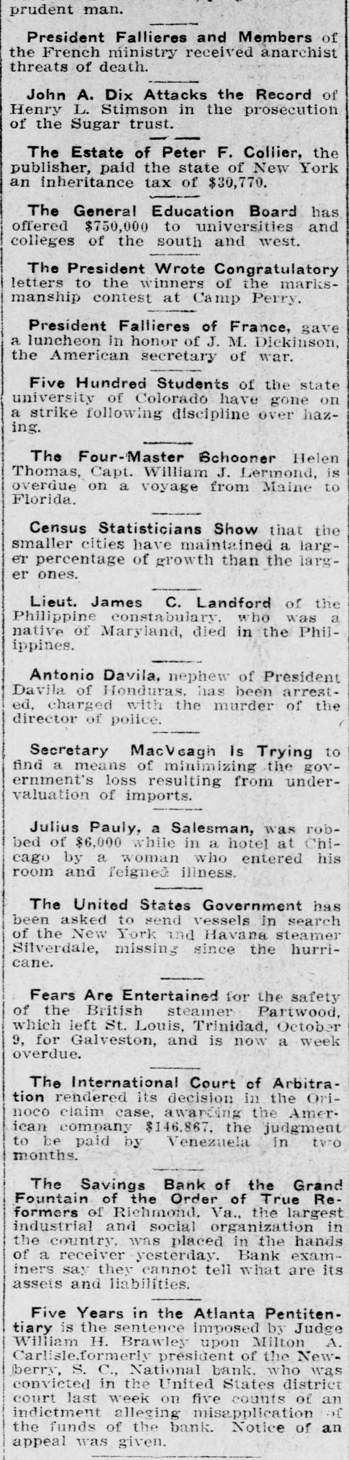 prudent man. President Fallieres and Members of the French ministry received anarchist threats of death. John A. Dix Attacks the Record of Henry L. Stimson in the prosecution of the Sugar trust. The Estate of Peter F. Collier, the publisher, paid the state of New York an inheritance tax of $30,770. The General Education Board has offered $750,000 to universities and colleges of the south and west. The President Wrote Congratulatory letters to the winners of the marksmanship contest at Camp Perry. President Fallieres of France, gave a luncheon in honor of J. M. Dickinson, the American secretary of war. Five Hundred Students of the state university of Colorado have gone on a strike following discipline over hazing. The Four-Master Schooner Helen Thomas, Capt. William J. Lermond, is overdue on a voyage from Maine to Florida, Census Statisticians Show that the smaller cities have maintained a larger percentage of growth than the larger ones. Lieut. James C. Landford of the Philippine constabulary. who was a native of Maryland, died in the Philippines. Antonio Davila. nephew of President Davila of Honduras. has been arrest. ed, charged with the murder of the director of police. Secretary MacVeagh is Trying to find a means of minimizing the government's loss resulting from undervaluation of imports. Julius Pauly, a Salesman, was robbed of $6,000 while in a hotel at Chicago by a woman who entered his room and feigned illness. The United States Government has been asked to send vessels in search of the New York and Havana steamer Silverdale, missing since the hurricane. Fears Are Entertained for the safety of the British steamer Partwood, which left St. Louis, Trinidad, October 9, for Galveston, and is now a week overdue. The International Court of Arbitration rendered its decision in the Orinoco claim case, awarding the American company $146.867. the judgment to be paid by Venezuela in two months. The Savings Bank of the Grand Fountain of the Order of True Reformers of Richmond. Va., the largest industrial and social organization in the country, was placed in the hands of a receiver yesterday. Bank examiners say they cannot tell what are its assets and liabilities. Five Years in the Atlanta Pentitentiary is the sentence imposed by Judge William H. Brawley upon Milton A. Carlisle.formerly president of the Newberry, S. C., National bank. who was convicted in the United States district court last week on five counts of an indictment alleging misapplication the funds of the bank. Notice of an appeal was given.
