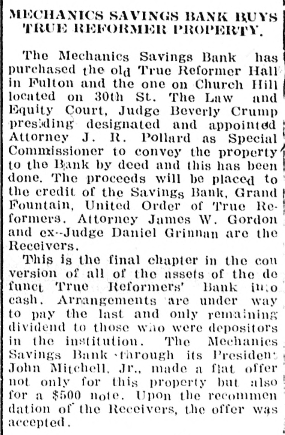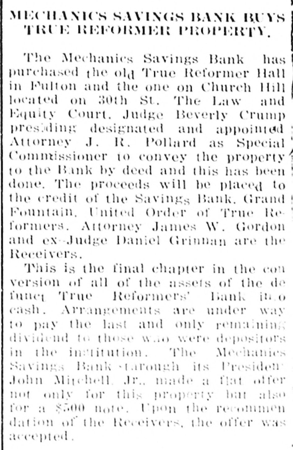 MECHANICS SAVINGS BANK BUYS TRUE REFORMER PROPERTY. The Mechanics Savings Bank has purchased the old True Reformer Hall in Fulton and the one on Church Hill located on 30th St. The Law and Equity Court, Judge Beverly Crump presiding designated and appointed Attorney J. R. Pollard as Special Commissioner to convey the property to the Bank by deed and this has been done. The proceeds will be placed to the credit of the Savings Bank, Grand Fountain, United Order of True Reformers. Attorney James W. Gordon and ex-Judge Daniel Grinnan are the Receivers. This is the final chapter in the con version of all of the assets of the de funct True Reformers' Bank in:o cash. Arrangements are under way to pay the last and only remaining dividend to those who were depositors in the institution. The Mechanics Savings Bank through its President John Mitchell. Jr., made a flat offer not only for this property but also for a $500 note. Upon the recommen dation of the Receivers, the offer was accepted.