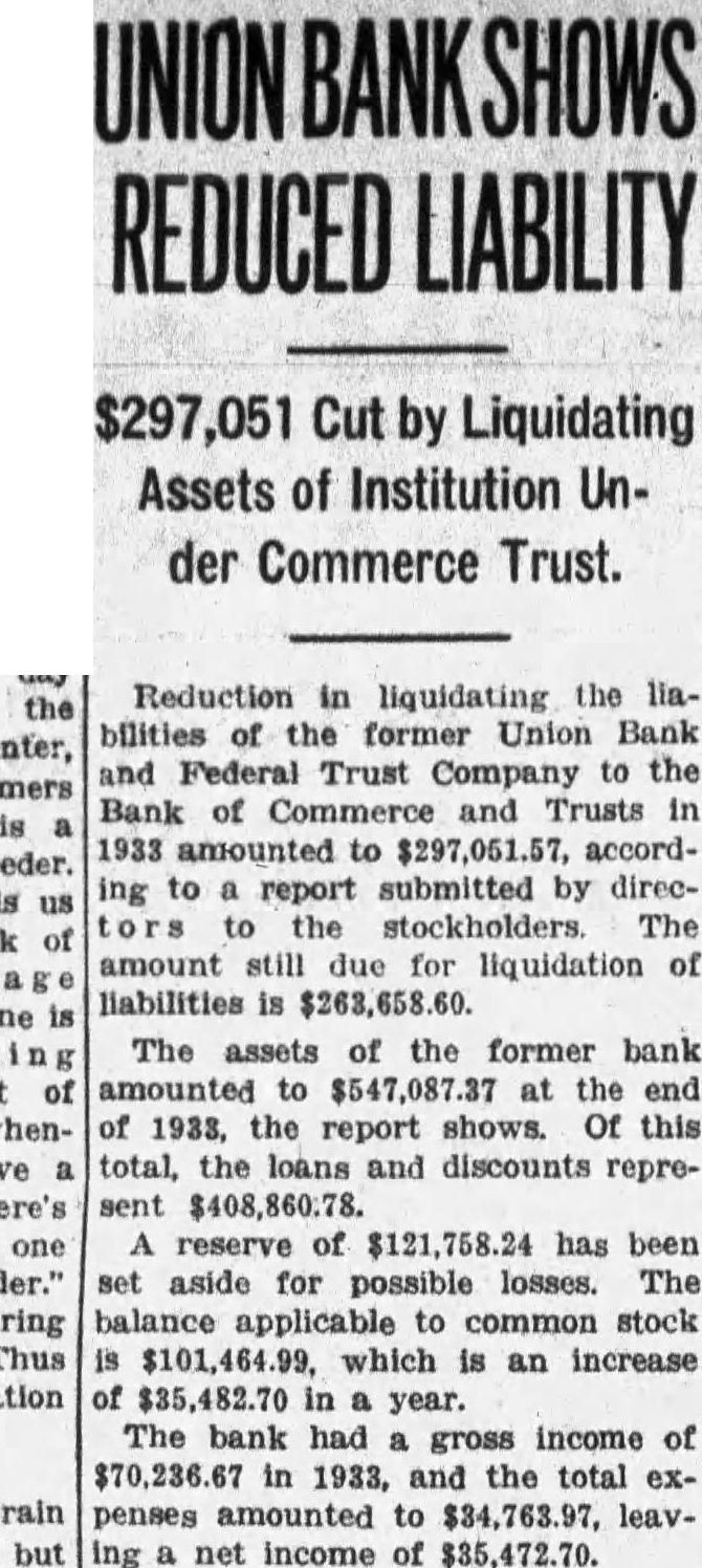 LIABILITY $297,051 Cut by Liquidating Assets of Institution Under Commerce Trust. Reduction in liquidating the liabilities of the Union Bank and Trust Company to the Bank of Commerce and Trusts 1933 $297,051.57, according to report submitted by direcstockholders The amount due for liquidation of liabilities $263,658.60. The assets of the former bank $547,087.37 at the end report this total, the loans and discounts repre$408,860.78. reserve of $121,758.24 has been aside possible losses. The balance applicable to common stock which is an increase $35,482.70 year. The bank had gross income of in 1933, and the total penses amounted to leaving net income $35,472.70.