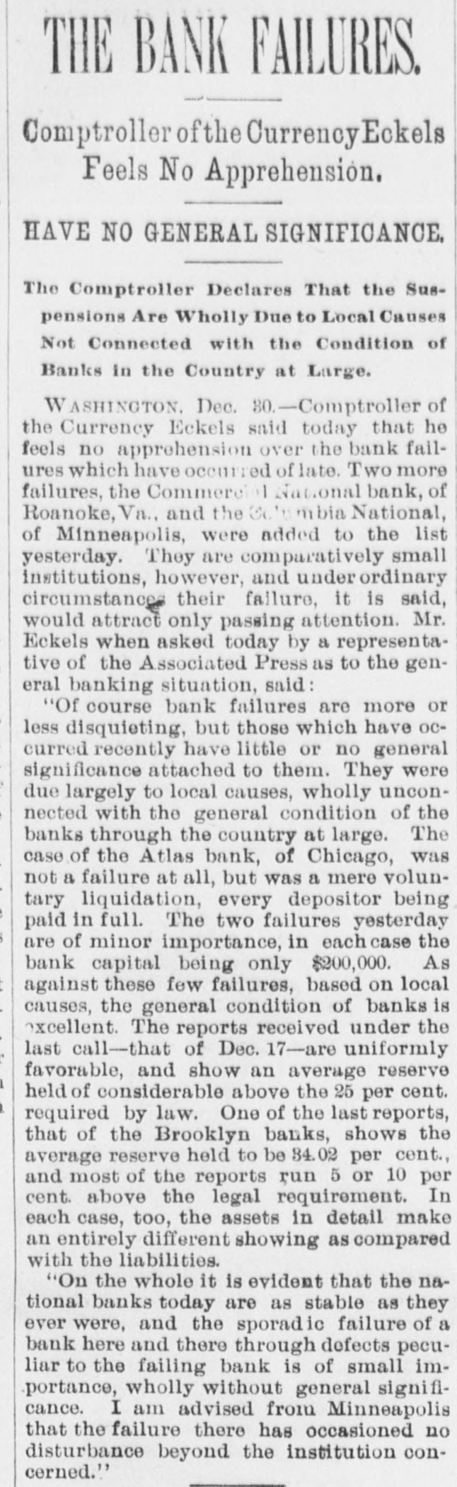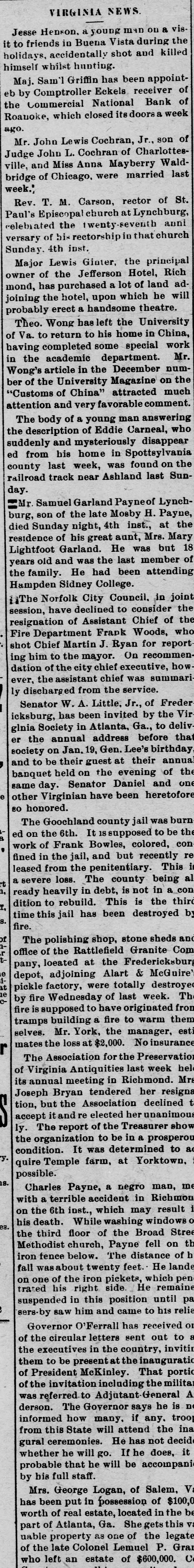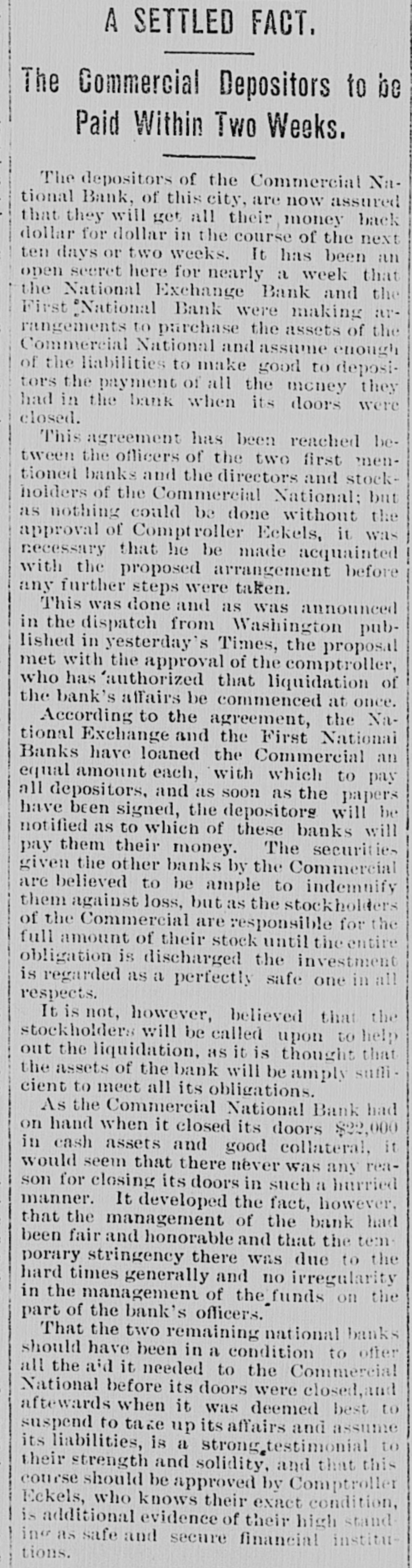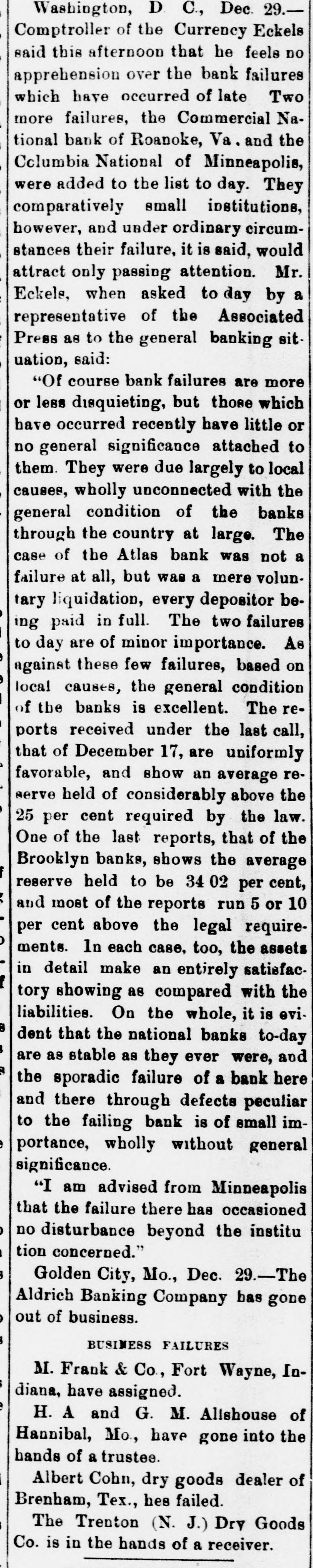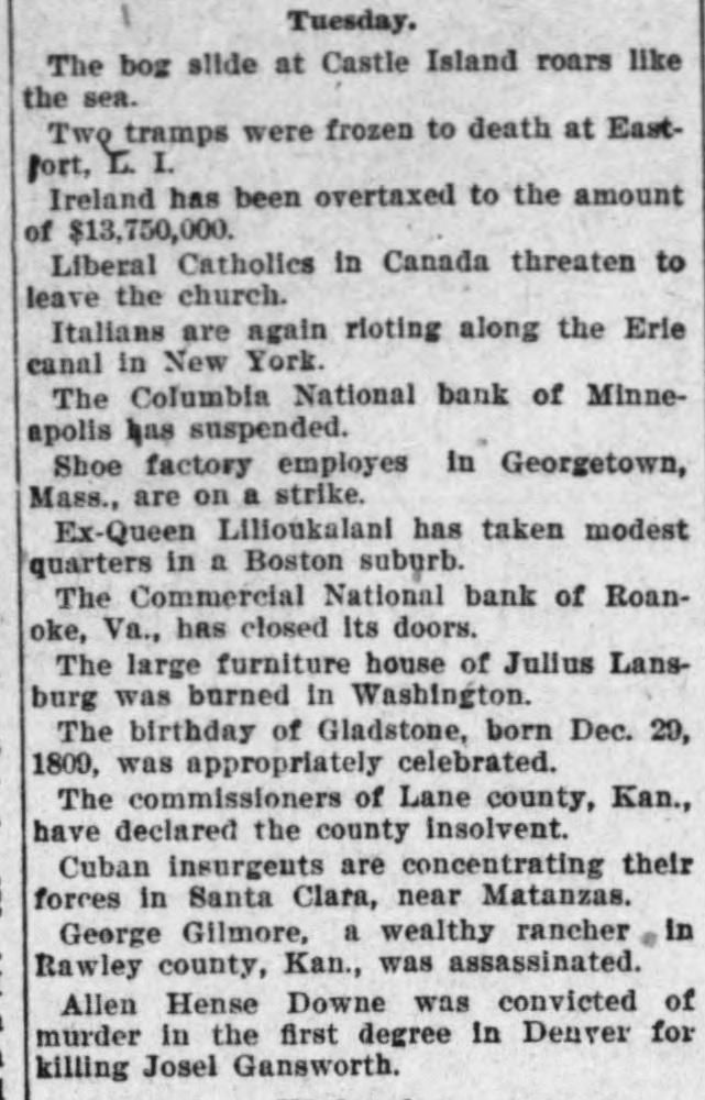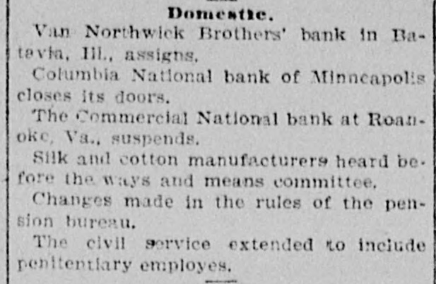 Domestic. The long threatened split in Tammany Hall, New York City, came when Henry D. Purroy, with several district leaders, openly bolted the organization and announced that he would form a new Tammany. Isaac Zuker was sentenced to thirty-six years' imprisonment for arson by Judge Fursman, in the Criminal Branch of the Supreme Court, New York City. Burglars entered the branch office of the Metropolitan Insurance Company, in West Forty-second street, New York City, and after blowing open a big safe in front of an open window stole $1500 in cash and valuable jewelry. Mrs. James Abercrombie Burden, wife of a millionaire iron founder. was attacked on Fifth avenue, in New York City, in broad daylight, by a highwayman, who flourished a knife, threw her down and ran off with her pocketbook. He was captured by Policeman Young after a hot chase. The Columbia National and Washington Banks of Minneapolis. the Commercial National Bank of Roanoke, Va., and the Van Nortwick Bank at Batavia, III, closed. Fire destroyed the electric light plant in Newark, N.J., and the city and'several nearby towns were left in darkness for a right. Isnac Zuker was convicted of arson in the first degree in having planned the burning of his building in New York City in January, 1892. The Atlas National Bank, of Chicago, Ill., began liquidating its affairs, and the Dime Savings Bank, of the same city, required depositors to give ninety days' notice of withdrawals. Three masked men, armed with revolvers, entered the saloon of Mrs. Mary Bernhardt, In Chicago, at 11 o'clock p. m., and robbed the place of $450. Mrs. Bernhardt was bebind the bar when the men came in, and two patrons of the place were sitting at a table playing dominoes. Two men were killed and another was fatally shot in a general fight six miles north of Mount Vernon. Ky. The dead are A. Rowland and Jack Rigsby. The wounded man is Greeley Lear. The fight began at a merrymaking. and was fought out on the highway in Kentucky feudal fashion between opposing factions. At Superior, Wis.. anticipating a run, the Bank of Superior did not open for business. Henry S. Butler is assignee. and has assumed charge of the bank's affairs. The failure is due to poor business and heavy withdrawals since recent failures in St. Paul and Chicago. The capital of the bank was $25,000, with a surplus of $6000. The deposits were nearly $100,000, including $13,210 of city funds. More than $1,500.000 was voted to hospitals, asylums and other charitable institutions for 1897 by the Board of Estimate, of New York City. The Lehigh Mills, in South Easton, Penn., manufacturers of cotton goods, have shut down for four months. and there is said to be but little prospect of a resumption at the end of that period. Depression in business is given as the cause of the shut-down, and one hundred employes are affected. The plant was started nearly one hundred years ago, and this is the first shut-down it has experienced. City Treasurer Turner. of Boston. Mass., opened bids for $1,890,000 3½ per cent. and four per cent. ten, twenty, and thirty year loans. The contract was awarded to Blake Brothers and R. L. Day. whose bid was $1,944,286 for the entire loan. The Scandia Bank, of Minneapolis, Minn., closed its doors. It was organized fifteen years ago by M. Grinager, a prominent Scandinavian politician. who died in 1893. Its President is R. Sunde, who came to Minneapolis ten years ago from Wilmar. Minn., where he had made a fortune as a money lender. Thomas J. O'Malley, a Chicago Alderman, has been indicted for the murder of "Gus" Colliander, in an election booth in 1894. A mail train from the West was robbed at one of the New York City stations and a large sum of money taken from letters addressed to New York firms. The letters, without in. closures, were found in the lower bay. Mrs. Agnes Antoinette Halpin, wife of ex. Assemblyman William Halpin, died in New York City of nervous exhaustion, collapse and gastritis, caused by the excessive use of Jamaica ginger. This habit is said to be prevalent in many places. The West End Street Railway Company of Boston, on which a strike occurred recently, discharged 700 union men, including the members of the Conference Committee and officers of the union. The Board of Directors of the Security Mortgage and Trust Company, Dallas, Texas, made application for the appointment of a receiver. The liabilitieso the company are, approximately, $2,000,000. Georgia's alleged titled convict, "Lord Beresford, as Sidney Lascelles called himself, was madea freeman by act of Governor Atkinson, who took pity upon him and pardoned him for his model conduct while in prison. The Atlas National Bank, Chicago, decided not to open its doors again, and the Clearing House will advance $600,000 tc help it pay all claims on demand. The bank has a capital of $700,000. W. C. D. Grannis is President. Thesecurities were examined and found to be ample to pay all claims in full.