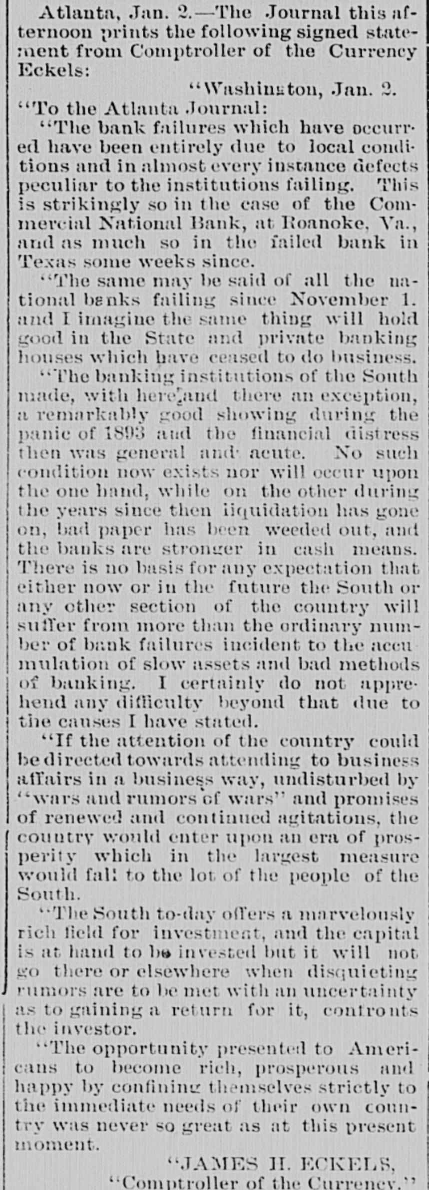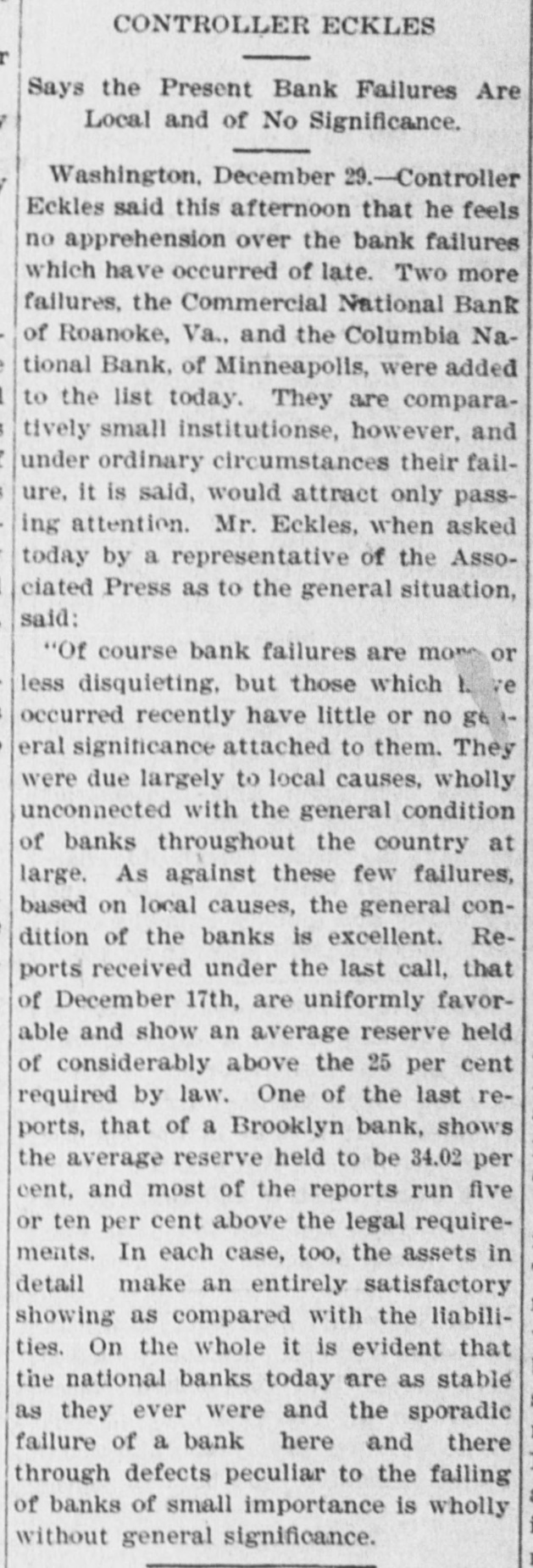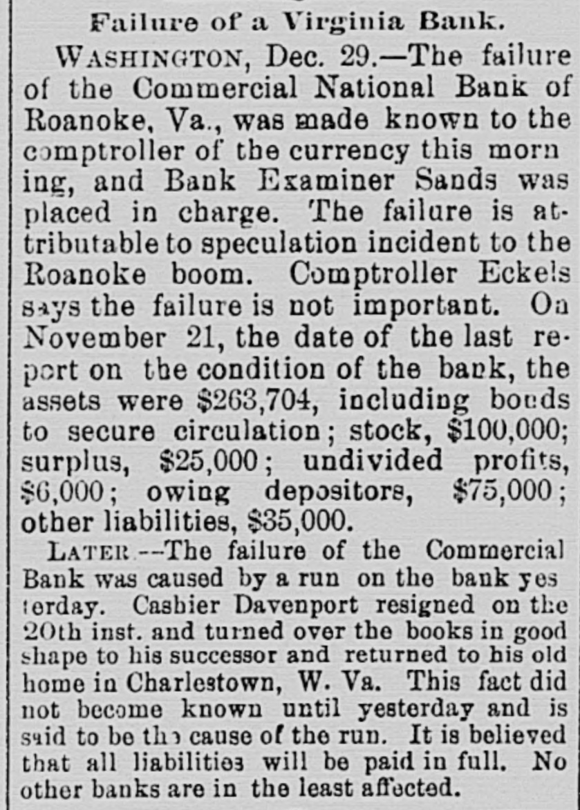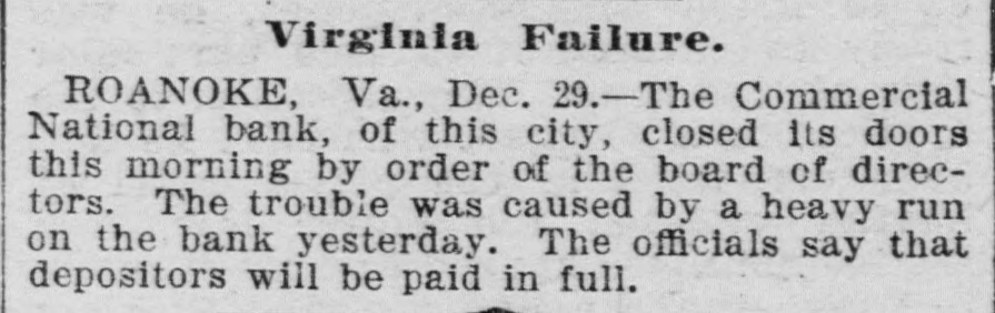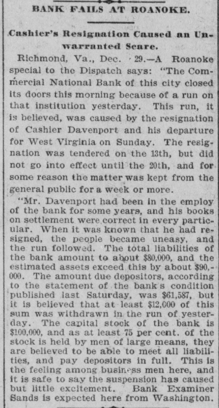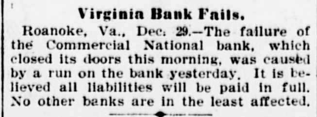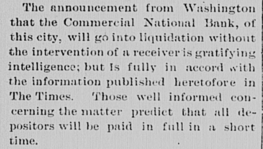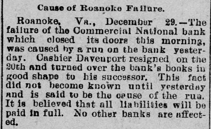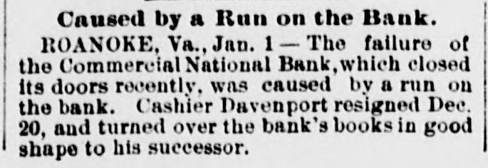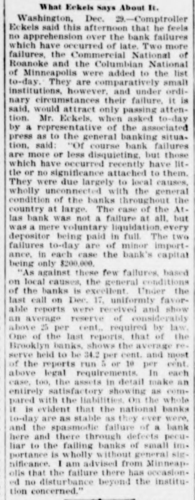 Domestic. The long threatened split in Tammany Hall, New York City, came when Henry D. Purroy, with several district leaders, openly bolted the organization and announced that he would form a new Tammany. Isaac Zuker was sentenced to thirty-six years' imprisonment for arson by Judge Fursman, in the Criminal Branch of the Supreme Court, New York City. Burglars entered the branch office of the Metropolitan Insurance Company, in West Forty-second street, New York City, and after blowing open a big safe in front of an open window stole $1500 in cash and valuable jewelry. Mrs. James Abercrombie Burden, wife of a millionaire iron founder. was attacked on Fifth avenue, in New York City, in broad daylight, by a highwayman, who flourished a knife, threw her down and ran off with her pocketbook. He was captured by Policeman Young after a hot chase. The Columbia National and Washington Banks of Minneapolis. the Commercial National Bank of Roanoke, Va., and the Van Nortwick Bank at Batavia, III, closed. Fire destroyed the electric light plant in Newark, N.J., and the city and'several nearby towns were left in darkness for a right. Isnac Zuker was convicted of arson in the first degree in having planned the burning of his building in New York City in January, 1892. The Atlas National Bank, of Chicago, Ill., began liquidating its affairs, and the Dime Savings Bank, of the same city, required depositors to give ninety days' notice of withdrawals. Three masked men, armed with revolvers, entered the saloon of Mrs. Mary Bernhardt, In Chicago, at 11 o'clock p. m., and robbed the place of $450. Mrs. Bernhardt was bebind the bar when the men came in, and two patrons of the place were sitting at a table playing dominoes. Two men were killed and another was fatally shot in a general fight six miles north of Mount Vernon. Ky. The dead are A. Rowland and Jack Rigsby. The wounded man is Greeley Lear. The fight began at a merrymaking. and was fought out on the highway in Kentucky feudal fashion between opposing factions. At Superior, Wis.. anticipating a run, the Bank of Superior did not open for business. Henry S. Butler is assignee. and has assumed charge of the bank's affairs. The failure is due to poor business and heavy withdrawals since recent failures in St. Paul and Chicago. The capital of the bank was $25,000, with a surplus of $6000. The deposits were nearly $100,000, including $13,210 of city funds. More than $1,500.000 was voted to hospitals, asylums and other charitable institutions for 1897 by the Board of Estimate, of New York City. The Lehigh Mills, in South Easton, Penn., manufacturers of cotton goods, have shut down for four months. and there is said to be but little prospect of a resumption at the end of that period. Depression in business is given as the cause of the shut-down, and one hundred employes are affected. The plant was started nearly one hundred years ago, and this is the first shut-down it has experienced. City Treasurer Turner. of Boston. Mass., opened bids for $1,890,000 3½ per cent. and four per cent. ten, twenty, and thirty year loans. The contract was awarded to Blake Brothers and R. L. Day. whose bid was $1,944,286 for the entire loan. The Scandia Bank, of Minneapolis, Minn., closed its doors. It was organized fifteen years ago by M. Grinager, a prominent Scandinavian politician. who died in 1893. Its President is R. Sunde, who came to Minneapolis ten years ago from Wilmar. Minn., where he had made a fortune as a money lender. Thomas J. O'Malley, a Chicago Alderman, has been indicted for the murder of "Gus" Colliander, in an election booth in 1894. A mail train from the West was robbed at one of the New York City stations and a large sum of money taken from letters addressed to New York firms. The letters, without in. closures, were found in the lower bay. Mrs. Agnes Antoinette Halpin, wife of ex. Assemblyman William Halpin, died in New York City of nervous exhaustion, collapse and gastritis, caused by the excessive use of Jamaica ginger. This habit is said to be prevalent in many places. The West End Street Railway Company of Boston, on which a strike occurred recently, discharged 700 union men, including the members of the Conference Committee and officers of the union. The Board of Directors of the Security Mortgage and Trust Company, Dallas, Texas, made application for the appointment of a receiver. The liabilitieso the company are, approximately, $2,000,000. Georgia's alleged titled convict, "Lord Beresford, as Sidney Lascelles called himself, was madea freeman by act of Governor Atkinson, who took pity upon him and pardoned him for his model conduct while in prison. The Atlas National Bank, Chicago, decided not to open its doors again, and the Clearing House will advance $600,000 tc help it pay all claims on demand. The bank has a capital of $700,000. W. C. D. Grannis is President. Thesecurities were examined and found to be ample to pay all claims in full.