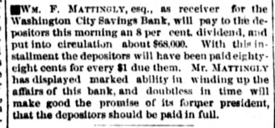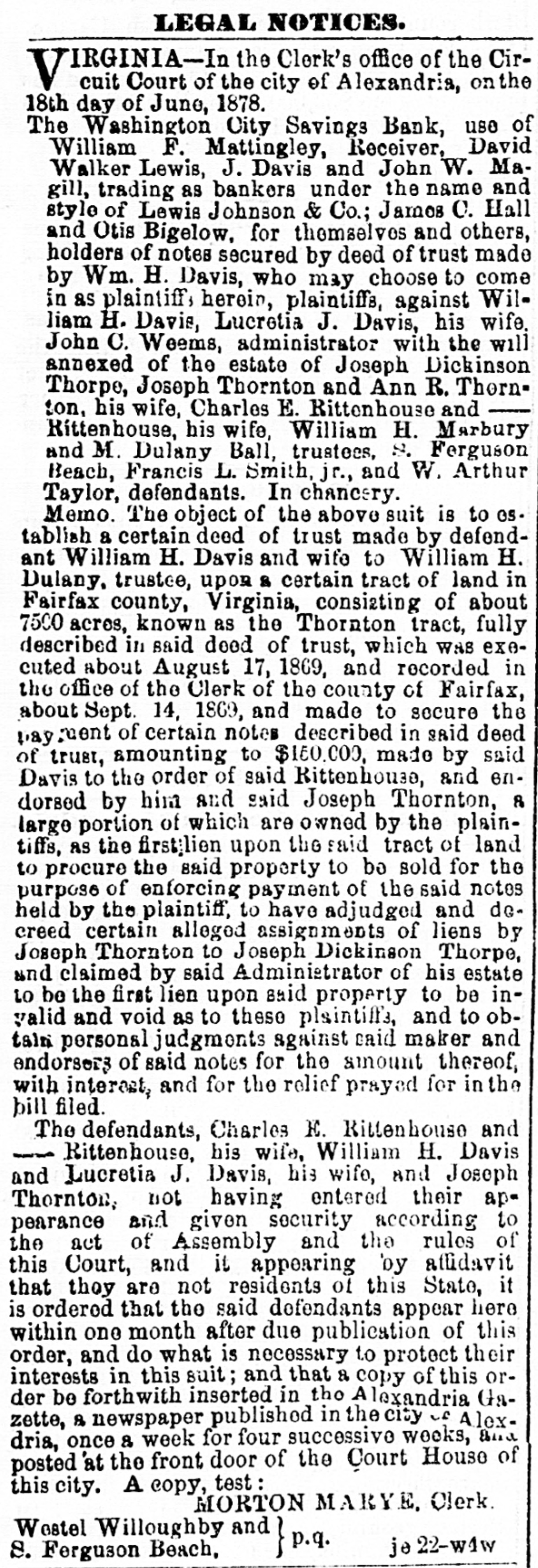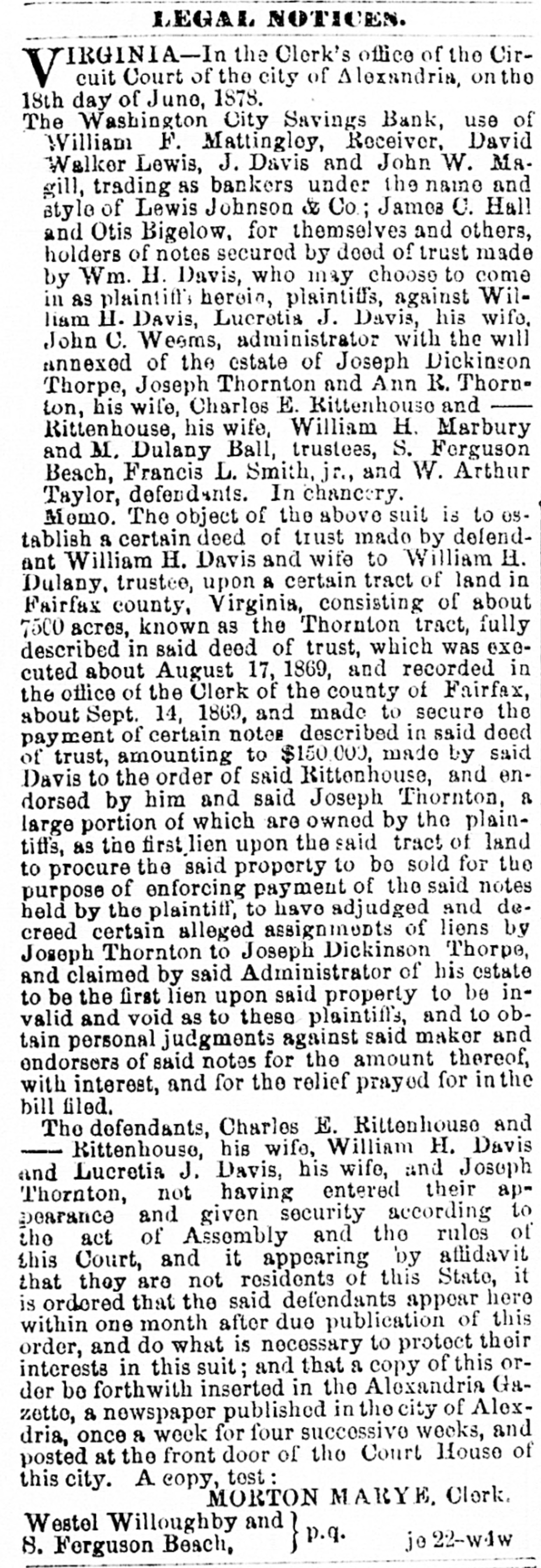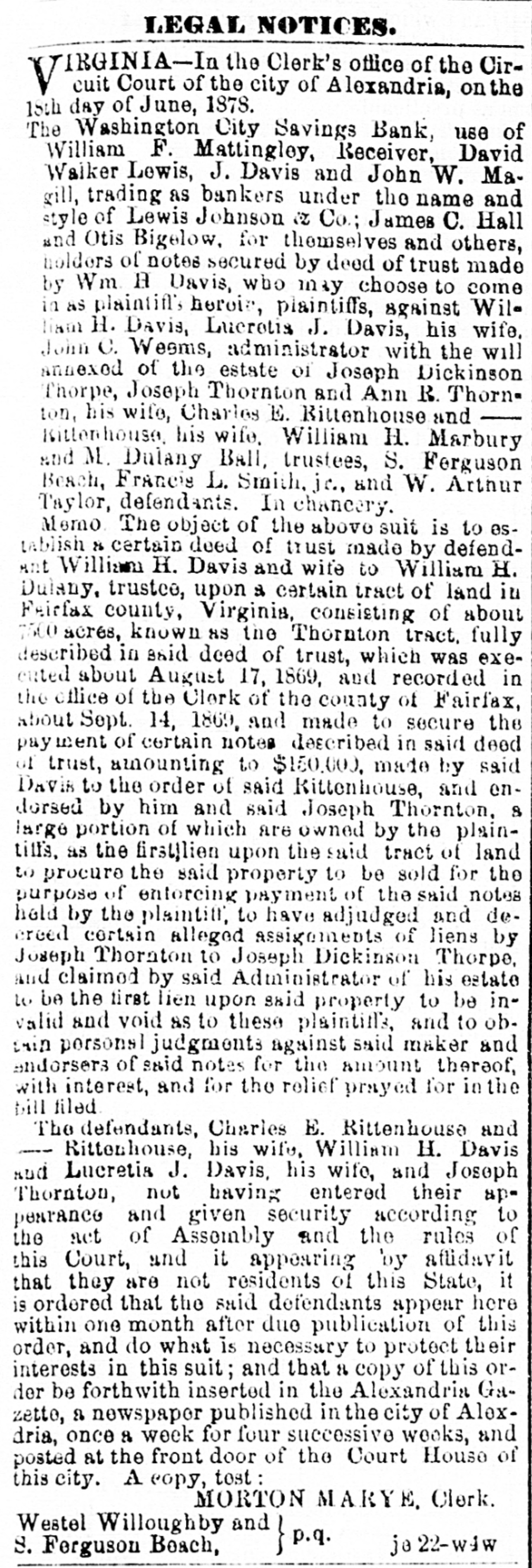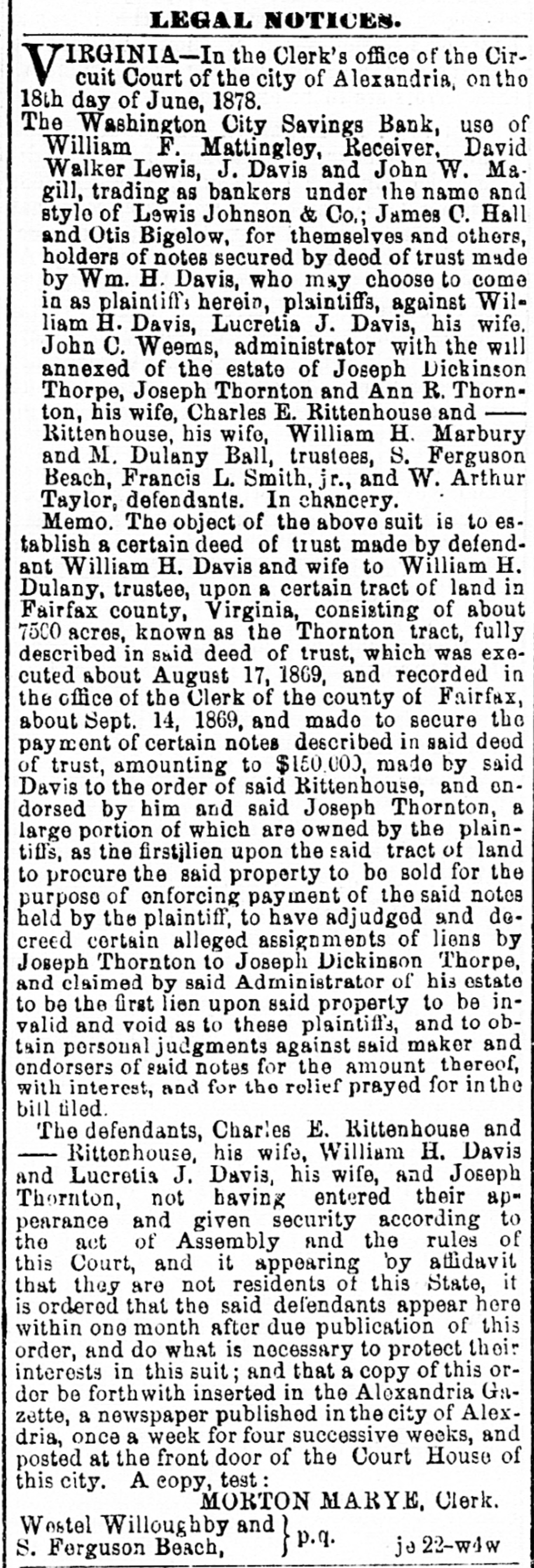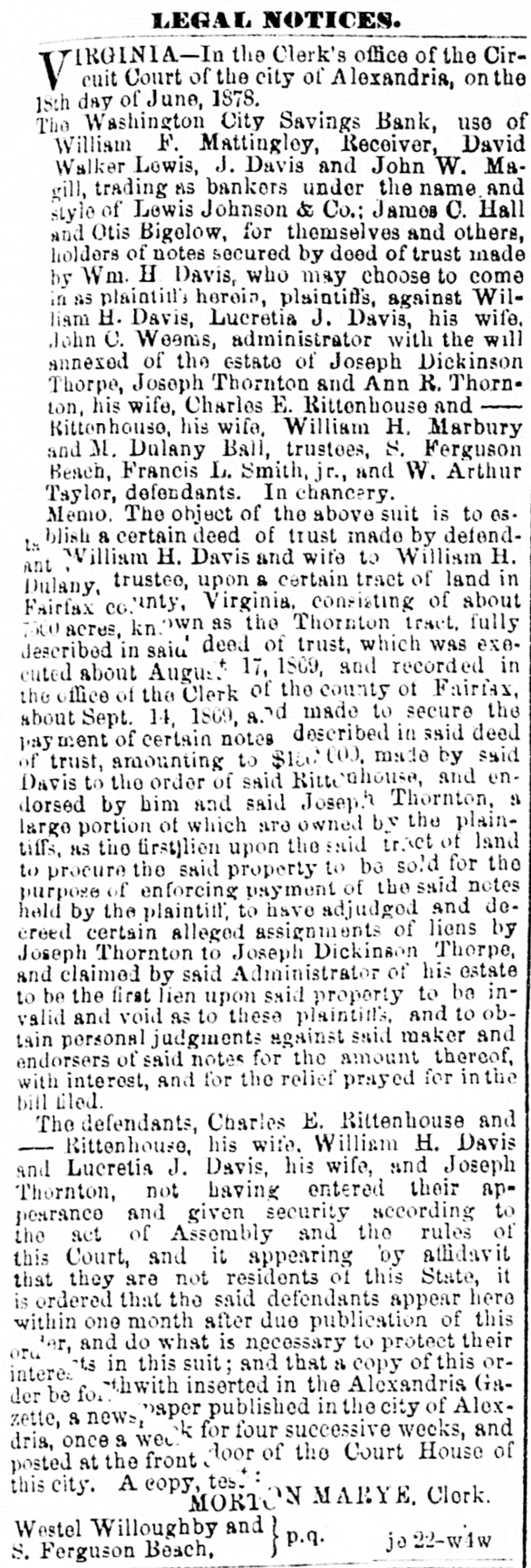 The Washington City Savings Bank, use of William F. Mattinglog, Receiver, David Walker Lewis, J. Davis and John W. Magill, trading as bankers under the name and style of Lewis Johnson & Co; James C. Hall and Otis Bigelow, for themselves and others, holders of notes secured by deed of trust made by Wm H Davis, who may choose to come in as plaintitt's herei, plaintiffs, against William H. Davis, Lucratis J Davis, his wife, John C. Wesms, administrator with the will annexed of the estate of Joseph Dickinson Thorpe, Joseph Thornton and Ann R. Thornton, his wife, Charles E. Rittenhouse and Rittenhouse, his wife, William H. Marbury and M. Dulany Ball, trustees, S. Ferguson Beach, Francis L. Smith, jr., and W. Arthur Taylor, defendants. In chane-ry.