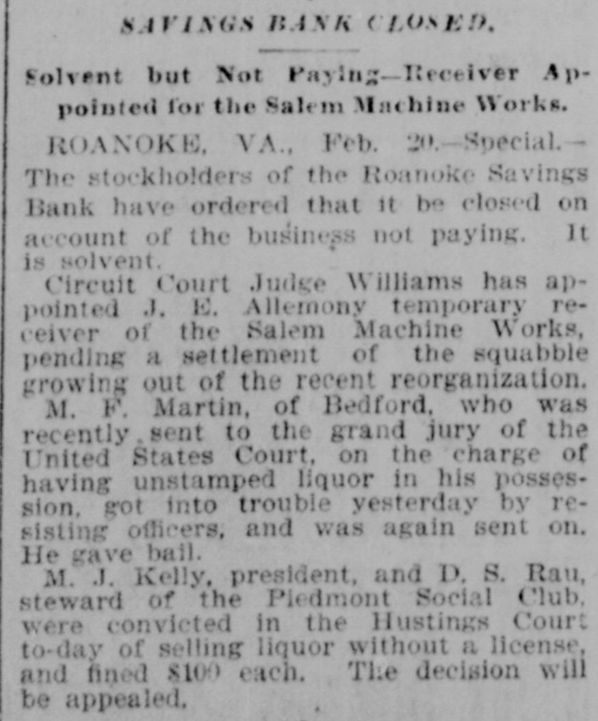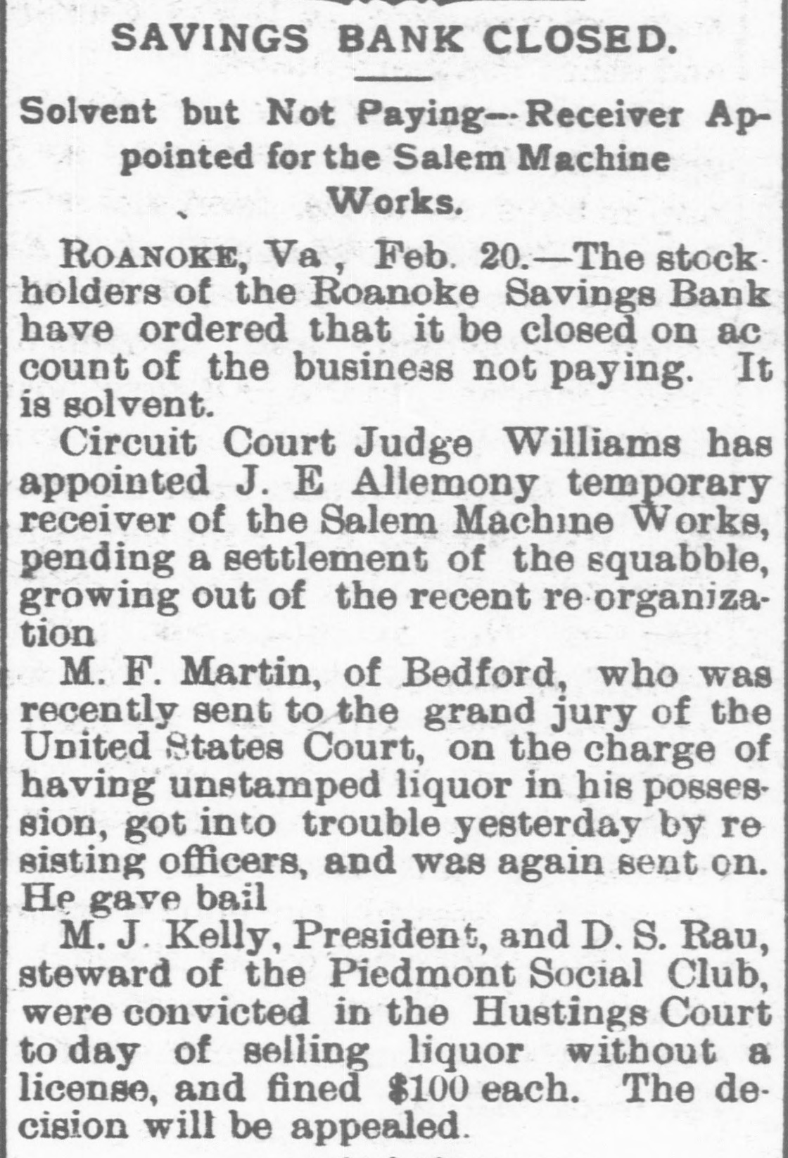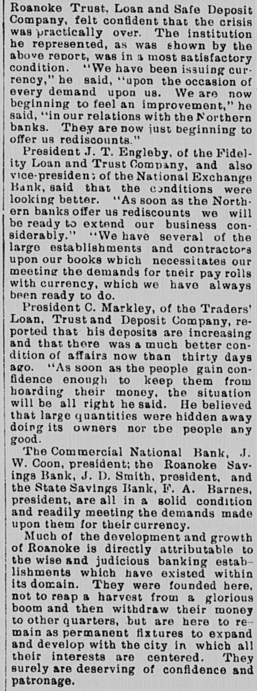 Roanoke Trust, Loan and Safe Deposit Company, felt confident that the crisis was practically over. The institution he represented, as was shown by the above report, was in a most satisfactory condition. "We have been issuing currency," he said, "upon the occasion of every demand upon us. We are now beginning to feel an improvement," he said, "in our relations with the Northern banks. They are now just beginning to offer us rediscounts." President J. T. Engleby, of the Fidelity Loan and Trust Company, and also vice-presiden: of the National Exchange Bank, said that the conditions were looking better. "As soon as the Northern banks offer us rediscounts we will be ready to extend our business considerably." "We have several of the large establishments and contractors upon our books which necessitates our meeting the demands for their pay rolls with currency, which we have always been ready to do. President C. Markley, of the Traders' Loan, Trust and Deposit Company, reported that his deposits are increasing and that there was a much better condition of affairs now than thirty days ago. "As soon as the people gain confidence enough to keep them from hoarding their money, the situation will be all right he said. He believed that large quantities were hidden away doing its owners nor the people any good. The Commercial National Bank, J. W. Coon, president; the Roanoke Savings Bank, J. D. Smith, president, and the State Savings Bank, F. A. Barnes, president, are all in a solid condition and readily meeting the demands made upon them for their currency. Much of the development and growth of Roanoke is directly attributable to the wise and judicious banking establishments which have existed within its domain. They were founded here. not to reap a harvest from & glorious boom and then withdraw their money to other quarters, but are here to remain as permanent fixtures to expand and develop with the city in which all their interests are centered. They surely are deserving of confidence and patronage.