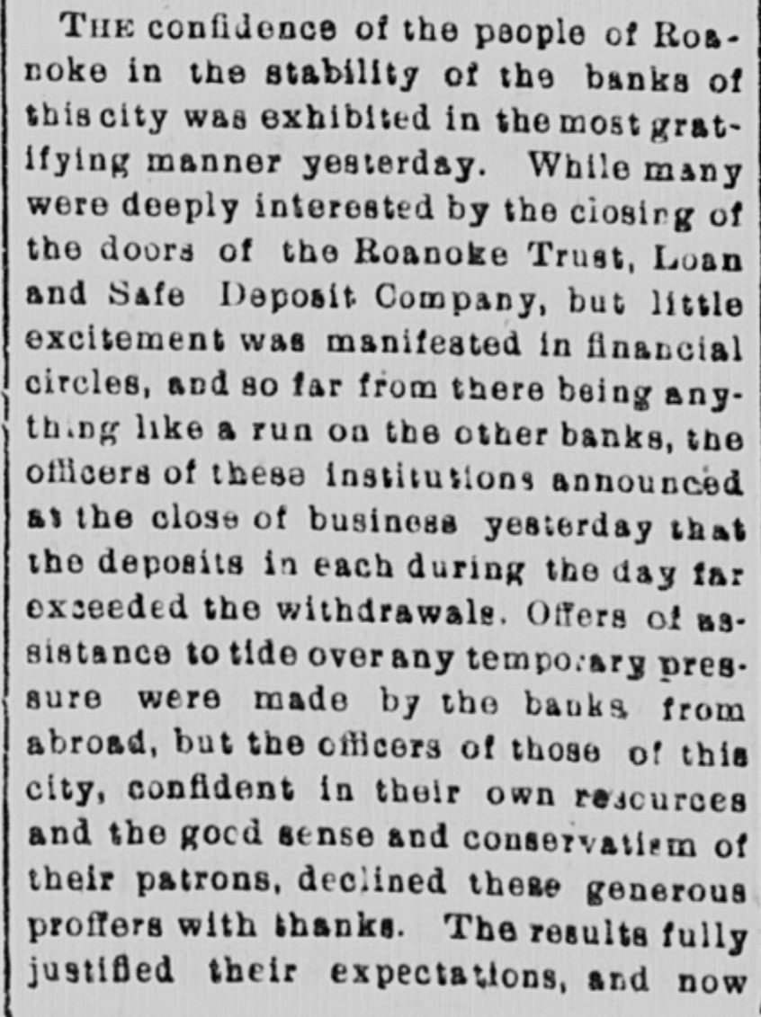 THE confidence of the people of Roanoke in the stability of the banks of this city was exhibited in the most gratifying manner yesterday. While many were deeply interested by the closing of the doors of the Roanoke Trust, Loan and Safe Deposit Company, but little excitement was manifested in financial circles, and 80 far from there being anything like a run on the other banks, the officers of these institutions announced at the close of business yesterday that the deposits in each during the day far exceeded the withdrawals. Offers of assistance to tide over any temporary pres. sure were made by the banks from abroad, but the officers of those of this city, confident in their own resources and the good sense and conservatism of their patrons, declined these generous proffers with thanks. The results fully justified their expectations, and now