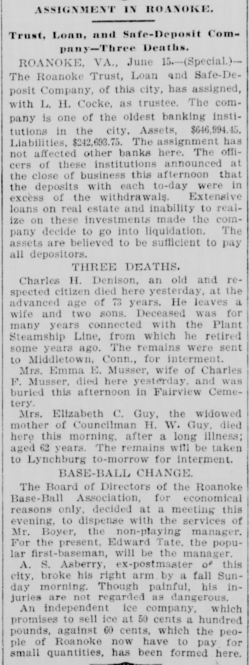 ASSIGNMENT IN ROANOKE. Trust, Loan, and Safe-Deposit Company-Three Deaths. ROANOKE, VA., June 15.-(Special.)The Roanoke Trust, Loan and Safe-Deposit Company, of this city, has assigned, with L. H. Cocke, as trustee. The company is one of the oldest banking institutions in the city. Assets, $646,994.45. Liabilities, $242,693.75. The assignment has not affected other banks here. The officers of these institutions announced at the close of business this afternoon that the deposits with each to-day were in excèss of the withdrawals. Extensive loans on real estate and inability to realize on these investments made the company decide to go into liquidation. The assets are believed to be sufficient to pay all depositors. THREE DEATHS. Charles H. Denison, an old and respected citizen died here yesterday, at the advanced age of 73 years. He leaves a wife and two sons. Deceased was for many years connected with the Plant Steamship Line, from which he retired some years ago. The remains were sent to Middletown, Conn., for interment. Mrs. Emma E. Musser, wife of Charles F. Musser, died here yesterday, and was buried this afternoon in Fairview Cemetery. Mrs. Elizabeth C. Guy, the widowed mother of Councilman H. W. Guy, died here this morning, after a long illness; aged 62 years. The remains will be taken to Lynchburg to-morrow for interment. BASE-BALL CHANGE. The Board of Directors of the Roanoke Base-Ball Association, for economical reasons only, decided at a meeting this evening, to dispense with the services of Mr. Boyer, the non-playing manager. For the present, Edward Tate, the popular first-baseman, will be the manager. A. S. Asberry, ex-postmaster OF this city, broke his right arm by a fall Sunday morning. Though painful, his injuries are not regarded as dangerous. An independent ice company, which promises to sell ice at 50 cents a hundred pounds, against 60 cents, which the people of Roanoke now have to pay for small quantities, has been formed here.