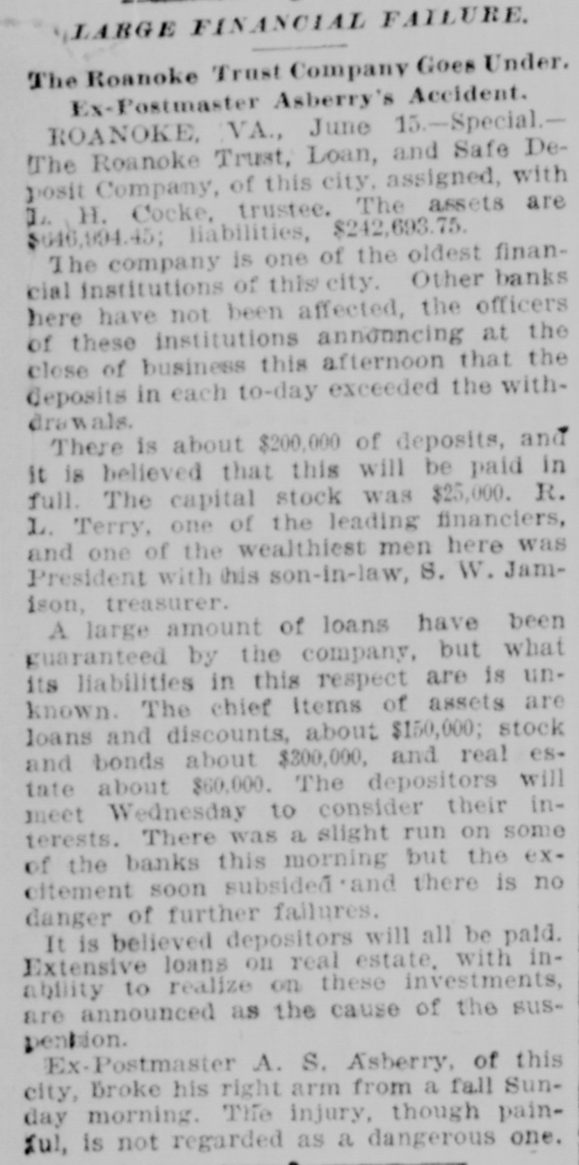 LARGE FINANCIAL FAILURE. The Roanoke Trust Company Goes Under. Ex-Postmaster Asberry's Accident. ROANOKE, VA., June 15.-Special.The Roanoke Trust, Loan, and Safe Deposit Company, of this city, assigned, with L. H. Cocke, trustee. The assets are $646,994.45; liabilities, $242,693.75. The company is one of the oldest financial institutions of this city. Other banks here have not been affected, the officers of these institutions announcing at the close of business this afternoon that the deposits in each to-day exceeded the withdrawals. There is about $200,000 of deposits, and it is believed that this will be paid in full. The capital stock was $25,000. R. L. Terry, one of the leading financiers, and one of the wealthiest men here was President with this son-in-law, S. W. Jamison, treasurer. A large amount of loans have been guaranteed by the company, but what its liabilities in this respect are is unknown. The chief Items of assets are loans and discounts, about $150,000; stock and bonds about $300,000, and real estate about $60,000. The depositors will meet Wednesday to consider their interests. There was a slight run on some of the banks this morning but the excitement soon subsided *and there is no danger of further failures. It is believed depositors will all be paid. Extensive loans on real estate. with inability to realize on these investments, are announced as the cause of the suspention. Ex-Postmaster A. S. Asberry, of this city, Broke his right arm from a fall Sunday morning. The injury, though painful, is not regarded as a dangerous one.