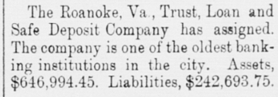 The Roanoke, Va., Trust, Loan and Safe Deposit Company has assigned. The company is one of the oldest banking institutions in the city. Assets, $646,994.45. Liabilities, $242,693.75.