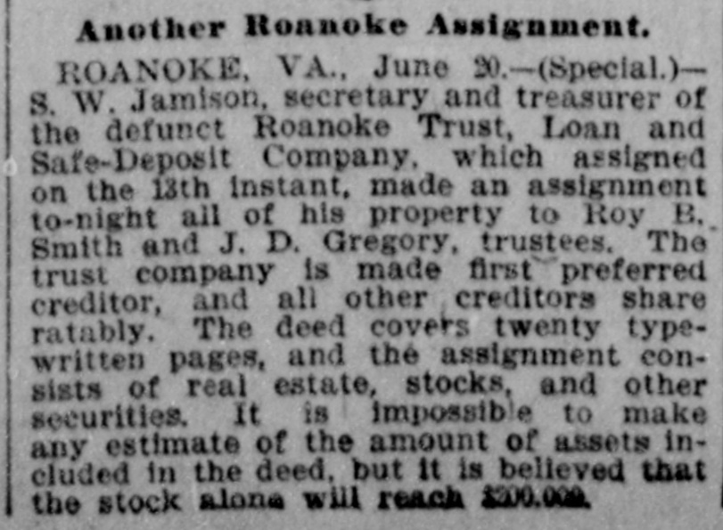 Another Roanoke Assignment. ROANOKE, VA., June 20.-(Special.)S. W. Jamison, secretary and treasurer of the defunct Roanoke Trust, Loan and Safe-Deposit Company, which assigned on the 13th instant, made an assignment to-night all of his property to Roy B. Smith and J. D. Gregory, trustees. The trust company is made first preferred creditor, and all other creditors share ratably. The deed covers twenty typewritten pages, and the assignment consists of real estate, stocks, and other securities. It is impossible to make any estimate of the amount of assets included in the deed, but it is believed that the stock alone will reach $200.000.