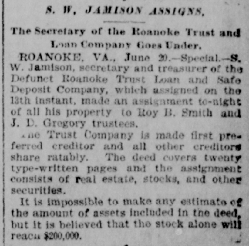 S. W. JAMISON ASSIGNS, The Secretary of the Roanoke Trust and Loan Company Goes Under. ROANOKE, VA., June 20.-Special.-S. W. Jamison, secretary and treasurer of the Defunet Roanoke Trust Loan and Safe Deposit Company, which assigned on the 13th instant, made an assignment to-night of all his property to Roy B. Smith and J. D. Gregory trustees. the Trust Company is made first preferred creditor and all other creditors share ratably. The deed covers twenty type-written pages and the assignment consists of real estate, stocks, and other securities. It is impossible to make any estimate of the amount of assets included in the deed, but it is believed that the stock alone will reacti $200,000.
