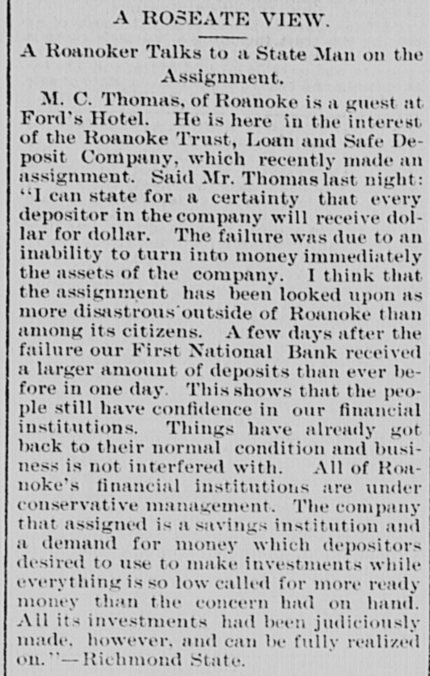 A ROSEATE VIEW. A Roanoker Talks to a State Man on the Assignment. M. C. Thomas, of Roanoke is a guest at Ford's Hotel. He is here in the interest of the Roanoke Trust, Loan and Safe Deposit Company, which recently made an assignment. Said Mr. Thomas last night: "I can state for a certainty that every depositor in the company will receive dollar for dollar. The failure was due to an inability to turn into money immediately the assets of the company. I think that the assignment has been looked upon as more disastrous outside of Roanoke than among its citizens. A few days after the failure our First National Bank received a larger amount of deposits than ever before in one day. This shows that the people still have confidence in our financial institutions. Things have already got back to their normal condition and business is not interfered with. All of Roanoke's financial institutions are under conservative management. The company that assigned is a savings institution and a demand for money which depositors desired to use to make investments while everything is so low called for more ready money than the concern had on hand. All its investments had been judiciously made, however, and can be fully realized on. Richmond State.