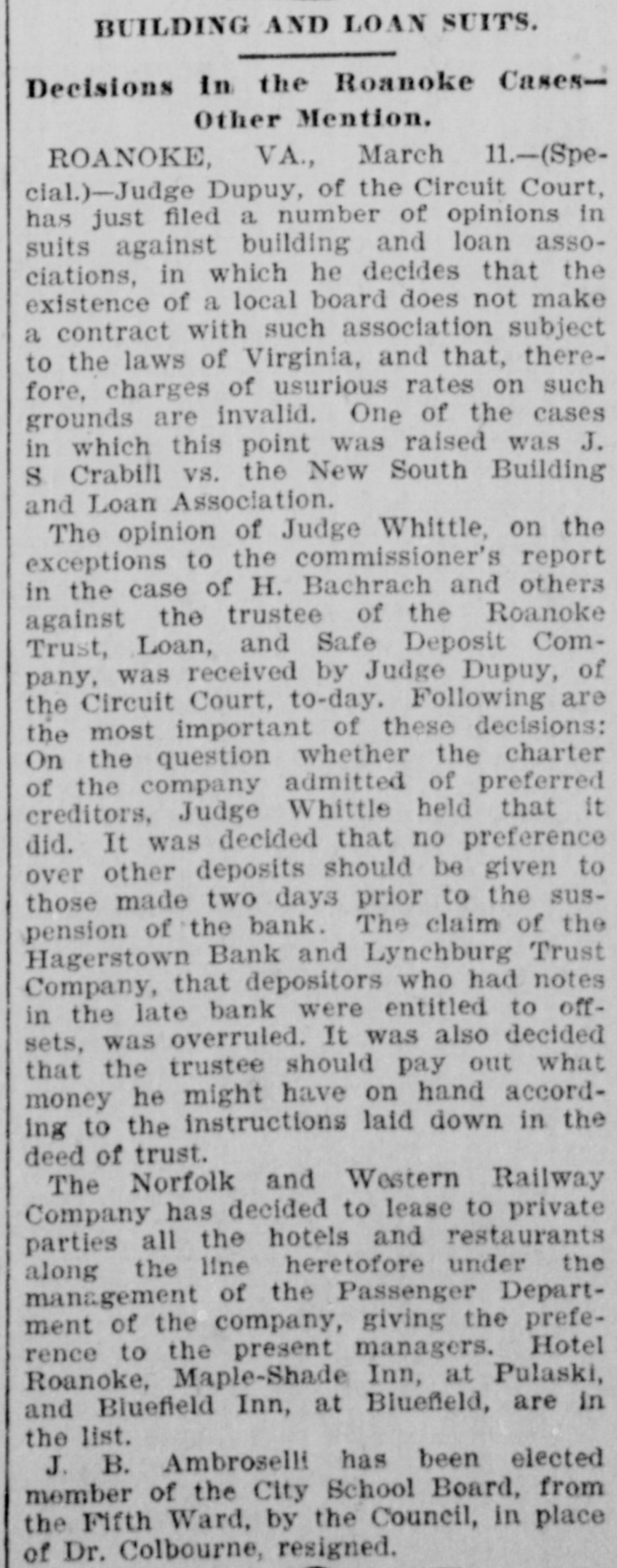 BUILDING AND LOAN SUITS. Decisions in the Roanoke CasesOther Mention. ROANOKE, VA., March 11.-(Special.)-Judge Dupuy, of the Circuit Court, has just filed a number of opinions in suits against building and loan associations, in which he decides that the existence of a local board does not make a contract with such association subject to the laws of Virginia, and that, therefore, charges of usurious rates on such grounds are invalid. One of the cases in which this point was raised was J. S Crabill vs. the New South Building and Loan Association. The opinion of Judge Whittle, on the exceptions to the commissioner's report in the case of H. Bachrach and others against the trustee of the Roanoke Trust, Loan, and Safe Deposit Company, was received by Judge Dupuy, of the Circuit Court, to-day. Following are the most important of these decisions: On the question whether the charter of the company admitted of preferred creditors, Judge Whittle held that it did. It was decided that no preference over other deposits should be given to those made two days prior to the suspension of the bank. The claim of the Hagerstown Bank and Lynchburg Trust Company, that depositors who had notes in the late bank were entitled to offsets, was overruled. It was also decided that the trustee should pay out what money he might have on hand according to the instructions laid down in the deed of trust. The Norfolk and Western Railway Company has decided to lease to private parties all the hotels and restaurants along the line heretofore under the management of the Passenger Department of the company, giving the preference to the present managers. Hotel Roanoke, Maple-Shade Inn, at Pulaski, and Bluefield Inn, at Bluefield, are in the list. J. B. Ambroselli has been elected member of the City School Board, from the Fifth Ward, by the Council, in place of Dr. Colbourne, resigned.