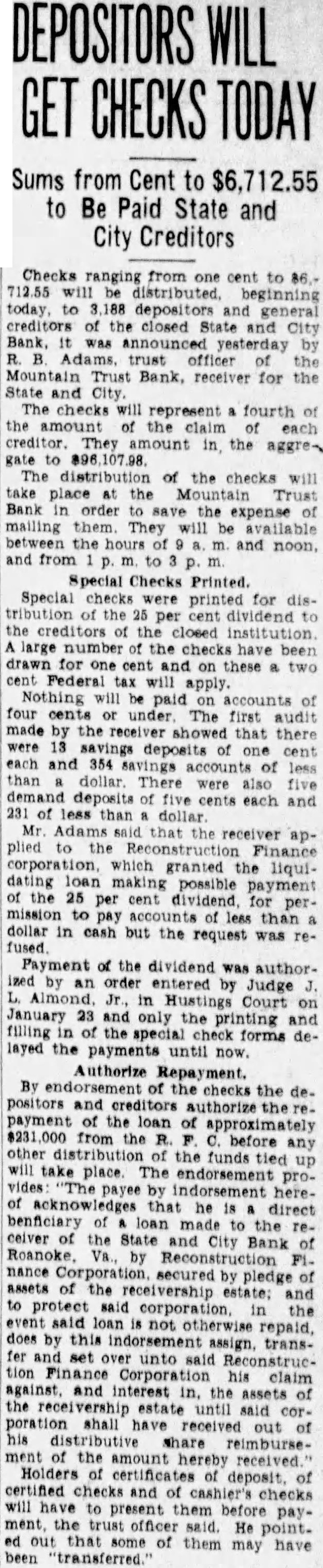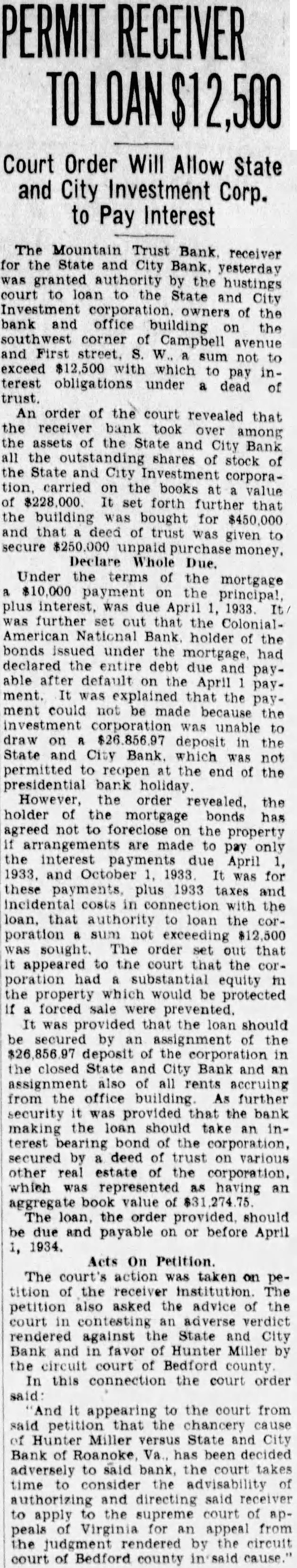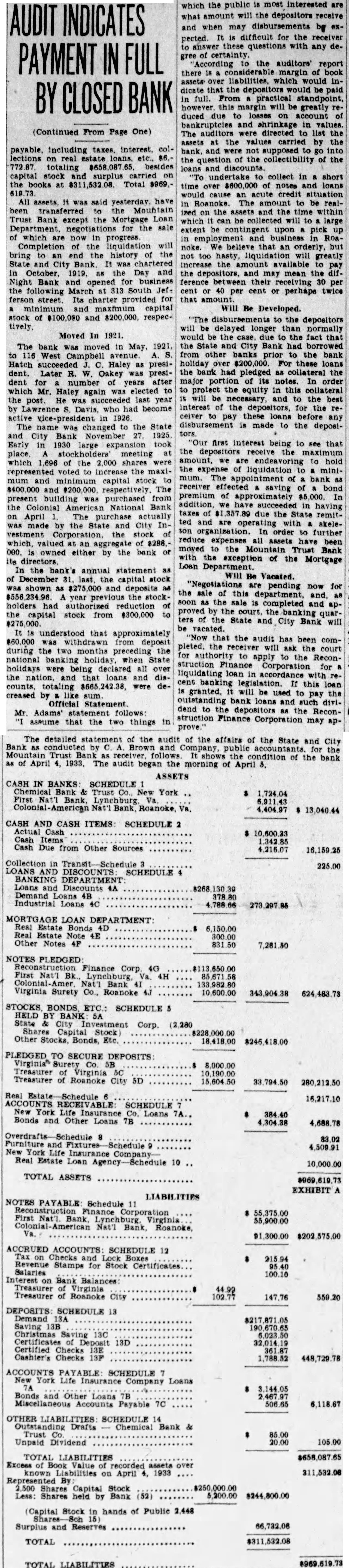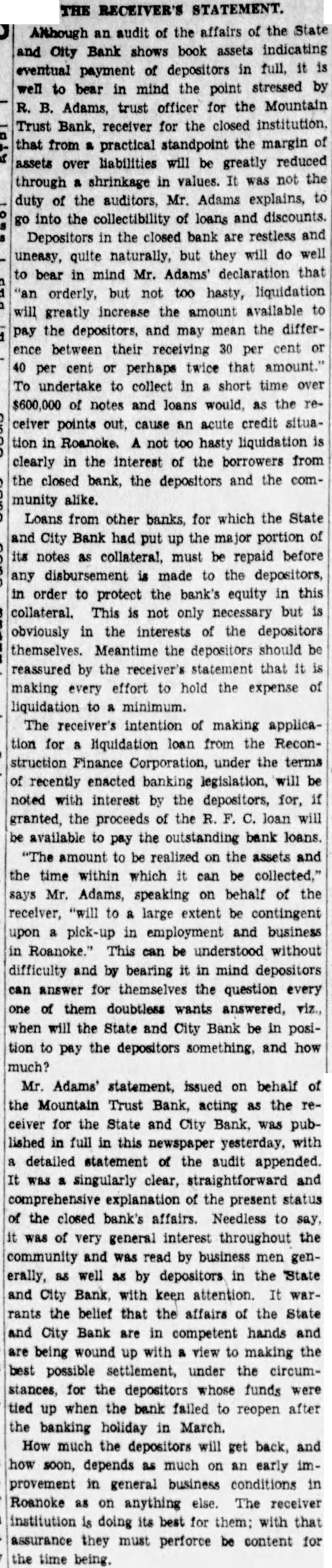 The bank was moved May. 116 West Haley Later was presiwhich Mr. Haley the year by had become The changed to the State City November 27. 1925 large expansion place. meeting which the 2,000 shares the capital and $200,000. respectively. The present purchased from the Colonial National Bank April The purchase actually by the and City vestment Corporation the valued an of owned either by bank its In the annual statement as the capital stock shown and the stock holders had capital stock from $300,000 $275,000. understood that approximately $60,000 was withdrawn from deposit during months preceding national when holidays being declared the and and diswere decreased Official Statement Mr Adams' statement follows: assume that the two things in which the public is most interested are what amount the depositors receive and when disbursements It difficult for the receiver these with any degree certainty. "According the auditors' report there margin book assets over liabilities, which indicate that the From will be greatly duced due to bankruptcies and shrinkage in values. The auditors were directed to list the assets the values carried by the and not supposed go the the collectibility of the and undertake collect in short notes and would acute credit situation Roanoke. The amount be realized on the assets and the within which can collected large extent be contingent upon pick up and an but not too will to the mean the ference between their per 40 per cent or perhaps twice that amount. WIII Be Developed. to the depositors will delayed longer than normally would the fact the City Bank had borrowed prior the For these loans the had pledged collateral portion notes. In protect equity this collateral be the best interest the for the ceiver to pay these before any disbursement is to the deposiOur first interest being to see that the the to hold the expense of liquidation mum. of receiver effected saving premium of addition, succeeded having due the State remitted are skeleIn order further assets moved the Trust Bank with exception of the Mortgage Loan Be Vacated. pending now for the sale this and, the sale completed and proved the banking ters the State and City Bank will that the audit has been comthe will ask to the Reconstruction Corporation liquidating loan accordance this granted. used to the bank and pay dend to depositors Reconstruction Finance Corporation may approve."