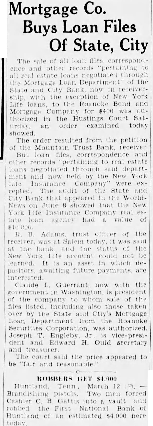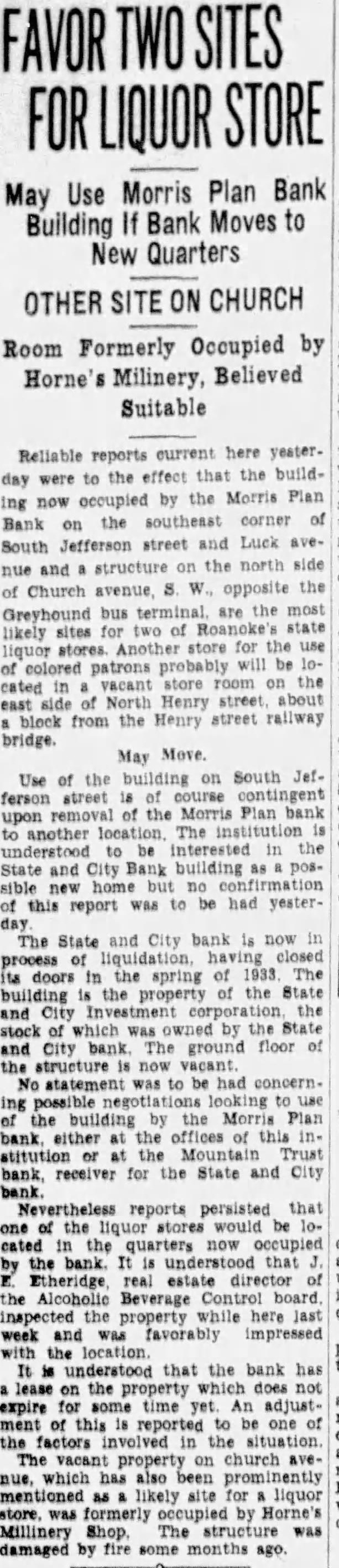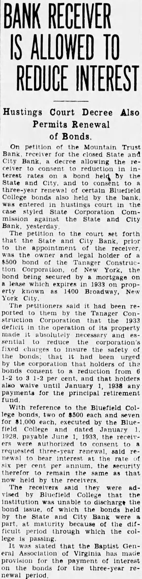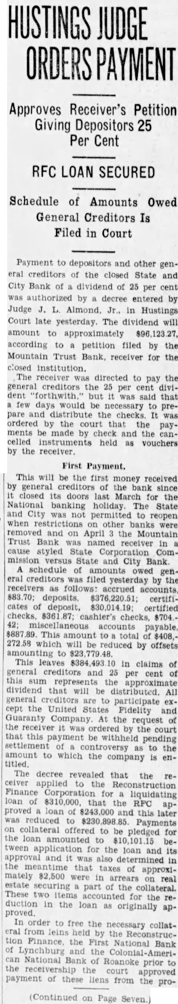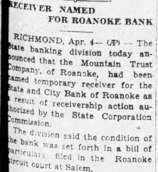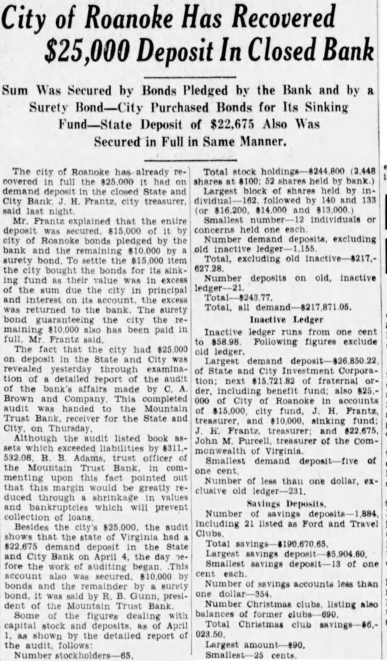 The bank was moved May. 116 West Haley Later was presiwhich Mr. Haley the year by had become The changed to the State City November 27. 1925 large expansion place. meeting which the 2,000 shares the capital and $200,000. respectively. The present purchased from the Colonial National Bank April The purchase actually by the and City vestment Corporation the valued an of owned either by bank its In the annual statement as the capital stock shown and the stock holders had capital stock from $300,000 $275,000. understood that approximately $60,000 was withdrawn from deposit during months preceding national when holidays being declared the and and diswere decreased Official Statement Mr Adams' statement follows: assume that the two things in which the public is most interested are what amount the depositors receive and when disbursements It difficult for the receiver these with any degree certainty. "According the auditors' report there margin book assets over liabilities, which indicate that the From will be greatly duced due to bankruptcies and shrinkage in values. The auditors were directed to list the assets the values carried by the and not supposed go the the collectibility of the and undertake collect in short notes and would acute credit situation Roanoke. The amount be realized on the assets and the within which can collected large extent be contingent upon pick up and an but not too will to the mean the ference between their per 40 per cent or perhaps twice that amount. WIII Be Developed. to the depositors will delayed longer than normally would the fact the City Bank had borrowed prior the For these loans the had pledged collateral portion notes. In protect equity this collateral be the best interest the for the ceiver to pay these before any disbursement is to the deposiOur first interest being to see that the the to hold the expense of liquidation mum. of receiver effected saving premium of addition, succeeded having due the State remitted are skeleIn order further assets moved the Trust Bank with exception of the Mortgage Loan Be Vacated. pending now for the sale this and, the sale completed and proved the banking ters the State and City Bank will that the audit has been comthe will ask to the Reconstruction Corporation liquidating loan accordance this granted. used to the bank and pay dend to depositors Reconstruction Finance Corporation may approve."