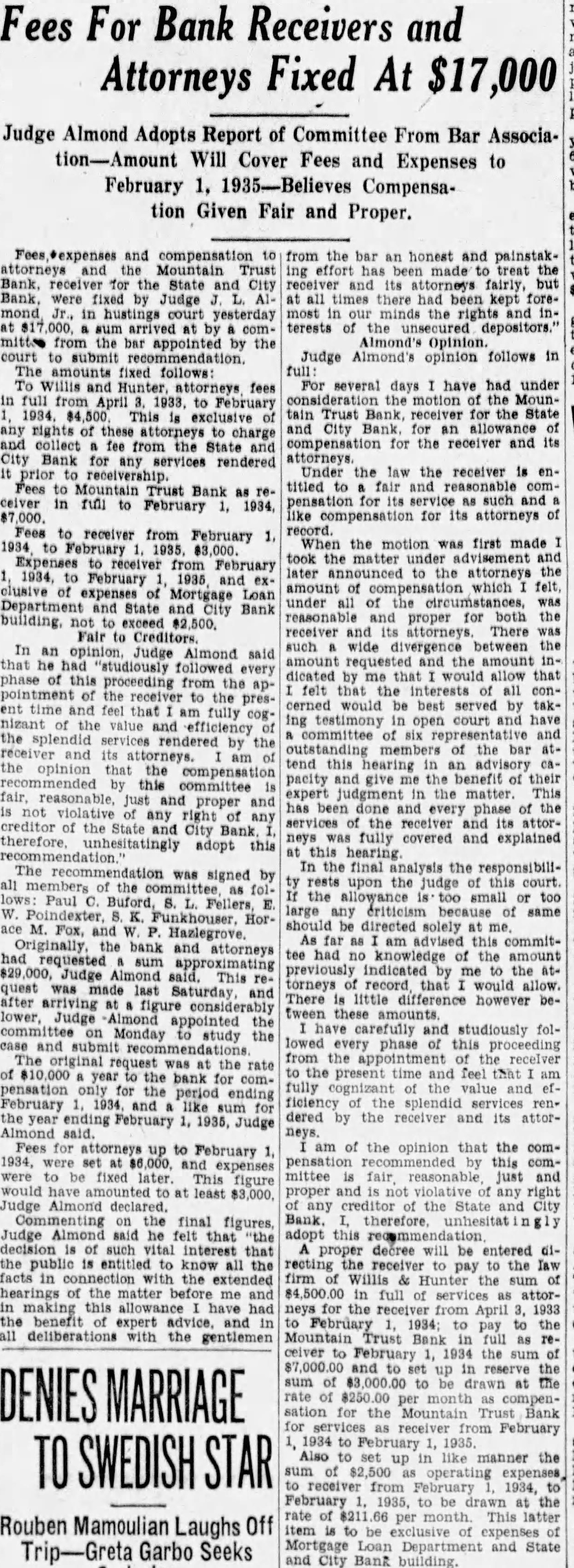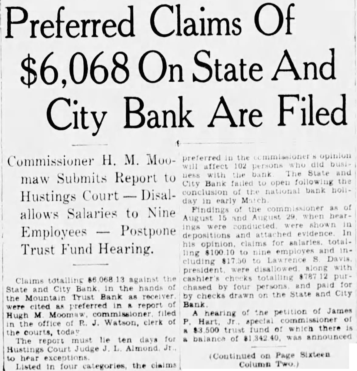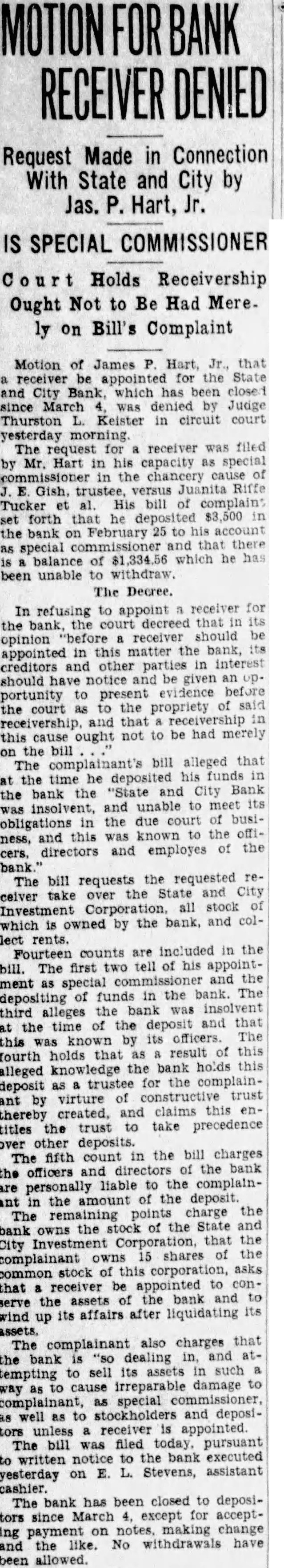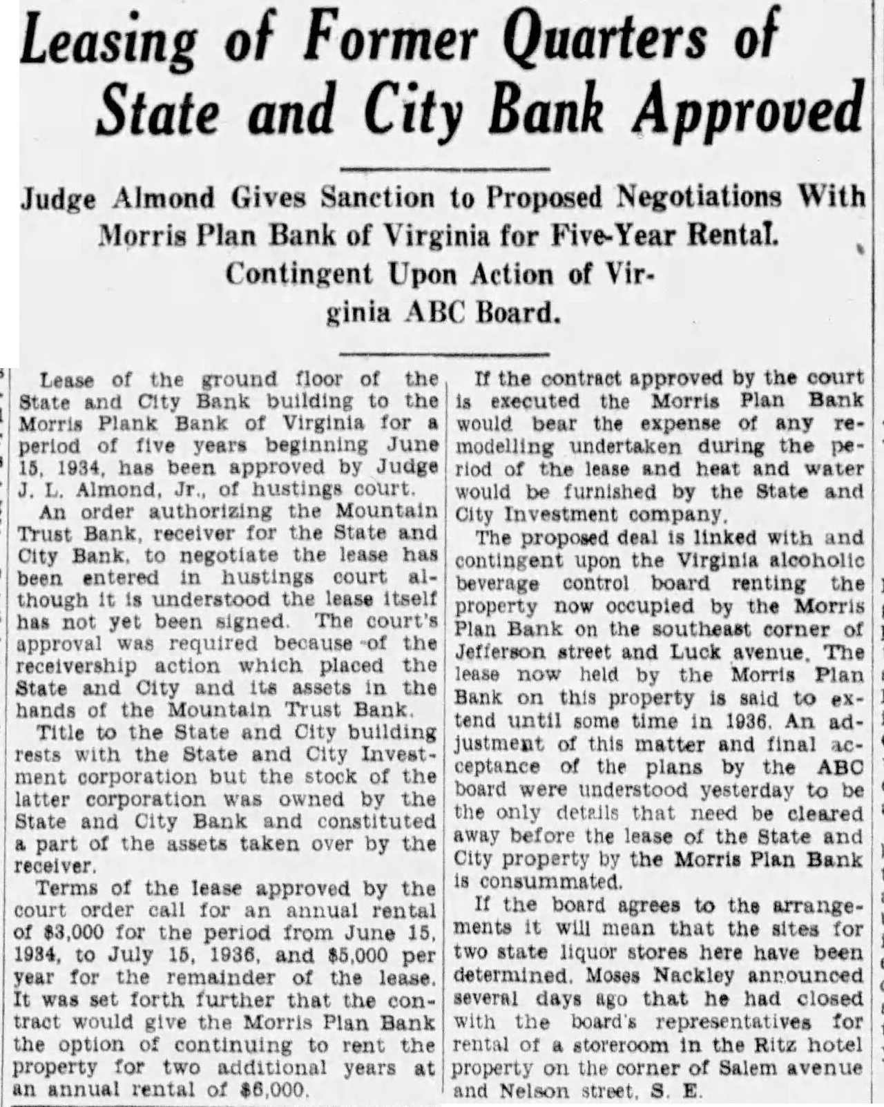 The bank was moved May. 116 West Haley Later was presiwhich Mr. Haley the year by had become The changed to the State City November 27. 1925 large expansion place. meeting which the 2,000 shares the capital and $200,000. respectively. The present purchased from the Colonial National Bank April The purchase actually by the and City vestment Corporation the valued an of owned either by bank its In the annual statement as the capital stock shown and the stock holders had capital stock from $300,000 $275,000. understood that approximately $60,000 was withdrawn from deposit during months preceding national when holidays being declared the and and diswere decreased Official Statement Mr Adams' statement follows: assume that the two things in which the public is most interested are what amount the depositors receive and when disbursements It difficult for the receiver these with any degree certainty. "According the auditors' report there margin book assets over liabilities, which indicate that the From will be greatly duced due to bankruptcies and shrinkage in values. The auditors were directed to list the assets the values carried by the and not supposed go the the collectibility of the and undertake collect in short notes and would acute credit situation Roanoke. The amount be realized on the assets and the within which can collected large extent be contingent upon pick up and an but not too will to the mean the ference between their per 40 per cent or perhaps twice that amount. WIII Be Developed. to the depositors will delayed longer than normally would the fact the City Bank had borrowed prior the For these loans the had pledged collateral portion notes. In protect equity this collateral be the best interest the for the ceiver to pay these before any disbursement is to the deposiOur first interest being to see that the the to hold the expense of liquidation mum. of receiver effected saving premium of addition, succeeded having due the State remitted are skeleIn order further assets moved the Trust Bank with exception of the Mortgage Loan Be Vacated. pending now for the sale this and, the sale completed and proved the banking ters the State and City Bank will that the audit has been comthe will ask to the Reconstruction Corporation liquidating loan accordance this granted. used to the bank and pay dend to depositors Reconstruction Finance Corporation may approve."