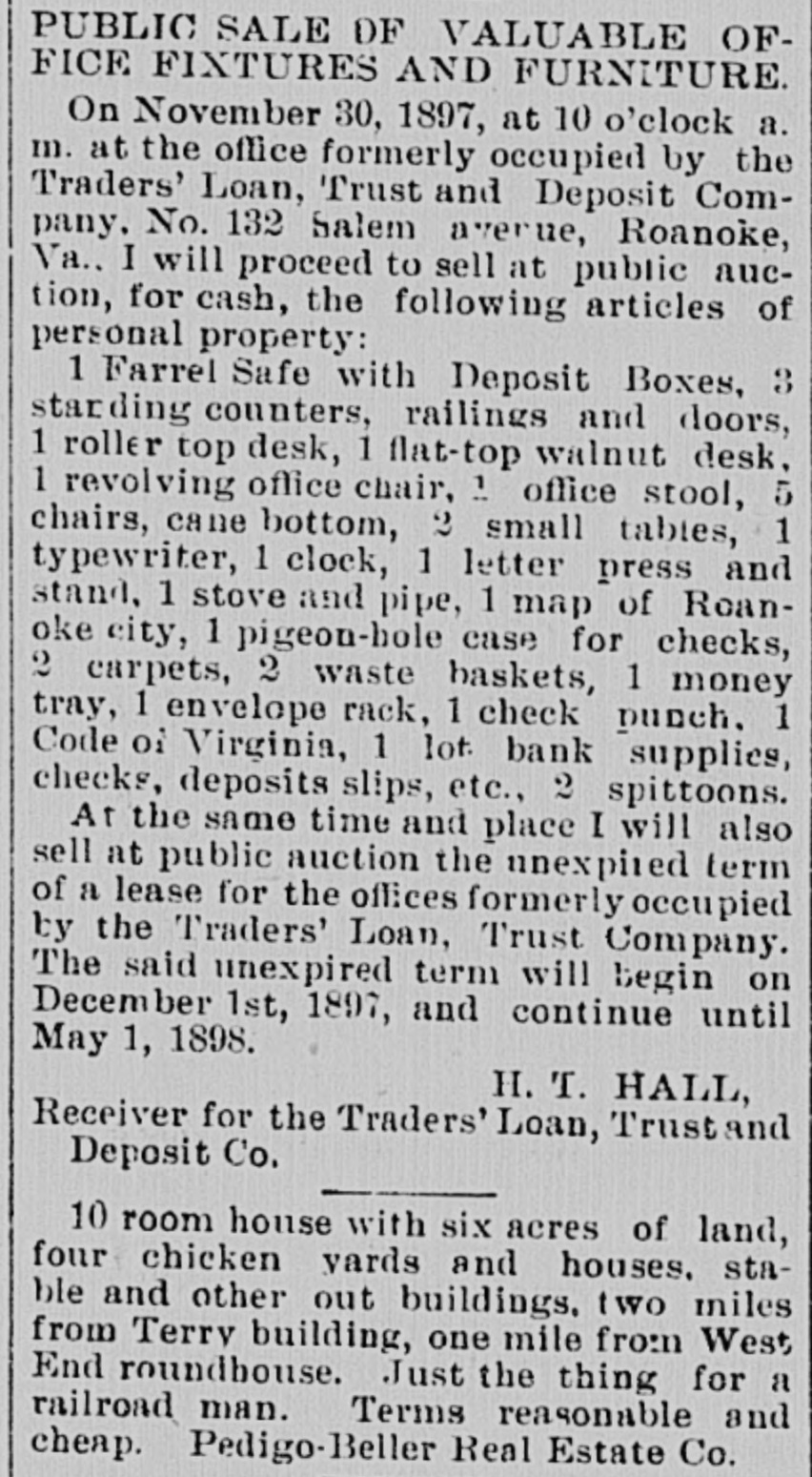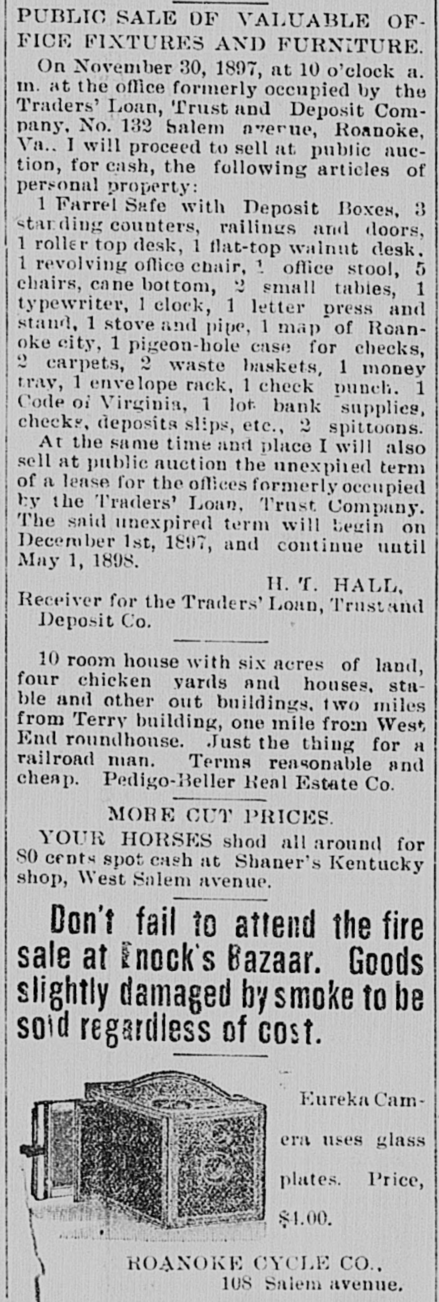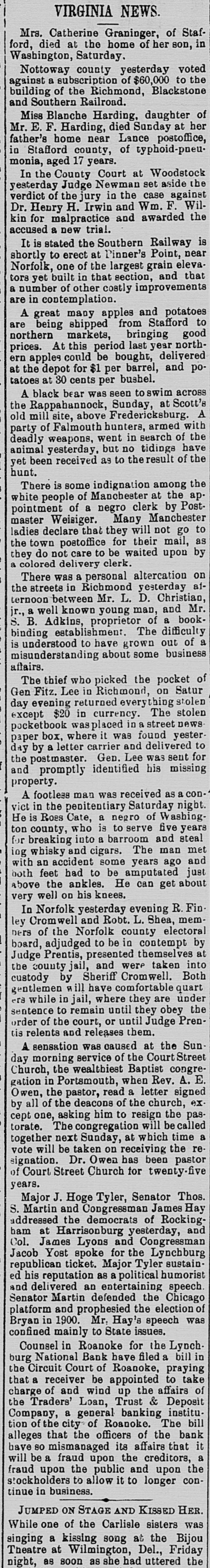 VIRGINIA NEWS. Mrs. Catherine Graninger, of Stafford, died at the home of her son, in Washington, Saturday. Nottoway county yesterday voted against a subscription of $60,000 to the building of the Richmond, Blackstone and Southern Railroad. Miss Blanche Harding, daughter of Mr. E. F. Harding, died Sunday at her father's home near Lance postoffice, in Stafford county, of typhoid-pneumonia, aged 17 years. In the County Court at Woodstock yesterday Judge Newman set aside the verdict of the jury in the case against Dr. Henry H. Irwin and Wm. F. Wilkin for malpractice and awarded the accused & new trial. It is stated the Southern Railway is shortly to erect at Pinner's Point, near Norfolk, one of the largest grain elevators yet built in that section, and that a number of other costly improvements are in contemplation. A great many apples and potatoes are being shipped from Stafford to northern markets, bringing good prices. At this period last year northern apples could be bought, delivered at the depot for $1 per barrel, and potatoes at 30 cents per bushel. A black bear was seen to swim across the Rappahannock, Sunday, at Scott's old mill site, above Fredericksburg. A party of Falmouth hunters, armed with deadly weapons, went in search of the animal yesterday. but no tidings have yet been received as to the result of the hunt. There is some indignation among the white people of Manchester at the appointment of a negro clerk by Postmaster Weisiger. Many Manchester ladies declare that they will not go to the town postoffice for their mail, as they do not care to be waited upon by a colored delivery clerk. There was a personal altercation on the streets in Richmond yesterday afternoon between Mr. L. D. Christian, jr., a well known young man, and Mr. S. B. Adkins, proprietor of a bookbinding establishment. The difficulty is understood to have grown out of a misunderstanding about some business affairs. The thief who picked the pocket of Gen Fitz. Lee in Richmond, on Satur day evening returned everything stolen except $20 in currency. The stolen pocketbook wasplaced in a street news paper box, where it was found yesterday by a letter carrier and delivered to the postmaster. Gen. Lee was sent for and promptly identified his missing property. A footless man was received as a convict in the penitentiary Saturday night. He is Roes Cate, a negro of Washington county, who is to serve five years for breaking into a barroom and steal iog whisky and cigars. The man met with an accident some years ago and both feet had to be amputated just above the ankles. He can get about very well on his knees. In Norfolk yesterday evening R. Finley Cromwell and Robt. L. Shea, memDers of the Norfolk county electoral board, adjudged to be in contempt by Judge Prentis, presented themselves at the county jail, and were taken into custody by Sheriff Cromwell. Both gentlemen ill have comfortable quart era while in jail, where they are under sentence to remain until they obey the order of the court, or until Judge Prentis relents and releases them. A sensation was caused at the Sun day morning service of the Court Street Church, the wealthiest Baptist congregation in Portsmouth, when Rev. A. E. Owen, the pastor, read a letter signed by all of the deacons of the church, except one, asking him to resign the pastorate. The congregation will becalled together next Sunday, at which time a vote will be taken on receiving the resignation. Dr. Owen has been pastor of Court Street Church for twenty-five years. Major J. Hoge Tyler, Senator Thos. S. Martin and Congressman James Hay addressed the democrats of Rocking. ham at Harrisonburg yesterday, and Col. James Lyons and Congressman Jacob Yost spoke for the Lynchburg republican ticket. Major Tyler sustain ed his reputation as a political humorist and delivered an entertaining speech. Senator Martin defended the Chicago platform and prophesied the election of Bryan in 1900. Mr. Hay's speech was confined mainly to State issues. Counsel in Roanoke for the Lynchburg National Bank have filed a bill in the Circuit Court of Roanoke, praying that a receiver be appointed to take charge of and wind up the affairs of the Traders' Loan, Trust & Deposit Company, a general banking institution of the city of Roanoke. The bill alleges that the officers of the bank have SO mismanaged its affairs that it will be a fraud upon the creditors, a fraud upon the public and upon the stockholders to allow it to longer continue in business. JUMPED ON STAGE AND KISSED HER. While one of the Carlisle sisters was singing a kissing song at the Bijou Theatre at Wilmington Del Fridav