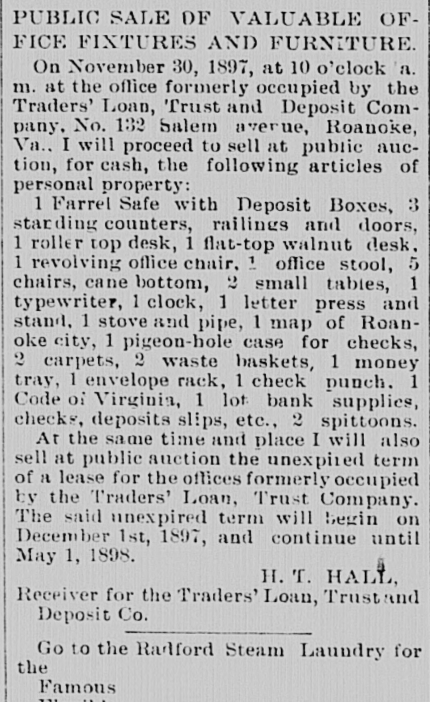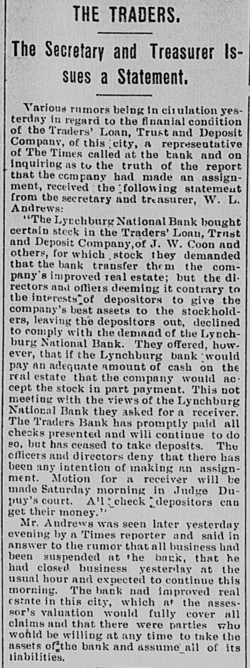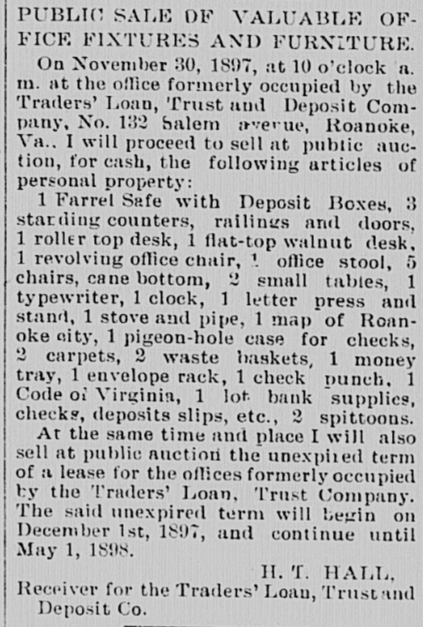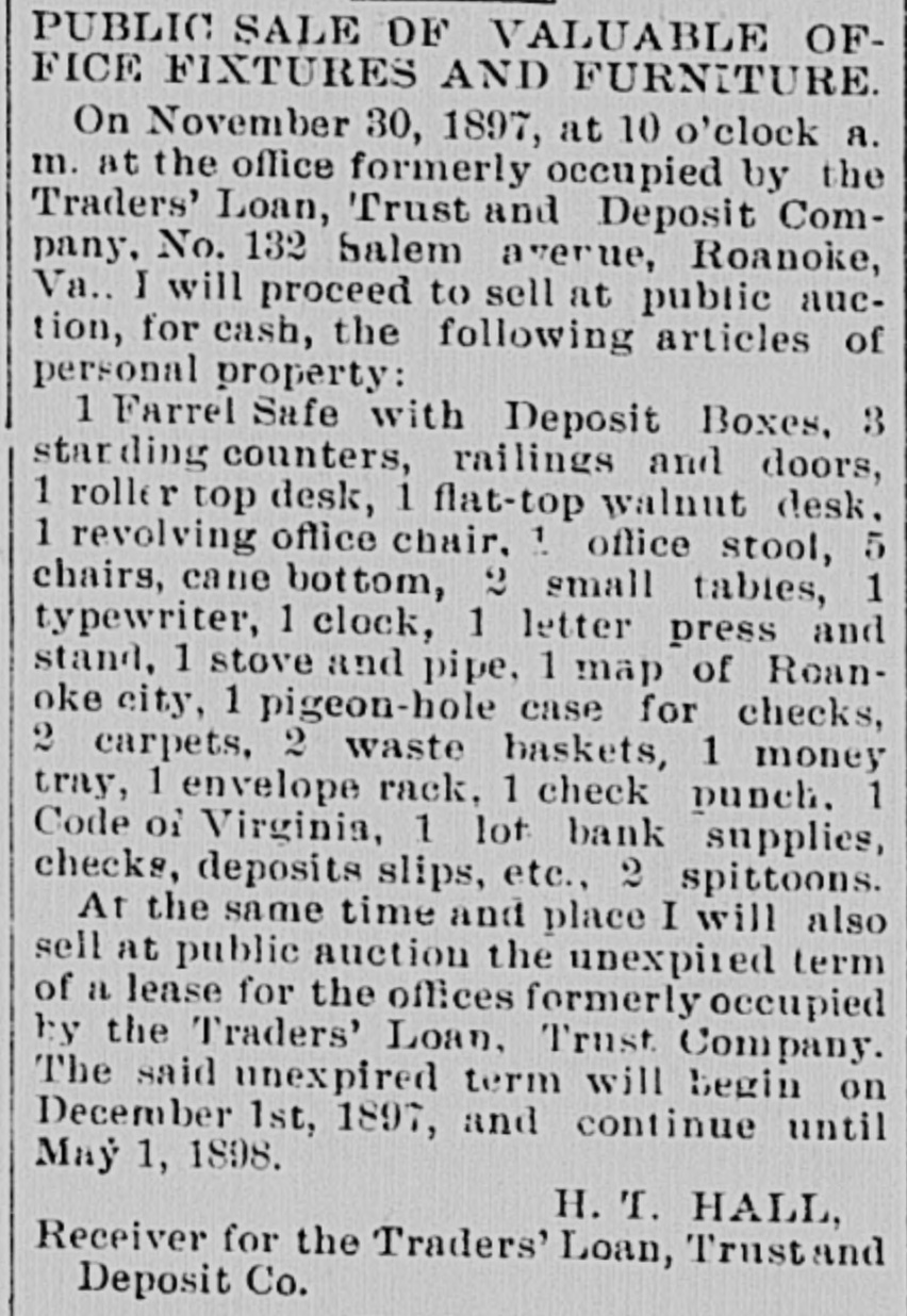 VIRGINIA NEWS. Mrs. Catherine Graninger, of Stafford, died at the home of her son, in Washington, Saturday. Nottoway county yesterday voted against a subscription of $60,000 to the building of the Richmond, Blackstone and Southern Railroad. Miss Blanche Harding, daughter of Mr. E. F. Harding, died Sunday at her father's home near Lance postoffice, in Stafford county, of typhoid-pneumonia, aged 17 years. In the County Court at Woodstock yesterday Judge Newman set aside the verdict of the jury in the case against Dr. Henry H. Irwin and Wm. F. Wilkin for malpractice and awarded the accused & new trial. It is stated the Southern Railway is shortly to erect at Pinner's Point, near Norfolk, one of the largest grain elevators yet built in that section, and that a number of other costly improvements are in contemplation. A great many apples and potatoes are being shipped from Stafford to northern markets, bringing good prices. At this period last year northern apples could be bought, delivered at the depot for $1 per barrel, and potatoes at 30 cents per bushel. A black bear was seen to swim across the Rappahannock, Sunday, at Scott's old mill site, above Fredericksburg. A party of Falmouth hunters, armed with deadly weapons, went in search of the animal yesterday. but no tidings have yet been received as to the result of the hunt. There is some indignation among the white people of Manchester at the appointment of a negro clerk by Postmaster Weisiger. Many Manchester ladies declare that they will not go to the town postoffice for their mail, as they do not care to be waited upon by a colored delivery clerk. There was a personal altercation on the streets in Richmond yesterday afternoon between Mr. L. D. Christian, jr., a well known young man, and Mr. S. B. Adkins, proprietor of a bookbinding establishment. The difficulty is understood to have grown out of a misunderstanding about some business affairs. The thief who picked the pocket of Gen Fitz. Lee in Richmond, on Satur day evening returned everything stolen except $20 in currency. The stolen pocketbook wasplaced in a street news paper box, where it was found yesterday by a letter carrier and delivered to the postmaster. Gen. Lee was sent for and promptly identified his missing property. A footless man was received as a convict in the penitentiary Saturday night. He is Roes Cate, a negro of Washington county, who is to serve five years for breaking into a barroom and steal iog whisky and cigars. The man met with an accident some years ago and both feet had to be amputated just above the ankles. He can get about very well on his knees. In Norfolk yesterday evening R. Finley Cromwell and Robt. L. Shea, memDers of the Norfolk county electoral board, adjudged to be in contempt by Judge Prentis, presented themselves at the county jail, and were taken into custody by Sheriff Cromwell. Both gentlemen ill have comfortable quart era while in jail, where they are under sentence to remain until they obey the order of the court, or until Judge Prentis relents and releases them. A sensation was caused at the Sun day morning service of the Court Street Church, the wealthiest Baptist congregation in Portsmouth, when Rev. A. E. Owen, the pastor, read a letter signed by all of the deacons of the church, except one, asking him to resign the pastorate. The congregation will becalled together next Sunday, at which time a vote will be taken on receiving the resignation. Dr. Owen has been pastor of Court Street Church for twenty-five years. Major J. Hoge Tyler, Senator Thos. S. Martin and Congressman James Hay addressed the democrats of Rocking. ham at Harrisonburg yesterday, and Col. James Lyons and Congressman Jacob Yost spoke for the Lynchburg republican ticket. Major Tyler sustain ed his reputation as a political humorist and delivered an entertaining speech. Senator Martin defended the Chicago platform and prophesied the election of Bryan in 1900. Mr. Hay's speech was confined mainly to State issues. Counsel in Roanoke for the Lynchburg National Bank have filed a bill in the Circuit Court of Roanoke, praying that a receiver be appointed to take charge of and wind up the affairs of the Traders' Loan, Trust & Deposit Company, a general banking institution of the city of Roanoke. The bill alleges that the officers of the bank have SO mismanaged its affairs that it will be a fraud upon the creditors, a fraud upon the public and upon the stockholders to allow it to longer continue in business. JUMPED ON STAGE AND KISSED HER. While one of the Carlisle sisters was singing a kissing song at the Bijou Theatre at Wilmington Del Fridav