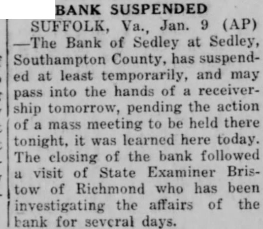 BANK SUSPENDED SUFFOLK, Va., Jan. (AP) Bank of Sedley at Sedley, Southampton County, has suspendat least temporarily, and may pass into the hands of receivership tomorrow, pending the action of mass meeting to be held there tonight, it was learned here today. The closing of the bank followed visit of State Examiner Bristow of Richmond who has been investigating the affairs of the bank for several days.