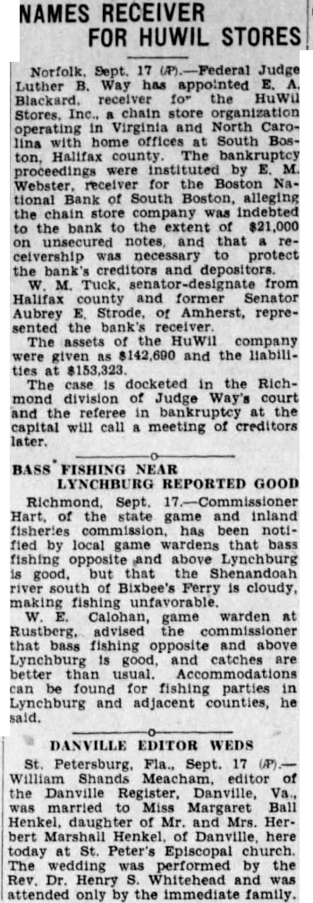 Norfolk. Sept. 17 Federal Judge Luther B. Way has appointed E. A. Blackard. receiver for the HuWil Stores. Inc. chain store operating in Virginia and North Carolina with home offices at South Boston, Halifax county The bankruptcy proceedings were instituted by E. M. Webster, receiver for the Boston National Bank of South Boston, alleging the chain store company was indebted to the bank to the extent of $21,000 on and that receivership was necessary to protect the bank's creditors and depositors. W. M. Tuck, senator-designate from Halifax county and former Senator Aubrey E. Strode, of Amherst, represented the bank's receiver. The of the HuWil company were given as $142,690 and the liabilities at $153,323. The case is docketed in the Richmond division of Judge Way's court and the referee in bankruptcy at the capital will call a meeting of creditors later.
