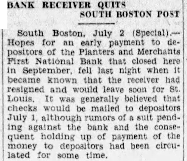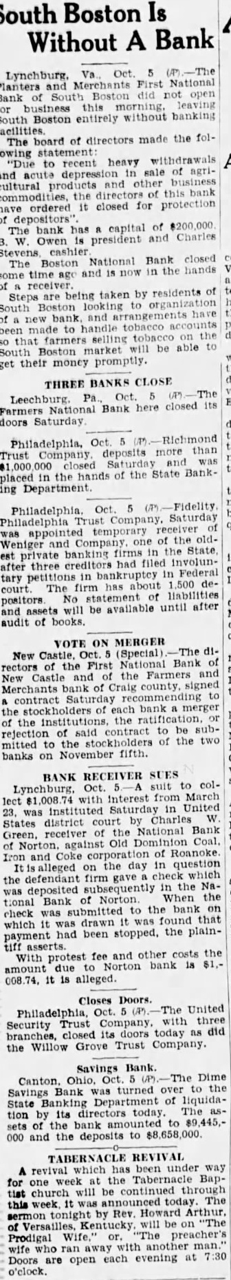 South Boston Is Without A Bank First National Planters South did not Bank business this without banking South Boston entirely facilities of made the The board directors lowing statement withdrawals to recent heavy acute cultural this the closed for ordered capital of The bank has and Charles Owen president cashier National Bank closed The Boston the hands time and residents of tel are being taken to organization South Boston looking and been made to the farmers will be able get their money promptly. THREE BANKS CLOSE here closed its Farmers Bank Philadelphia, Oct. Trust deposits the State Bankthe hands of placed ing Department Trust Company. Saturday appointed temporary Weniger banking after private three had filed involun- Federal in tary 500 decourt The liabilities No statement positors available until after be audit of books. VOTE ON MERGER New (Special) First National Bank the Castle and the Farmers Craig signed Merchants of contract Saturday each bank merger stockholders the institutions, the ratification. of contract to rejection of the two mitted the banks on November fifth. BANK RECEIVER suit colOct. interest from March lect with Saturday in United was instituted district court Charles States the National Bank receiver of Green, Old Coal. of Roanoke salleged on the day in question which firm check the defendant in the NaWhen the tional Bank submitted to the bank check which it was was drawn that the plainpayment had been asserts. and other costs the fee Norton is it alleged. Closes Philadelphia, United three Trust with Security today did closed Willow Grove Trust Company. Savings Bank. Dime Canton. turned over the Bank was Department of liquidaState Banking directors today. The tion by its bank to of the 000 and the deposits to has been under way the Tabernacle Bapone be continued through church will today. sermon tonight by Rev. Howard Arthur. Prodigal each evening at 7:30 Doors open o'clock.