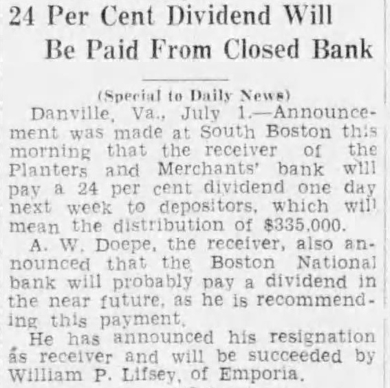 24 Per Cent Dividend Will Be Paid From Closed Bank Special Daily News) Danville AnnounceSouth Boston this morning receiver of the Planters and Merchants bank will per one day next week to depositors. which the distribution $335,000 Doepe, the also anthat the Boston National bank will probably pay dividend in the near future. as is recommend. ing this payment He his resignation as and will succeeded by William P. Lifsey Emporia