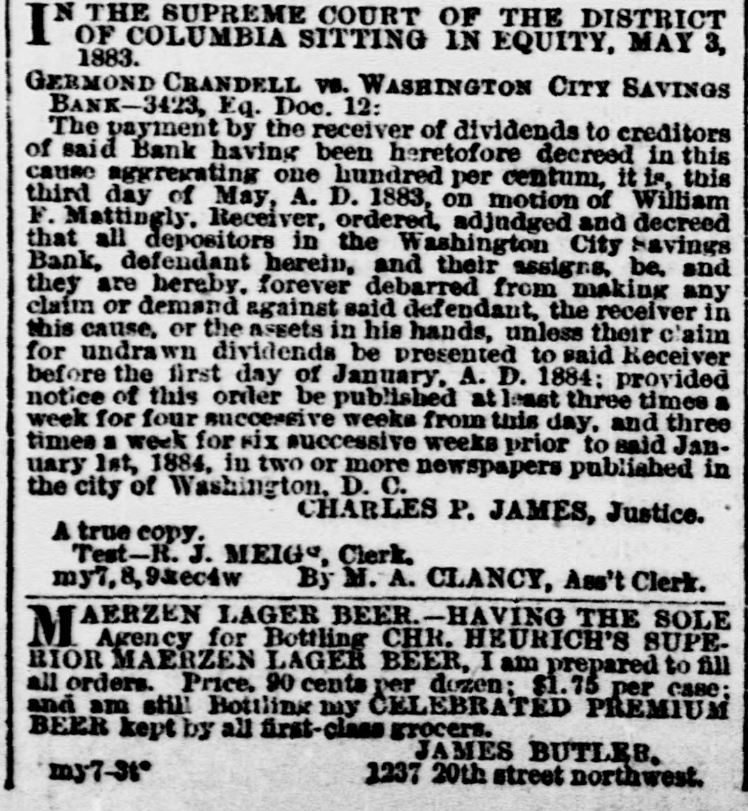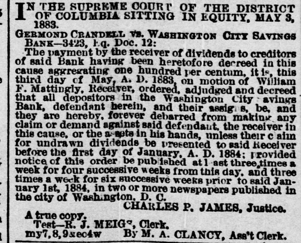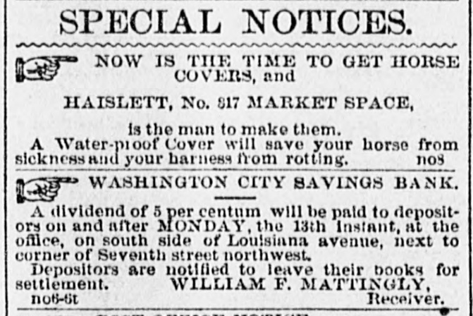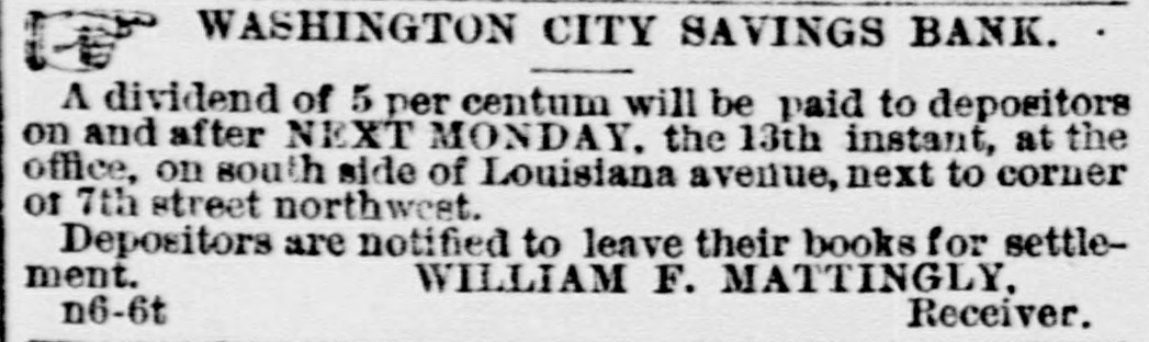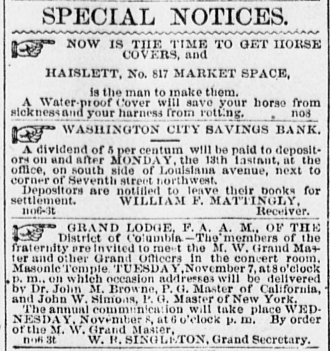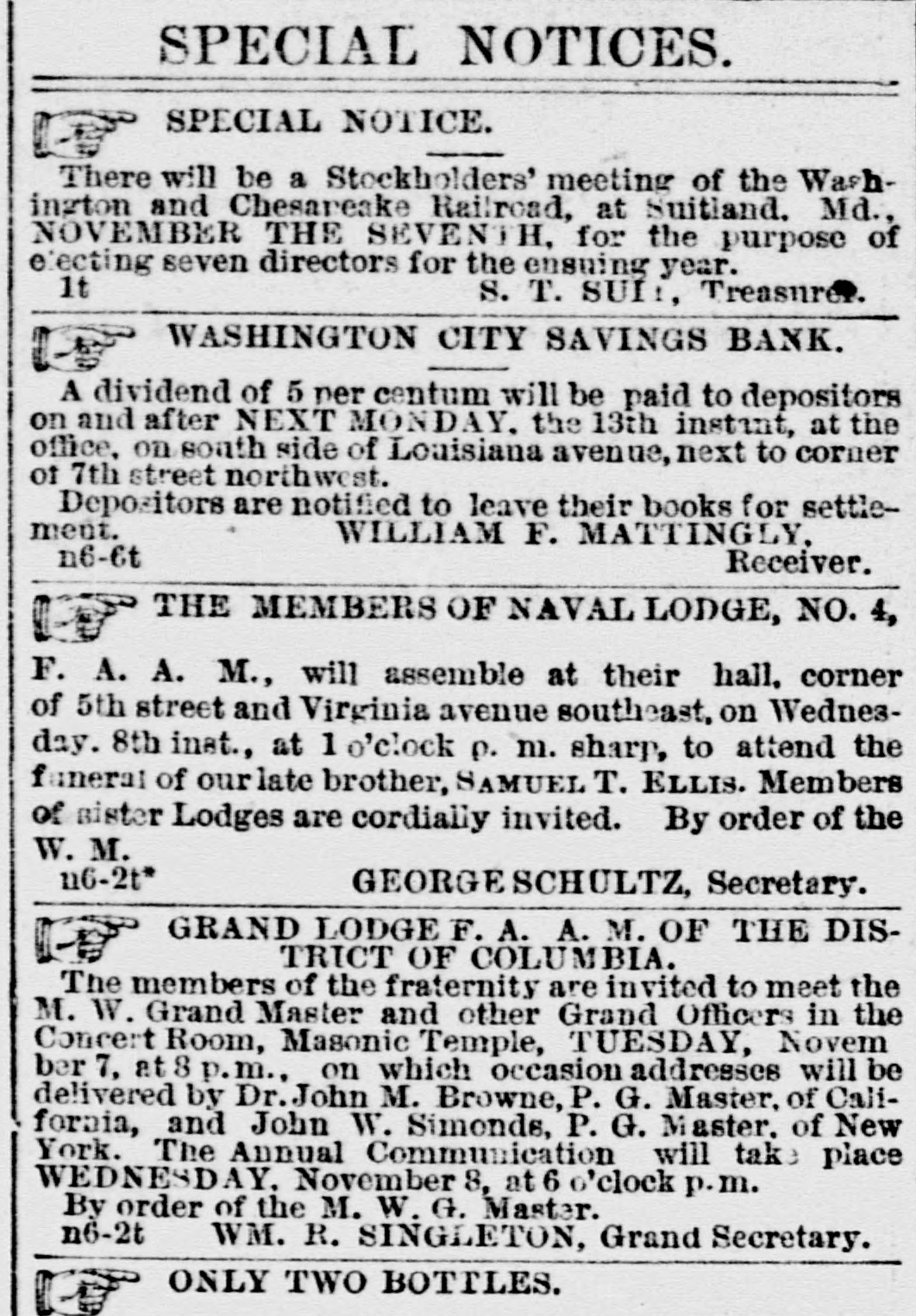 SPECIAL NOTICES. SPECIAL NOTICE. There will be a Stockholders' meeting of the Washinrton and Chesareake Railroad, at Suitland. Md., NOVEMBER THE SEVENTH, for the purpose of electing seven directors for the ensuing year. 1t S. T. SUI:, Treasurer. WASHINGTON CITY SAVINGS BANK. A dividend of 5 per centum will be paid to depositors on and after NEXT MONDAY, the 13th instant, at the office, on soath side of Louisiana avenue, next to corner of 7th street northwest. Depositors are notified to leave their books for settlement. WILLIAM F. MATTINGLY, n6-6t Receiver. THE MEMBERS OF NAVAL LODGE, NO. 4, F. A. A. M., will assemble at their hall, corner of 5th street and Virginia avenue southeast, on Wednesday. 8th inst., at 1 o'clock p. m. sharp, to attend the faneral of ourlate brother, SAMUEL T. ELLIS. Members of sister Lodges are cordially invited. By order of the W. M. 1662 GEORGE SCHULTZ, Secretary. GRAND LODGE F. A. A. M. OF THE DISTRICT OF COLUMBIA. The members of the fraternity are invited to meet the M. W. Grand Master and other Grand Officers in the Concert Room, Masonic Temple, TUESDAY, Novem ber 7, at 8 p.m., on which occasion addresses will be delivered by Dr.John M. Browne, P. G. Master, of Califoraia, and John W. Simonds, P. G. Master. of New York. The Annual Communication will take place WEDNESDAY. November 8, at 6 o'clock p.m. By order of the M. W. G. Master. n6-2t WM. R. SINGLETON, Grand Secretary. ONLY TWO BOTTLES. H
