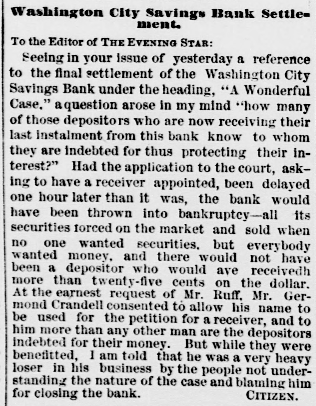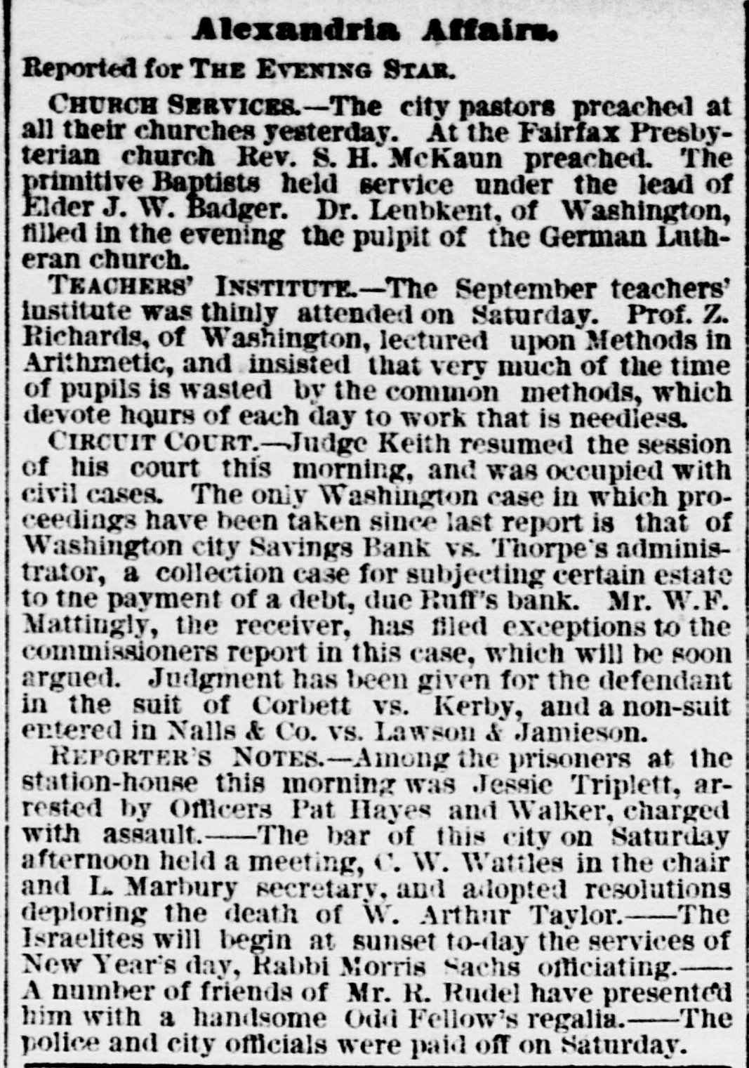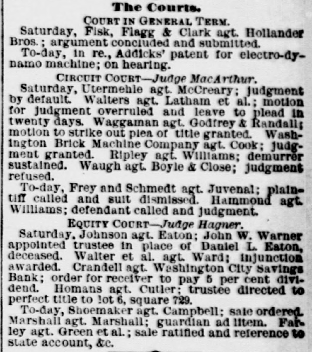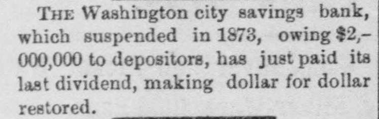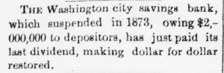 SPECIAL NOTICES. SPECIAL NOTICE. There will be a Stockholders' meeting of the Washinrton and Chesareake Railroad, at Suitland. Md., NOVEMBER THE SEVENTH, for the purpose of electing seven directors for the ensuing year. 1t S. T. SUI:, Treasurer. WASHINGTON CITY SAVINGS BANK. A dividend of 5 per centum will be paid to depositors on and after NEXT MONDAY, the 13th instant, at the office, on soath side of Louisiana avenue, next to corner of 7th street northwest. Depositors are notified to leave their books for settlement. WILLIAM F. MATTINGLY, n6-6t Receiver. THE MEMBERS OF NAVAL LODGE, NO. 4, F. A. A. M., will assemble at their hall, corner of 5th street and Virginia avenue southeast, on Wednesday. 8th inst., at 1 o'clock p. m. sharp, to attend the faneral of ourlate brother, SAMUEL T. ELLIS. Members of sister Lodges are cordially invited. By order of the W. M. 1662 GEORGE SCHULTZ, Secretary. GRAND LODGE F. A. A. M. OF THE DISTRICT OF COLUMBIA. The members of the fraternity are invited to meet the M. W. Grand Master and other Grand Officers in the Concert Room, Masonic Temple, TUESDAY, Novem ber 7, at 8 p.m., on which occasion addresses will be delivered by Dr.John M. Browne, P. G. Master, of Califoraia, and John W. Simonds, P. G. Master. of New York. The Annual Communication will take place WEDNESDAY. November 8, at 6 o'clock p.m. By order of the M. W. G. Master. n6-2t WM. R. SINGLETON, Grand Secretary. ONLY TWO BOTTLES. H