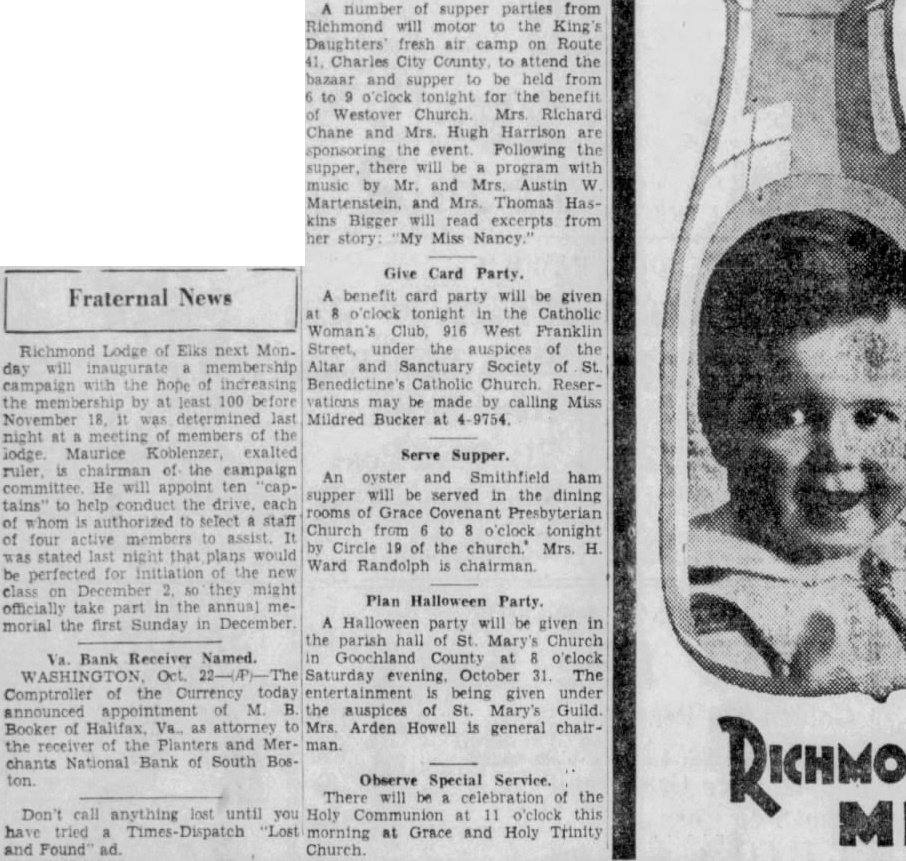Give Card Party. A benefit card party be given o'clock tonight the Catholic Woman's 916 West Richmond Lodge of Elks next Mon. Street, the of day Altar and Sanctuary Society of with hope of campaign the by at least vations be made by Miss Mildred Bucker at 9754 night at meeting members of the Maurice exalted Serve Supper. is chairman of the eampaign An oyster Smithfield ham committee He appoint ten supper will served the dining to conduct the each rooms of Grace Covenant whom to staff Church to tonight of four members to assist Circle 19 of the church. Mrs. H. stated last plans would Ward Randolph is chairman be perfected for the new class on December might Plan Halloween Party. officially part in the annual the first in A Halloween party be given in the parish of Mary's Church Va. Bank Receiver Named Goochland County The Saturday October 31 The Comptroller of the Currency today being given under announced appointment M. the of Mary's Booker of attorney Mrs. Arden Howell general chairthe the Planters and Merchants National Bank of South BosObserve Special Service.