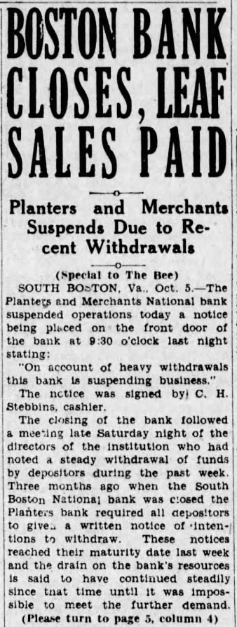 (Special to The Bee) SOUTH Oct. Planters Merchants National bank suspended operations today notice being placed on the front door bank o'clock night stating: account of heavy withdrawals bank suspending business." The signed Stebbins, cashier. closing the bank followed meeting Saturday night of the directors the institution who had noted steady withdrawal of funds depositors during the past Three months South Boston National bank closed the Planters required depositors written notice tions withdraw. These notices reached their maturity date last week and the drain on the bank's resources continued steadily since that time until was imposmeet the further demand. (Please turn to page column