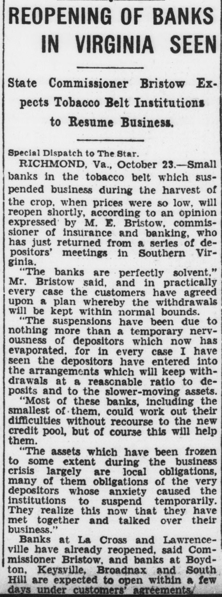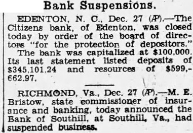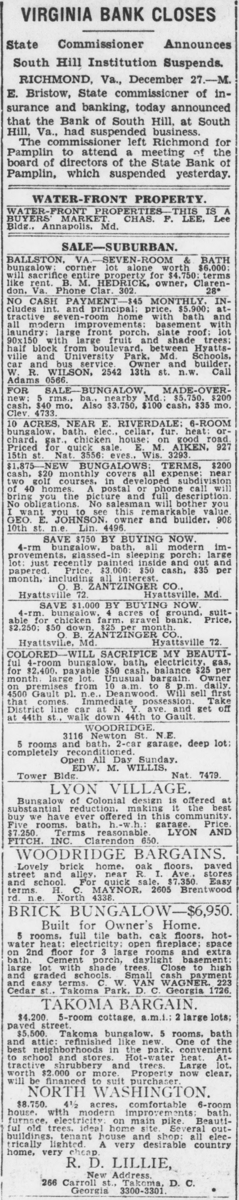 VIRGINIA BANK CLOSES State Commissioner Announces South Hill Institution Suspends. RICHMOND, Va., December 27.-M. E. Bristow, State commissioner of insurance and banking, today announced that the Bank of South Hill, at South Hill, Va., had suspended business. The commissioner left Richmond for Pamplin to attend a meeting of the board of directors of the State Bank of Pamplin, which suspended yesterday. WATER-FRONT PROPERTY. WATER-FRONT PROPERTIES-THIS IS A BUYERS MARKET CHAS. F. LEE, Lee Bldg., Annapolis, Md. SALE-SUBURBAN. BALLSTON, VA.-SEVEN-ROOM & BATH bungalow; corner lot alone worth $6,000: will sacrifice entire property for $4,750 terms like rent. B. M. HEDRICK, owner, Clarendon. Va. Phone Clar. 302. 28* NO CASH PAYMENT-$45 MONTHLY. INcludes int. and principal; price, $5,900; attractive seven-room home with bath and all modern improvements: basement with laundry; large front porch. slate roof; lot 90x150 with large fruit and shade trees; half block from boulevard, between Hyattsville and University Park, Md. Schools, car and bus service Owner and builder, W. R. WILSON, 2542 13th st. n.w. Call Adams 0566. FOR SALE-BUNGALOW, MADE-OVERnew: 5 rms., ba., nearby Md.; $5.750. $200 cash, $40 mo. Also $3,750, $100 cash, $35 mo. Clev. 4733. 10 ACRES, NEAR E. RIVERDALE: 6-ROOM bungalow, bath. elec., cellar, fur. heat; orchard. gar., chicken house: on good road. Priced for quick sale. E. M. AIKEN, 927 15th st. Nat. 3556: eves., Wis. 3293. $1,875 NEW BUNGALOWS: TERMS, $200 cash, $20 monthly covers all expense: near two golf courses. in developed subdivision of 40 homes. A postal or phone call will bring you the picture and full description. No obligations. No salesman will bother you I want you to see this remarkable value. GEO. E. JOHNSON. owner and builder. 308 10th st. n.e. Lin. 4496. SAVE $750 BY BUYING NOW. 4-rm bungalow, bath. all modern improvements, glassed-in sleeping porch; large lot: just recently painted inside and out and papered. Price. $3,000: $50 cash, $35 per month, including all interest. O. B. ZANTZINGER CO., Hyattsville, Md. Hyattsville 72. SAVE $1,000 BY BUYING NOW. 4-rm. bungalow, 4 acres of ground, suitable for chicken farm. gravel bank. Price, $2,250; $50 down, $25 per month. O. B. ZANTZINGER CO., Hyattsville 72. Hyattsvile, Md. COLORED-WILL SACRIFICE MY BEAUTIful 4-room bungalow. bath, electricity, gas, for $2,400. payable $50 cash, balance $25 per month. large lot. Unusual bargain. Owner on premises from 10 a.m. to 8 p.m. daily. 4500 Gault pl. n.e., Deanwood. Will sell first that comes. Immediate possession. Take District line car at N. Y. ave. and get off at 44th st., walk down 44th to Gault. WOODRIDGE. 3116 Newton St. N.E. 5 rooms and bath. 2-car garage, deep lot; completely reconditioned. Open All Day Sunday. EDW. M. WILLIS. Nat. 7479. Tower Bldg. LYON VILLAGE. Bungalow of Colonial design is offered at substantial reduction. making it the best buy we have ever offered in this community. Five rooms. bath, h.-w.h.: garage. Price. $7.250. Terms reasonable. LYON AND FITCH. INC. Clarendon 650. WOODRIDGE BARGAINS. Lovely brick home. oak floors, paved street and alley, near R. I. Ave., stores and school. For quick sale, $7,350. Easy terms. H. C. MAYNOR, 2605 Brentwood rd. n.e. North 4338. BRICK BUNGALOW-$6,950. Built for Owner's Home. 5 rooms. full tile bath. cak floors. hotwater heat: electricity; open fireplace; space on 2nd floor for 3 large rooms and extra bath. Cement porch, daylight basement: large lot with shade trees. Close to high and graded schools. Small cash payment and easy terms. C. W. VAN WAGNER. 223 Cedar st., Takoma Park. D. C. Georgia 1726. TAKOMA BARGAIN. $4.200. 5-room cottage, a.m.i.; 2 large lots; paved street. $5,500. Takoma bungalow. 5 rooms. bath and attic: refinished like new. One of the best neighborhoods in the park, convenient to school and stores. Hot-water heat. Attractive shrubbery and trees. Large lot. worth $2,000 or more. Property now clear, will be financed to suit purchaser. NORTH WASHINGTON. $8,750. 4½ acres, comfortable 6-room house. with modern improvements: bath. furnace, electricity: on main pike. Beautiful old trees, ideal home site. Several outbuildings, tenant house and shop: all electrically lighted. A very desirable country home, very cheap. R. D. LILLIE, New Address. 266 Carroll st., Takoma, D. C. Georgia 3300-3301