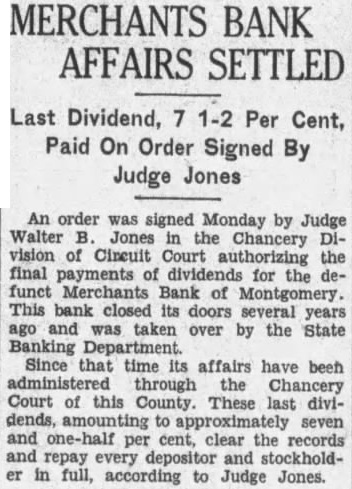 MERCHANTS BANK AFFAIRS SETTLED Last Dividend, 7 1-2 Per Cent, Paid On Order Signed By Judge Jones An order was signed Monday by Judge Walter B. Jones in the Chancery DIvision of Circuit Court authorizing the final payments of dividends for the defunct Merchants Bank of Montgomery. This bank closed its doors several years ago and was taken over by the State Banking Department. Since that time its affairs have beeh administered through the Chancery Court of this County. These last dividends, amounting to approximately seven and one-half per cent, clear the records and repay every depositor and stockholder in full, according to Judge Jones.