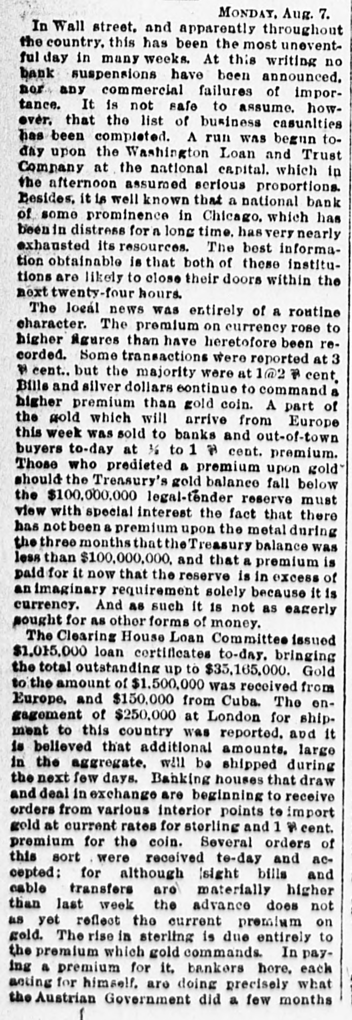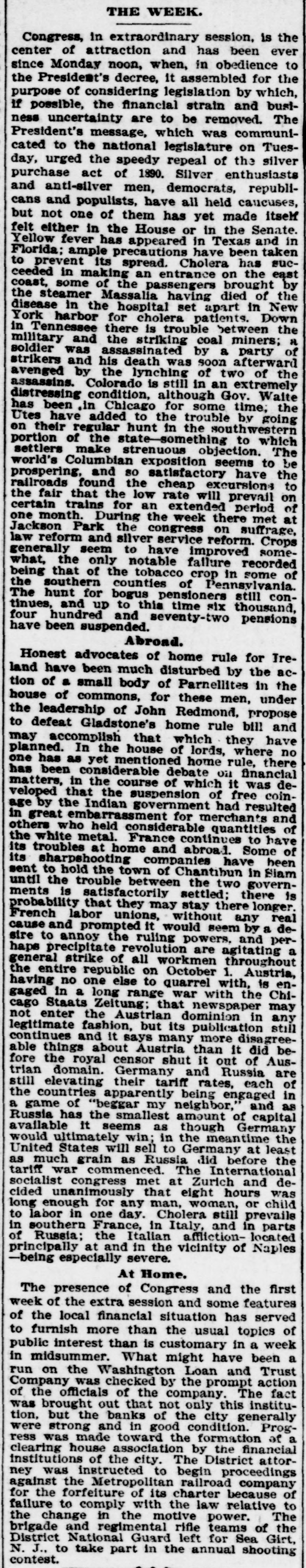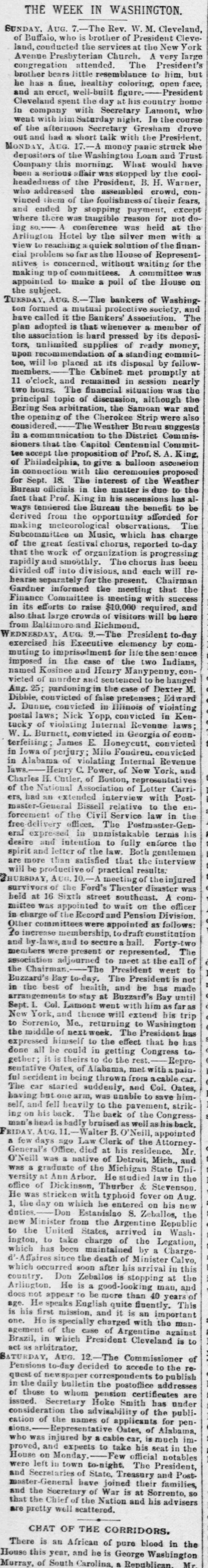 THE WEEK IN WASHINGTON. SUNDAY. AUG. 7.-The Rev. W. M. Cleveland, of Buffalo, who is brother of President Cleveland, conducted the services at the New York Avenue Presbyterian Church. A very large congregation attended. The President's brother bears little resemblance to him, but he has a fine, healthy coloring, open face, and an erect, well-built figure.- President Cleveland spent the day at his country home in company with Secretary Lamont, who went with him Saturday night. In the course of the afternoon Secretary Gresham drove out and had a short talk with the President. MONDAY, AUG. 17.-A money panie struck the depositors of the Washington Loan and Trust Company this morning. What would have been a serious affair was stopped by the coolheadedness of the President, B. H. Warner, who addressed the assembled erowd, convinced them of the foolishness of their fears, and ended by stopping payment, except where there was tangible reason for not doing 80.- A conference was held at the Arlington Hotel by the silver men with a view to reaching quick solution of the financial problem so far as the House of Representatives is concerned, without waiting for the making up of committees. A committee was appointed to make a poll of the House on the subject. TUESDAY, AUG. 8.-The bankers of Washington formed a mutual protecti society, and have called it the Bankers' Association. The plan adopted is that whenever a member of the association is bard pressed by its depositors, unlimited supplies of ready money, upon recommendation of a standing committee, will be placed at its disposal by fellowmembers. The Cabinet met promptly at 11 o'clock, and remained in session nearly two hours. The financial situation was the principal topic of discussion, although the Bering Sea arbitration, the Samoan war and the opening of the Cherokee Strip were also considered. Weather Bureau suggests in a communication to the District Commissioners that the Capitol Centennial Committee accept the proposition of Prof. S.A. King, of Philadelphia, to give a balloon ascension in connection with the ceremonies proposed for Sept. 18. The interest of the Weather Bureau officials in the matter is due to the fact that Prof. King in his ascensions has always tendered the Bureau the benefit to be derived from the opportunity afforded for making meteorological observations. The Subcommittee on Music, which has charge of the great festival chorus, reported to-day that the work of organization is progressing rapidly and smoothly. The chorus has been divided off into divisions, and each will rehearse separately for the present. Chairman Gardner informed the meeting that the Finance Committee is meeting with success in its efforts to raise $10,000 required, and also that large crowds of visitors will be here from Baltimore/and Richmond. Wednesday, AUG. 9.-The President to-day exercised his Executive elemency by commuting to imprisodment for life the imposed in the case of the two Indians, named Kosinee and Henry Manypenny, convicted of murder and sentenced to be banged Aug. 25; pardoning in the case of Dexter M. Dibble, convicted of false pretenses: Edward J. Dunne, convicted in Illinois of violating postal laws; Nick Yopp, convicted in Kentucky of violating Internal Revenue laws; W.L. Burnett, convicted in Georgia of counterfeiting James E. Honeycutt, convicted in Iowa of perjury; Milo Fondreu. convicted in Alabama of violating Internal Revenue laws. Henry C. Power, of New York, and Charles H. Cutler, of Boston, representati of the National Association of Letter Carriers, had an extended interview with Postmaster-General Bissell relative to the enforcement of the Civil Service law in the free delivery offices. The Postmaster-General expressed in unmistakable terms his desire and intention to fully enforce the spirit and letter of the law. Both gentlemen are more than satisfied that the interview will be productive of practical results: THURSDAY, AUG. 10.-A meeting of theinjured survivors of the Ford's Theater disaster was held at 16 Sixth street southeast. A committee was appointed to wait on the officer in charge of the Record and Pension Division. Other committees were appointed as follows: 10 increase membership. draft constitution and by laws, and to secure: ball. Forty-two members were present or represented. The association adjourned to meet at the call of the Chairman.-The President went to Buzzard's Bay to-day. The President is not in the best of health, and he has made arrangements to stay at Buzzard's Bay until Sept. 1. Col. Lamont went with him as far as New York, and thenee will extend his trip to Sorrento, Me., returning to Washington the middle of next week. The President has expressed himself to the effect that be has done all be could in getting Congress to. gether; it is theirs to do the rest. Representative Oates, of Alabama, met with a painful secident in being thrown from acable car. The car started suddenly, and Col. Oates, having but one arm, was unable to save himself, and fell heavily to the pavement, striking on his back. The back of the Congressman' head is badly bruised as well Friday, AUG. B. Neill, appointed a few days ago Law Clerk of the Attorney. General's Office. died at his residence. Mr. O'Neill was a native of Detroit, Mich., and WH8 a graduate of the Michigan State University at Ann Arbor. He studied law in the office of Dickinson, Thurber & Stevenson He was stricken with typhoid fever on Aug. 1, the day on which he entered on bis new duties Don Estanislao S. Zeballos, the new Minister from the Argentine Republic to the United States, arrived in Washington, to take charge of the Legation, which has been maintained by a Charge d' Affaires since the death of Minister Calvo, which occurred soon after his arrival in this country. Don Zeballos is stopping at the Arlington. He is a good-looking man, and does not appear to be more than 40 years of age. He speaks English quite fluently. This 18 his first mission