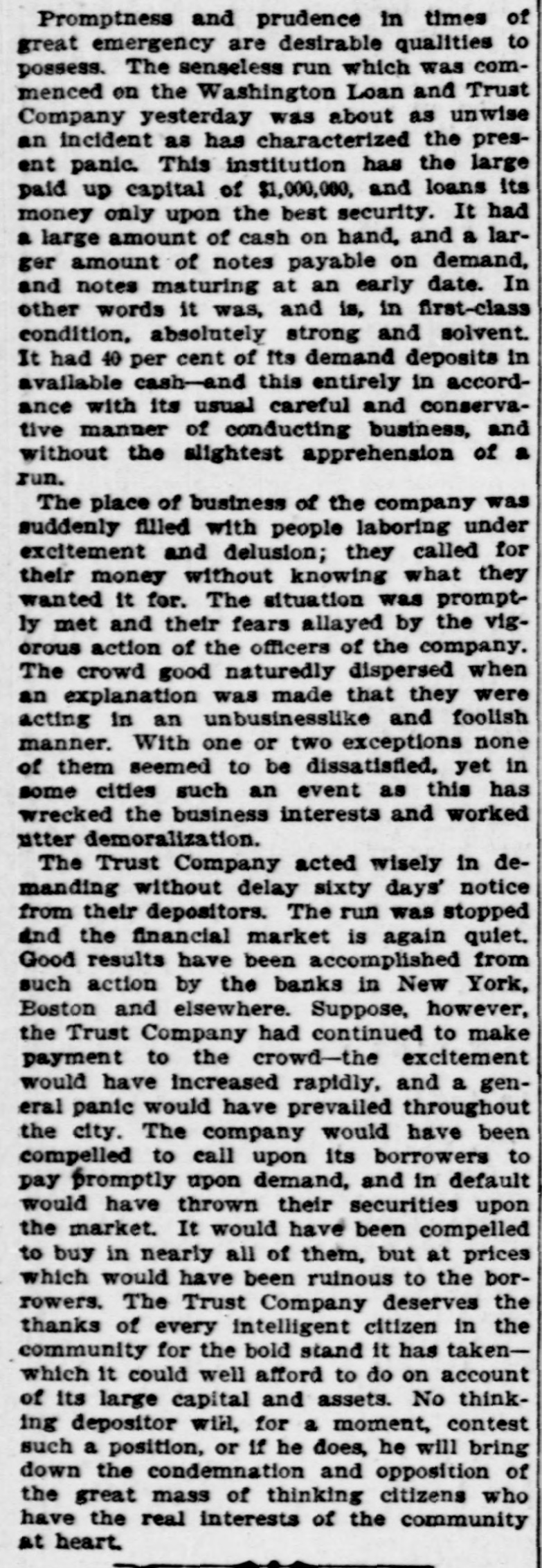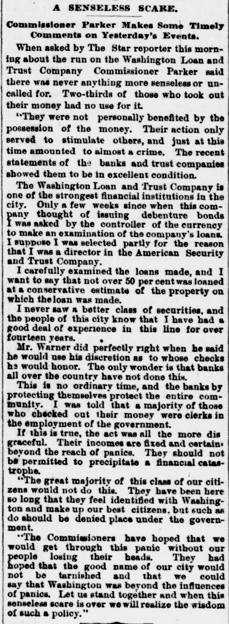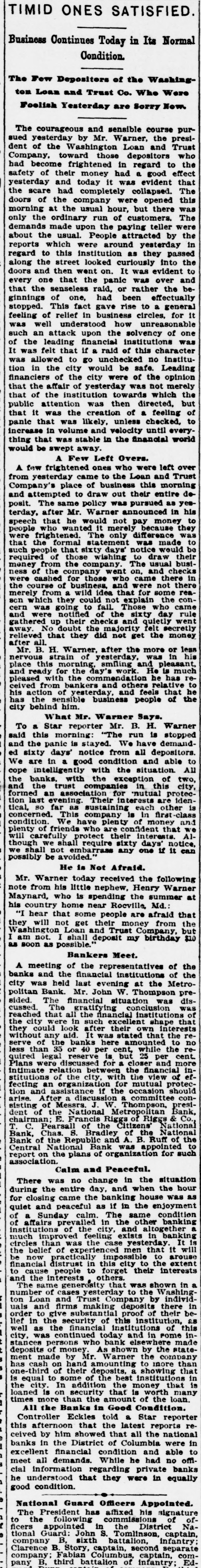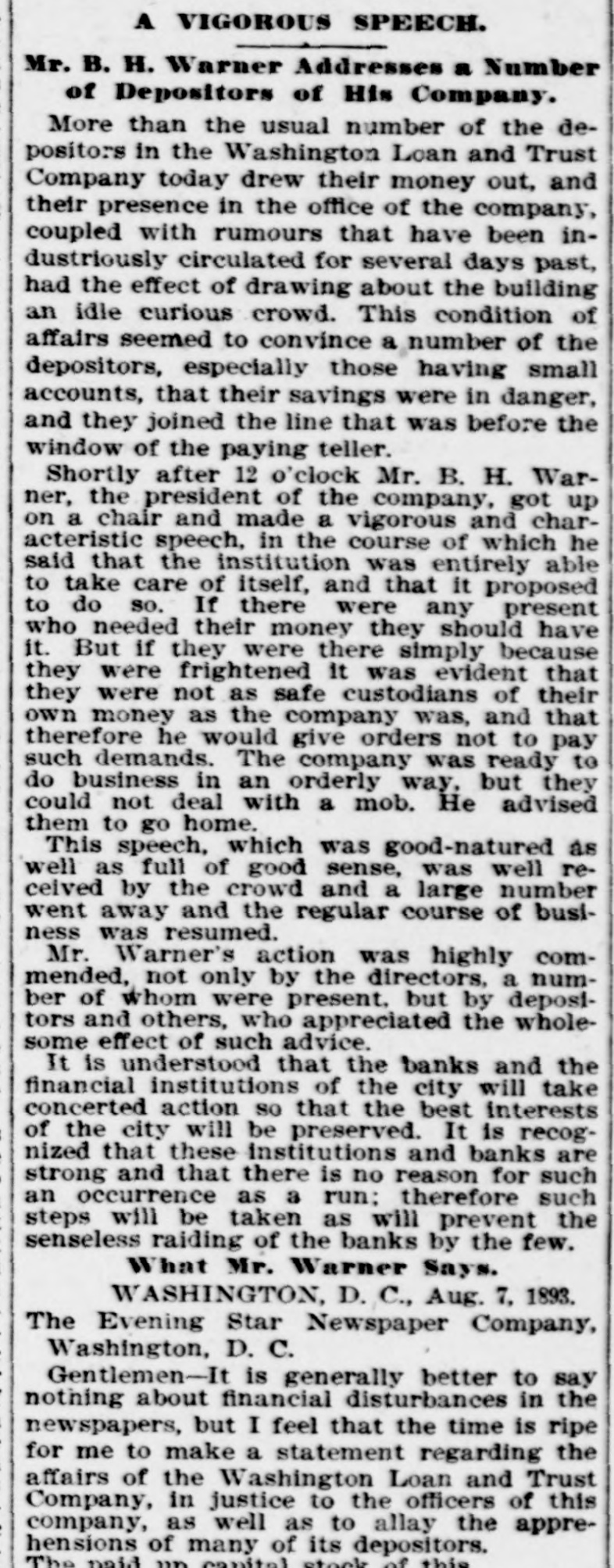THE WEEK IN WASHINGTON. SUNDAY. AUG. 7.-The Rev. W. M. Cleveland, of Buffalo, who is brother of President Cleveland, conducted the services at the New York Avenue Presbyterian Church. A very large congregation attended. The President's brother bears little resemblance to him, but he has a fine, healthy coloring, open face, and an erect, well-built figure.- President Cleveland spent the day at his country home in company with Secretary Lamont, who went with him Saturday night. In the course of the afternoon Secretary Gresham drove out and had a short talk with the President. MONDAY, AUG. 17.-A money panie struck the depositors of the Washington Loan and Trust Company this morning. What would have been a serious affair was stopped by the coolheadedness of the President, B. H. Warner, who addressed the assembled erowd, convinced them of the foolishness of their fears, and ended by stopping payment, except where there was tangible reason for not doing 80.- A conference was held at the Arlington Hotel by the silver men with a view to reaching quick solution of the financial problem so far as the House of Representatives is concerned, without waiting for the making up of committees. A committee was appointed to make a poll of the House on the subject. TUESDAY, AUG. 8.-The bankers of Washington formed a mutual protecti society, and have called it the Bankers' Association. The plan adopted is that whenever a member of the association is bard pressed by its depositors, unlimited supplies of ready money, upon recommendation of a standing committee, will be placed at its disposal by fellowmembers. The Cabinet met promptly at 11 o'clock, and remained in session nearly two hours. The financial situation was the principal topic of discussion, although the Bering Sea arbitration, the Samoan war and the opening of the Cherokee Strip were also considered. Weather Bureau suggests in a communication to the District Commissioners that the Capitol Centennial Committee accept the proposition of Prof. S.A. King, of Philadelphia, to give a balloon ascension in connection with the ceremonies proposed for Sept. 18. The interest of the Weather Bureau officials in the matter is due to the fact that Prof. King in his ascensions has always tendered the Bureau the benefit to be derived from the opportunity afforded for making meteorological observations. The Subcommittee on Music, which has charge of the great festival chorus, reported to-day that the work of organization is progressing rapidly and smoothly. The chorus has been divided off into divisions, and each will rehearse separately for the present. Chairman Gardner informed the meeting that the Finance Committee is meeting with success in its efforts to raise $10,000 required, and also that large crowds of visitors will be here from Baltimore/and Richmond. Wednesday, AUG. 9.-The President to-day exercised his Executive elemency by commuting to imprisodment for life the imposed in the case of the two Indians, named Kosinee and Henry Manypenny, convicted of murder and sentenced to be banged Aug. 25; pardoning in the case of Dexter M. Dibble, convicted of false pretenses: Edward J. Dunne, convicted in Illinois of violating postal laws; Nick Yopp, convicted in Kentucky of violating Internal Revenue laws; W.L. Burnett, convicted in Georgia of counterfeiting James E. Honeycutt, convicted in Iowa of perjury; Milo Fondreu. convicted in Alabama of violating Internal Revenue laws. Henry C. Power, of New York, and Charles H. Cutler, of Boston, representati of the National Association of Letter Carriers, had an extended interview with Postmaster-General Bissell relative to the enforcement of the Civil Service law in the free delivery offices. The Postmaster-General expressed in unmistakable terms his desire and intention to fully enforce the spirit and letter of the law. Both gentlemen are more than satisfied that the interview will be productive of practical results: THURSDAY, AUG. 10.-A meeting of theinjured survivors of the Ford's Theater disaster was held at 16 Sixth street southeast. A committee was appointed to wait on the officer in charge of the Record and Pension Division. Other committees were appointed as follows: 10 increase membership. draft constitution and by laws, and to secure: ball. Forty-two members were present or represented. The association adjourned to meet at the call of the Chairman.-The President went to Buzzard's Bay to-day. The President is not in the best of health, and he has made arrangements to stay at Buzzard's Bay until Sept. 1. Col. Lamont went with him as far as New York, and thenee will extend his trip to Sorrento, Me., returning to Washington the middle of next week. The President has expressed himself to the effect that be has done all be could in getting Congress to. gether; it is theirs to do the rest. Representative Oates, of Alabama, met with a painful secident in being thrown from acable car. The car started suddenly, and Col. Oates, having but one arm, was unable to save himself, and fell heavily to the pavement, striking on his back. The back of the Congressman' head is badly bruised as well Friday, AUG. B. Neill, appointed a few days ago Law Clerk of the Attorney. General's Office. died at his residence. Mr. O'Neill was a native of Detroit, Mich., and WH8 a graduate of the Michigan State University at Ann Arbor. He studied law in the office of Dickinson, Thurber & Stevenson He was stricken with typhoid fever on Aug. 1, the day on which he entered on bis new duties Don Estanislao S. Zeballos, the new Minister from the Argentine Republic to the United States, arrived in Washington, to take charge of the Legation, which has been maintained by a Charge d' Affaires since the death of Minister Calvo, which occurred soon after his arrival in this country. Don Zeballos is stopping at the Arlington. He is a good-looking man, and does not appear to be more than 40 years of age. He speaks English quite fluently. This 18 his first mission