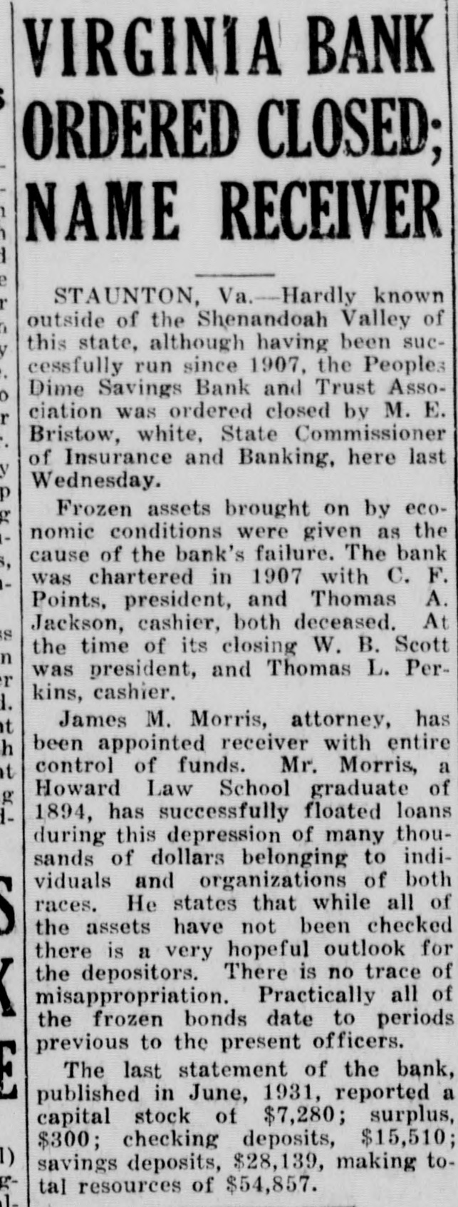 VIRGINIA BANK ORDERED CLOSED; NAME RECEIVER STAUNTON, Va.-Hardly known outside of the Shenandoah Valley of this state, although having been successfully run since 1907, the Peoples Dime Savings Bank and Trust Association was ordered closed by M. E. Bristow, white, State Commissioner of Insurance and Banking, here last Wednesday. Frozen assets brought on by economic conditions were given as the cause of the bank's failure. The bank was chartered in 1907 with C. F. Points, president, and Thomas A. Jackson, cashier, both deceased. At the time of its closing W. B. Scott was president, and Thomas L. Perkins, cashier. James M. Morris, attorney, has been appointed receiver with entire control of funds. Mr. Morris, a Howard Law School graduate of 1894, has successfully floated loans during this depression of many thousands of dollars belonging to individuals and organizations of both races. He states that while all of the assets have not been checked there is a very hopeful outlook for the depositors. There is no trace of misappropriation. Practically all of the frozen bonds date to periods previous to the present officers. The last statement of the bank, published in June, 1931, reported a capital stock of $7,280; surplus, $300; checking deposits, $15,510; savings deposits, $28,139, making total resources of $54,857.