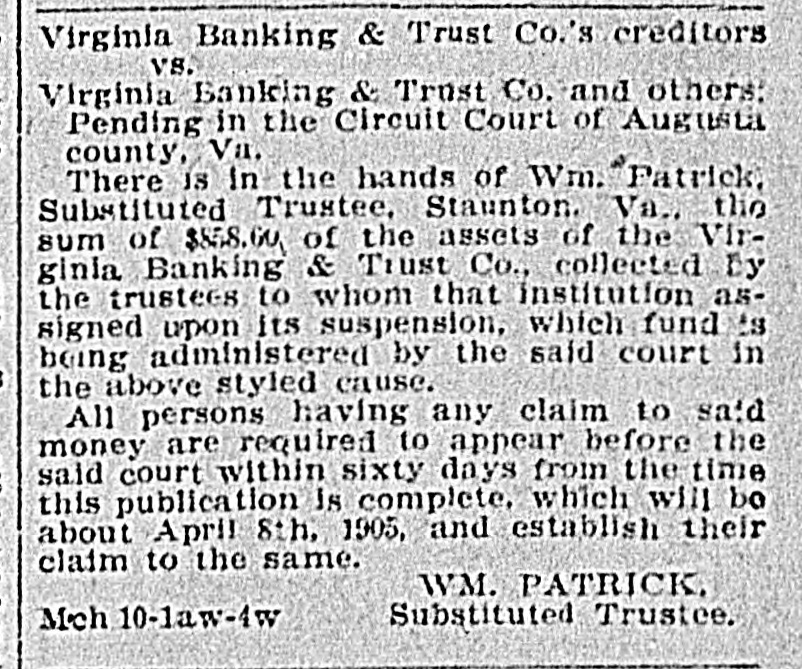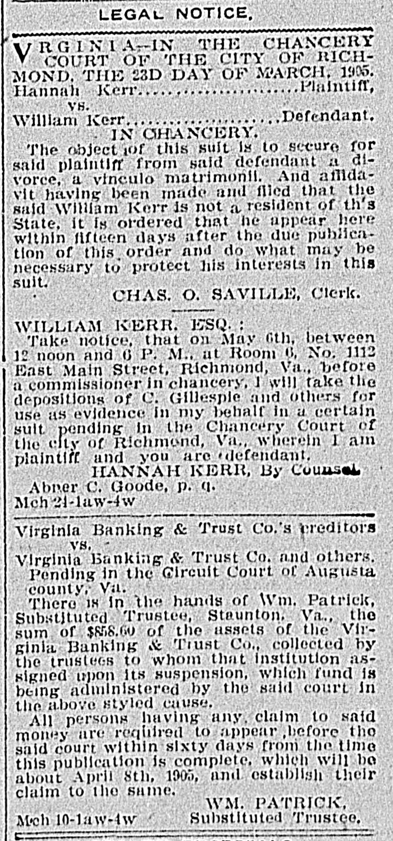 LEGAL NOTICE, RGINIA-IN THE CHANCERY V COURT OF THE CITY OF RICHMOND. THE 23D DAY OF MARCH, 1905. Plaintiff, Hannah Kerr VS. Defendant. William Kerr IN CHANCERY. The object of this suit is to secure for said plaintiff from said defendant a divorce, a vinculo matrimonii. And affidavit having been made and filed that the said William Kerr is not a resident of th's State, it is ordered that he appear here within fifteen days after the due publication of this order and do what may be necessary to protect his interests in this suit. CHAS. O. SAVILLE, Clerk. WILLIAM KERR. ESQ. : Take notice, that on May 6th, between 12 noon and 6 P. M.. at Room 6, No. 1112 East Main Street, Richmond, Va., before a commissioner in chancery, 1 will take the depositions of C. Gillesple and others for use as evidence in my behalf in a certain suit pending in the Chancery Court of the city of Richmond, Va., wherein I am plaintiff and you are defendant. HANNAH KERR, By Counsel Abner C. Goode, p. q. Mch 21-law-4w Virginia Banking & Trust Co.'s creditors VS. Virginia Banking & Trust Co. and others. Pending in the Circuit Court of Augusta county, Va. There 18 in the hands of Wm. Patrick, Substituted Trustee, Staunton, Va., the sum of $858.60 of the assets of the Virginia Banking & Trust Co., collected by the trustees to whom that institution assigned upon its suspension, which fund is being administered by the said court in the above styled cause. All persons having any claim to said money are required to appear before the said court within sixty days from the time this publication is complete. which will be about April 8th, 1905, and establish their claim to the same. WM. PATRICK, Substituted Trustee. Meh 10-1aw-4w