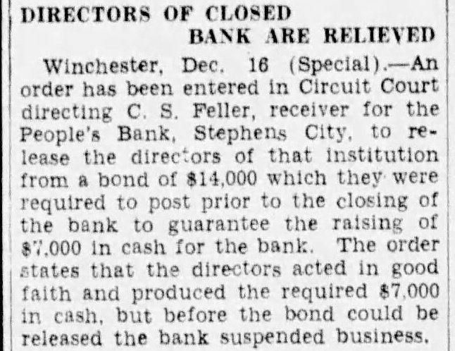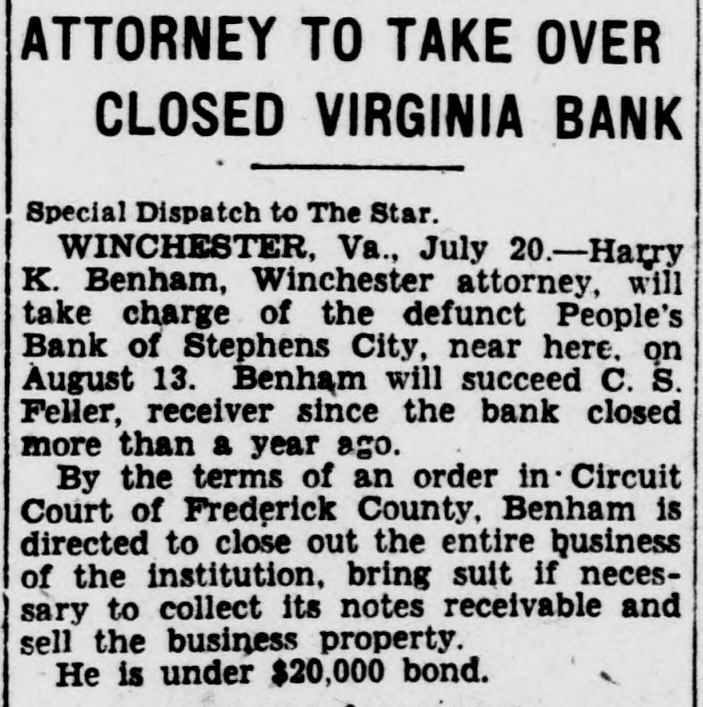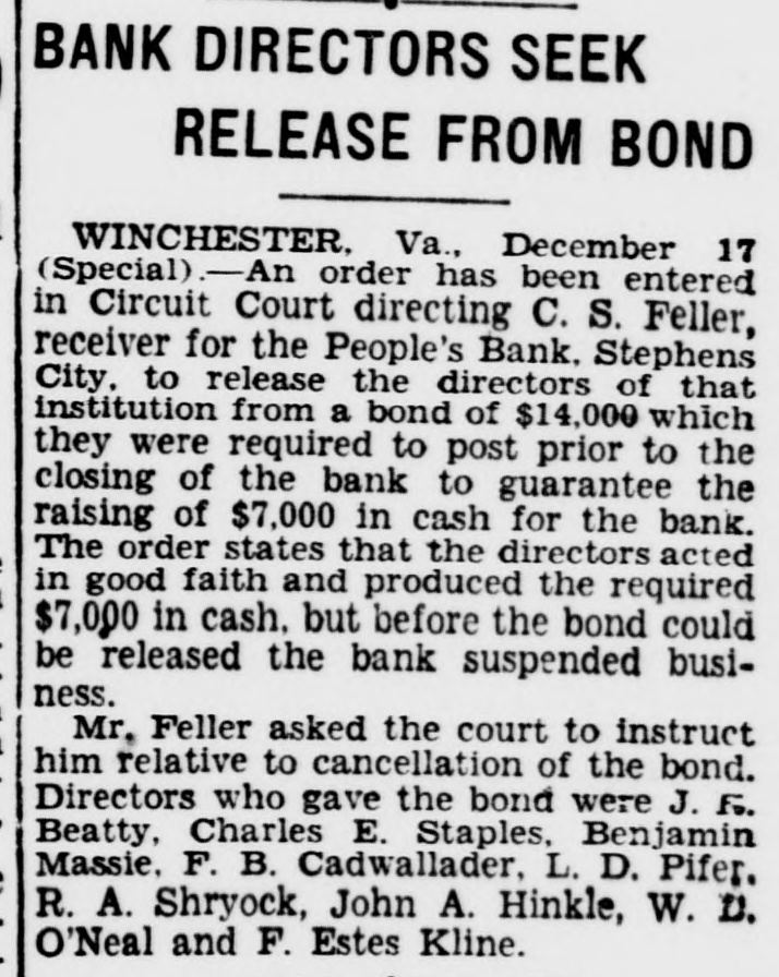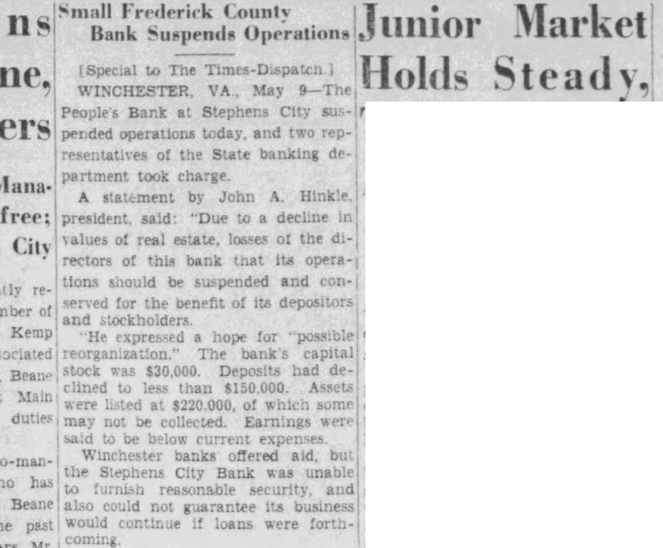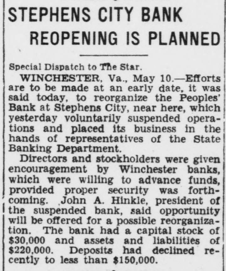 STEPHENS CITY BANK REOPENING IS PLANNED Special Dispatch to The Star. WINCHESTER, Va., May 10.-Efforts are to be made at an early date, it was said today, to reorganize the Peoples' Bank at Stephens City, near here, which yesterday voluntarily suspended operations and placed its business in the hands of representatives of the State Banking Department. Directors and stockholders were given encouragement by Winchester banks, which were willing to advance funds, provided proper security was forthcoming. John A. Hinkle, president of the suspended bank, said opportunity will be offered for a possible reorganization. The bank had a capital stock of $30,000 and assets and liabilities of $220,000. Deposits had declined recently to less than $150,000.