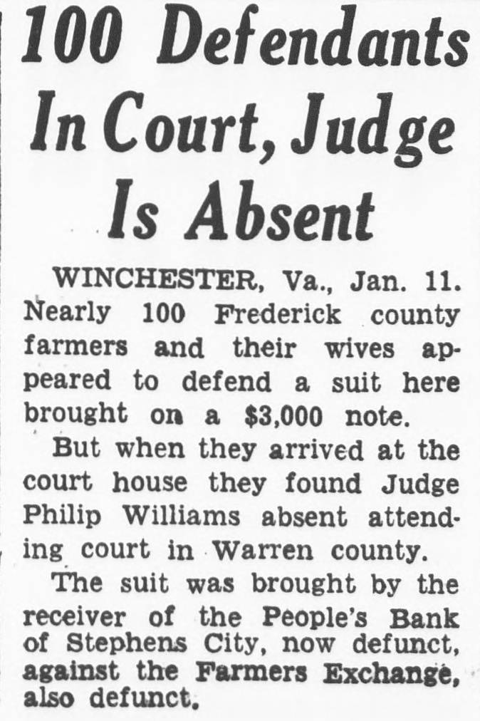 100 Defendants In Court, Judge Is Absent WINCHESTER, Va., Jan. 11. Nearly 100 Frederick county farmers and their wives appeared to defend a suit here brought on a $3,000 note. But when they arrived at the court house they found Judge Philip Williams absent attending court in Warren county. The suit was brought by the receiver of the People's Bank of Stephens City, now defunct, against the Farmers Exchange, also defunct.