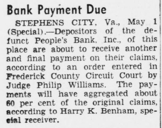 Bank Payment Due STEPHENS CITY, Va., May 1 (Special).-Depositors of the defunct People's Bank. Inc., of this place are about to receive another and final payment on their claims, according to an order entered in Frederick County Circuit Court by Judge Philip Williams. The payments will have aggregated about 60 per cent of the original claims, according to Harry K. Benham, special receiver.